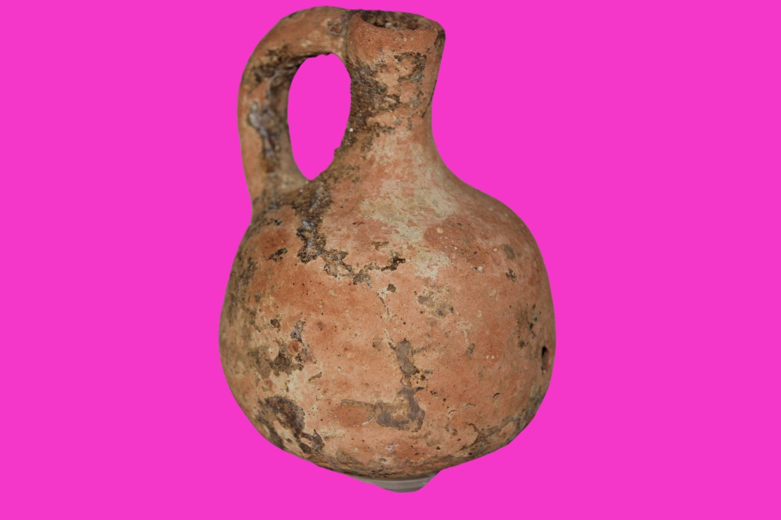 Dimensions: 3 ¾ inches tall, 3 ¼ inches wide, weighs 95 grams Provenance: Excavated in Jerusalem in the 1980’s. Acquired by the Hamadian Antiquities Gallery in The Old City of Jerusalem. Export to the United States approved by the Israeli Antiquities Authority in 2025. Acquired by The Artifact City Collection in September 2025. Description: Redware terra cotta jug. Mineral deposits indicative of approximately 3000 years of underground burial. Small rim chips and surface loss. No repairs or restorations found. Overall Outstanding condition. King David is often looked upon as the most successful military conqueror in the history of the Israelite nation. By the end of his reign in 971 BC, the boundaries of Israel and the neighboring vassal kingdoms who paid tribute to David stretched across the Fertile Crescent from the Wadi of Egypt to the River Euphrates.