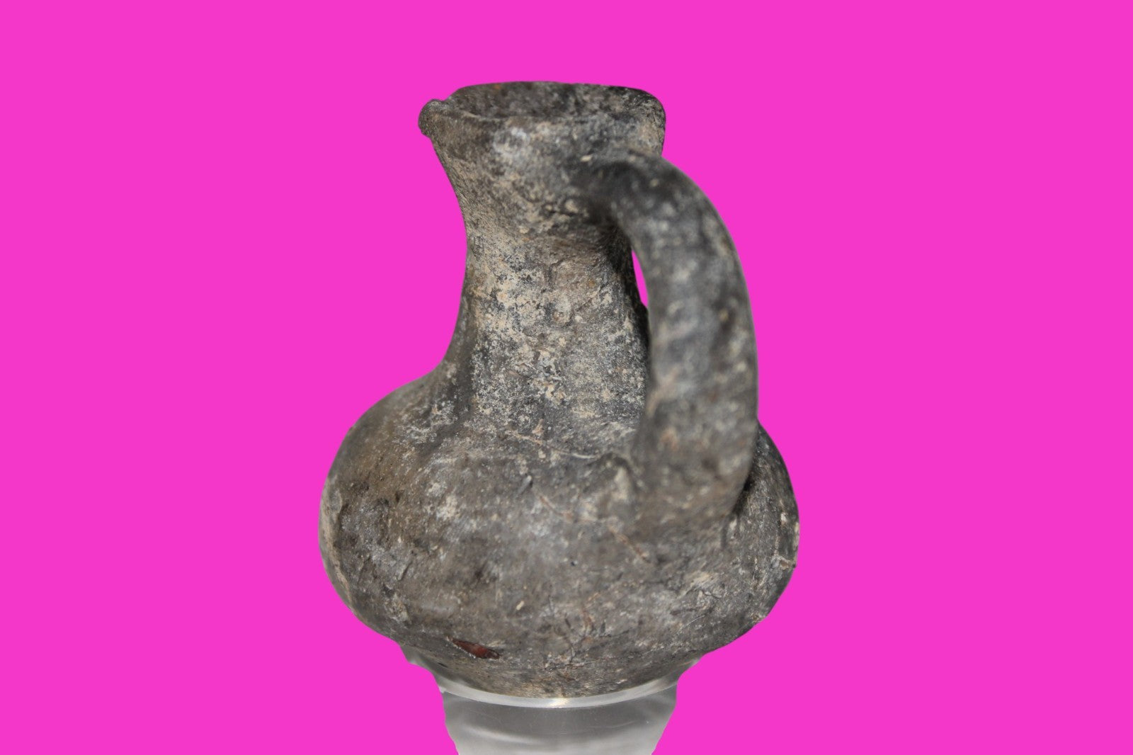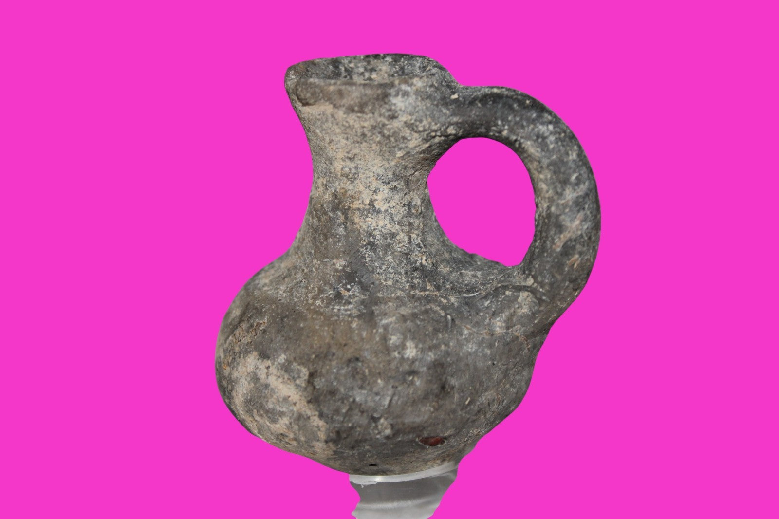 Dimensions: 2 ¼ inches tall, 2 ¼ inches wide, weighs 47 grams. Provenance: Excavated in Jerusalem in the 1980’s. Acquired by the Hamadian Antiquities Gallery in The Old City of Jerusalem. Export to the United States approved by the Israeli Antiquities Authority in 2025. Acquired by The Artifact City Collection in September 2025. Description: Blackware rounded bottom juglet. Mineral deposits indicative of approximately 3000 years of underground burial. Small rim chips and surface loss. No repairs or restorations found. Overall Excellent condition. King David is often looked upon as the most successful military conqueror in the history of the Israelite nation. By the end of his reign in 971 BC, the boundaries of Israel and the neighboring vassal kingdoms who paid tribute to David stretched across the Fertile Crescent from the Wadi of Egypt to the River Euphrates.
