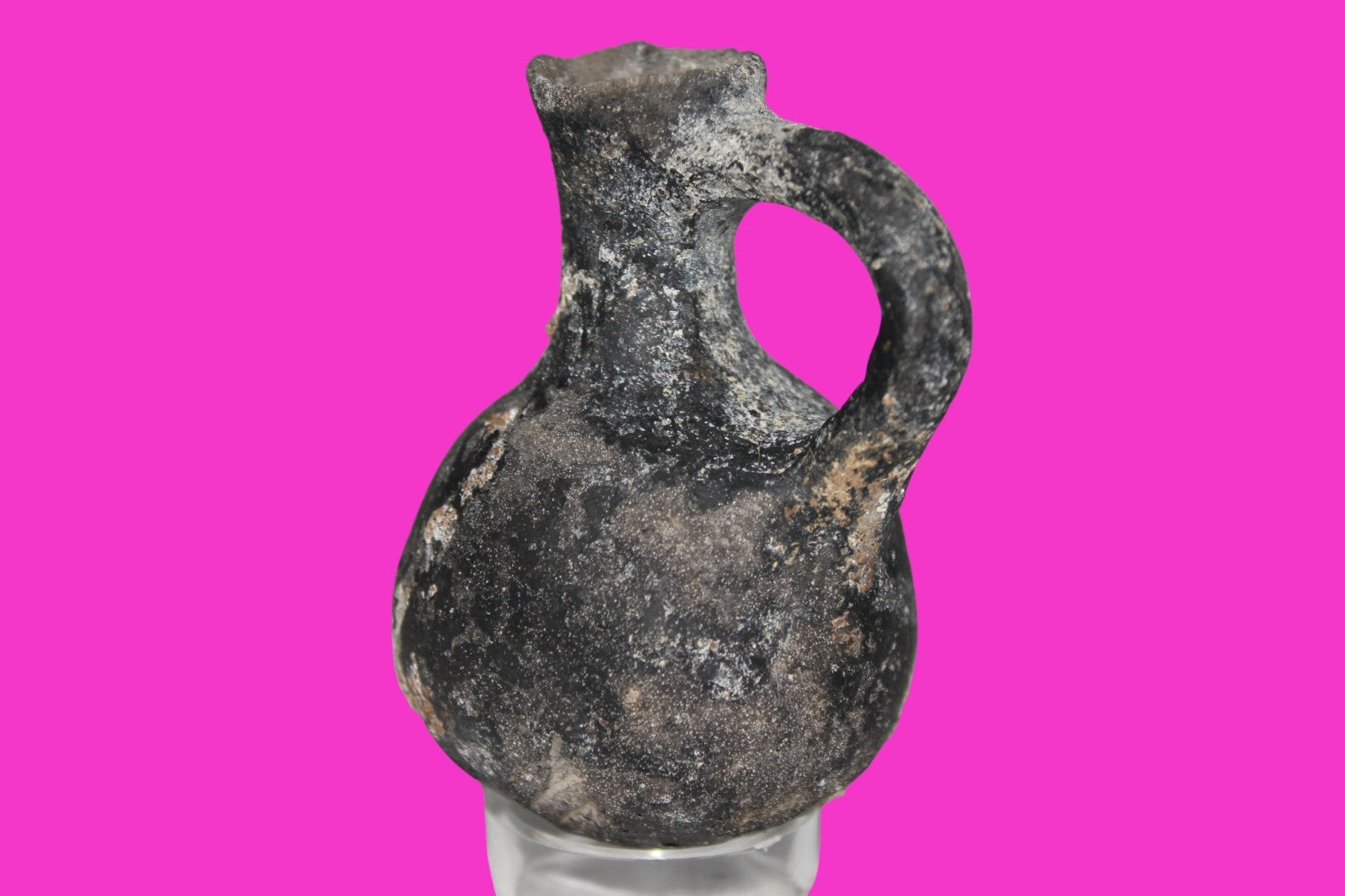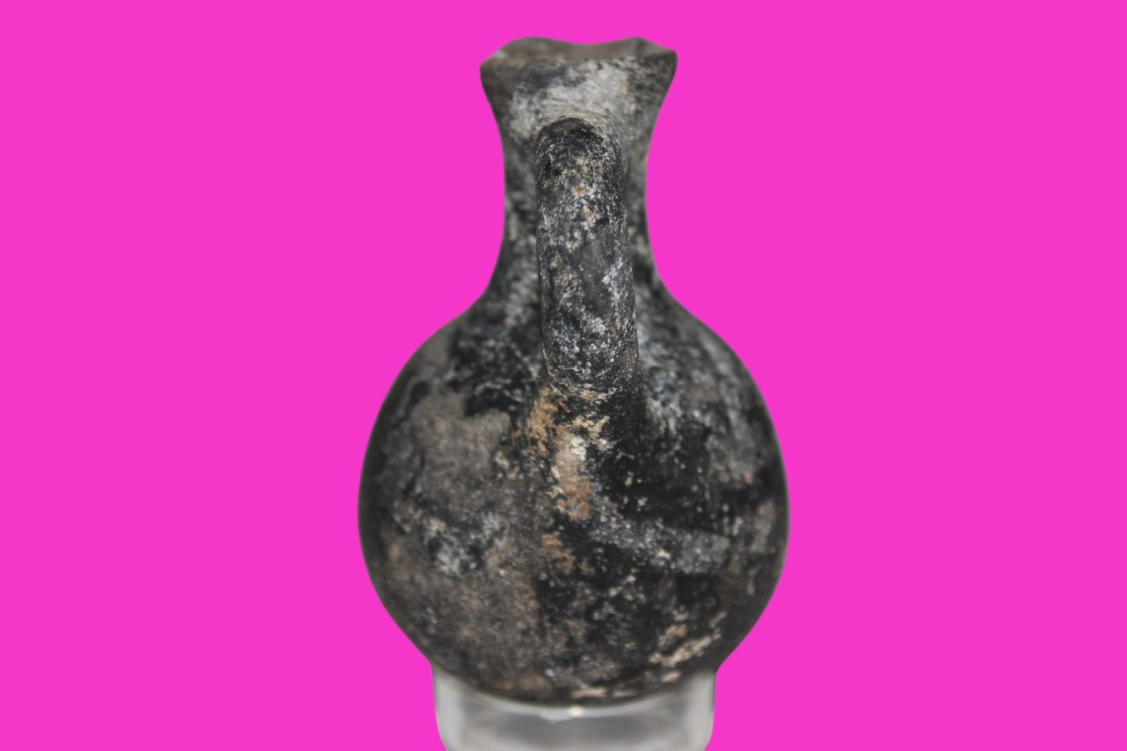 Dimensions: 2 ¾ inches tall, 2 inches wide, weighs 53 grams. Provenance: Excavated in Jerusalem in the 1980’s. Acquired by the Hamadian Antiquities Gallery in The Old City of Jerusalem. Export to the United States approved by the Israeli Antiquities Authority in 2025. Acquired by The Artifact City Collection in September 2025. Description: Blackware rounded bottom juglet. Mineral deposits indicative of approximately 3000 years of underground burial. Small rim chips and surface loss. No repairs or restorations found. Overall Excellent condition. King David is often looked upon as the most successful military conqueror in the history of the Israelite nation. By the end of his reign in 971 BC, the boundaries of Israel and the neighboring vassal kingdoms who paid tribute to David stretched across the Fertile Crescent from the Wadi of Egypt to the River Euphrates.