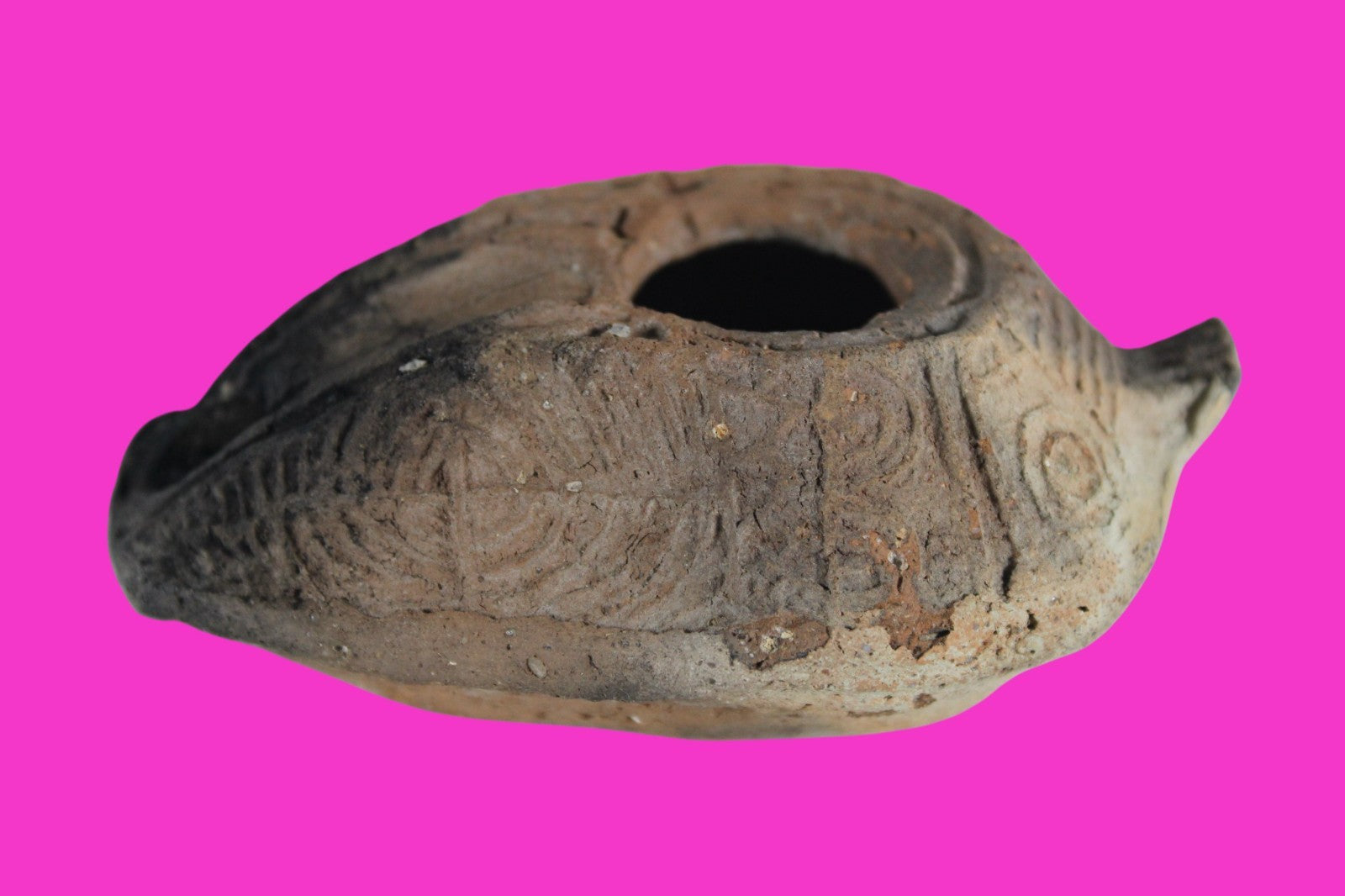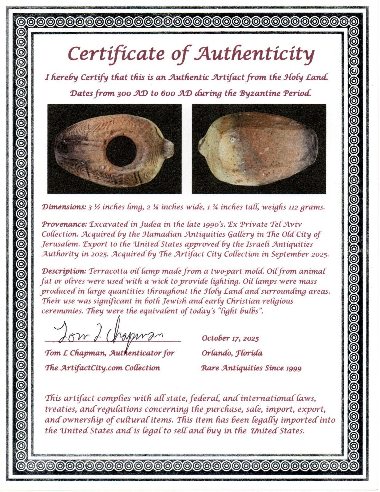 Dimensions: 3 ½ inches long, 2 ¼ inches wide, 1 ¼ inches tall, weighs 112 grams. Provenance: Excavated in Judea in the late 1990’s. Ex Private Tel Aviv Collection. Acquired by the Hamadian Antiquities Gallery in The Old City of Jerusalem. Export to the United States approved by the Israeli Antiquities Authority in 2025. Acquired by The Artifact City Collection in September 2025. Description: Terracotta oil lamp made from a two-part mold. Oil from animal fat or olives were used with a wick to provide lighting. Oil lamps were mass produced in large quantities throughout the Holy Land and surrounding areas. Their use was significant in both Jewish and early Christian religious ceremonies. They were the equivalent of today’s “light bulbs”.