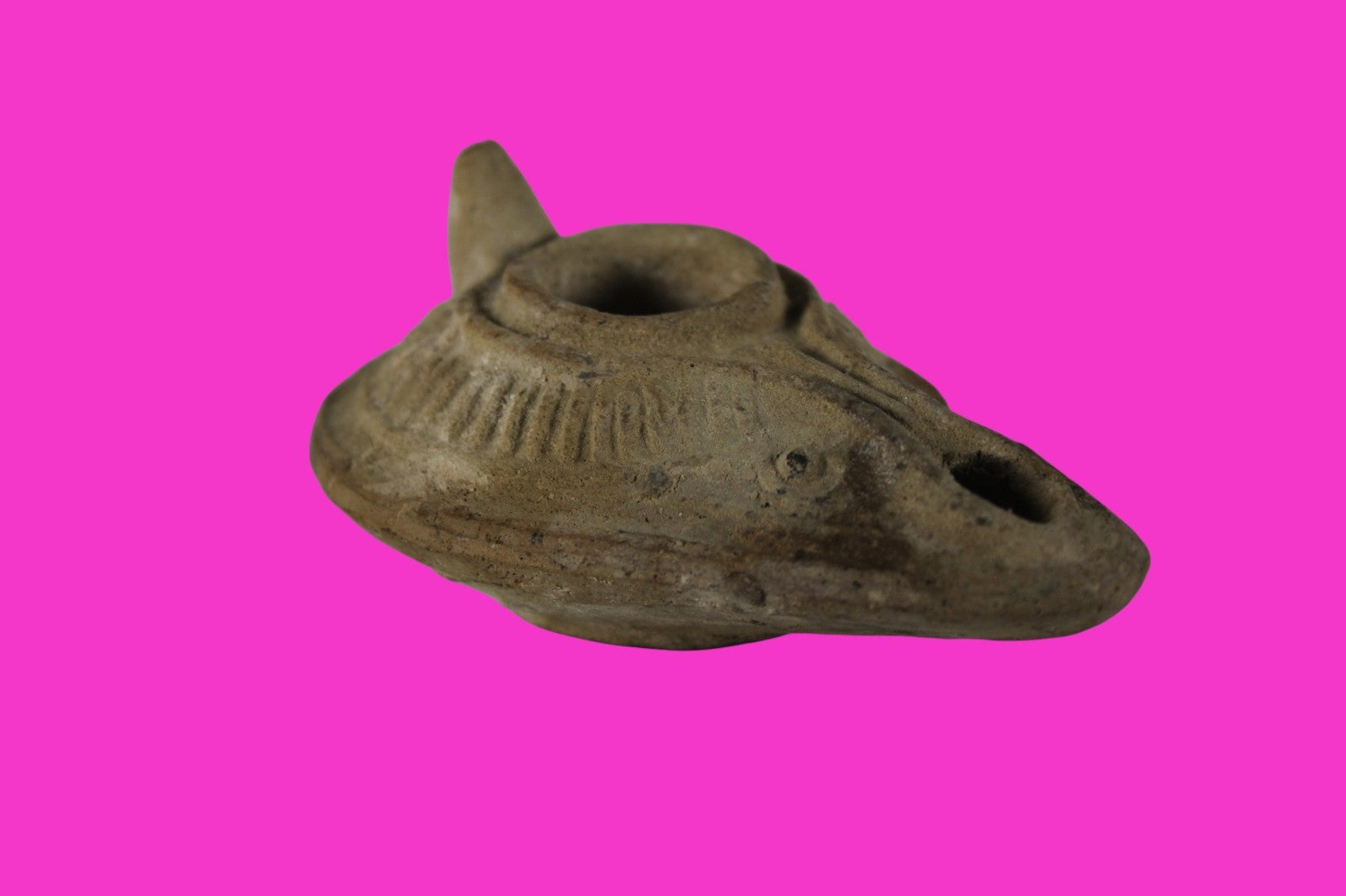 Dimensions: 3 ½ inches long, 2 ½ inches wide, 1 ¼ inches tall, weighs 73 grams. Provenance: Ex. Private Tel Aviv collection. Collected in the 1990’s. Acquired by John McIntosh, MSE, MBA, Ancient Artifacts & Treasures, Winter Park, Florida in 2022. Acquired by The Artifact City collection in 2025. Description: Redware oil lamp made from a two-part mold. Oil from animal fat or olives were used with a wick to provide lighting. Oil lamps were mass produced in large quantities throughout the Holy Land and surrounding areas. Their use was significant in both Jewish and early Christian religious ceremonies. They were the equivalent of today’s “light bulbs”.