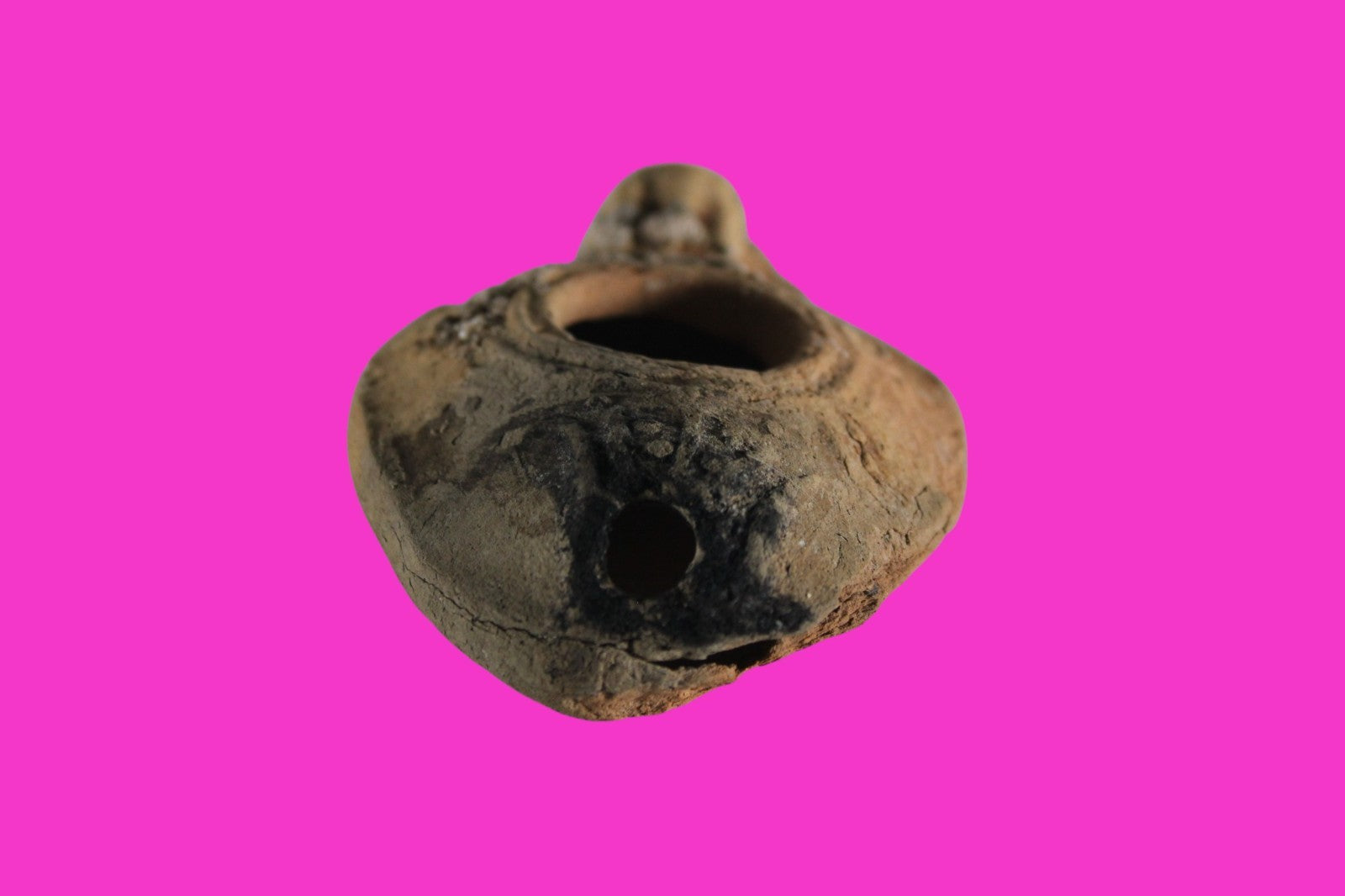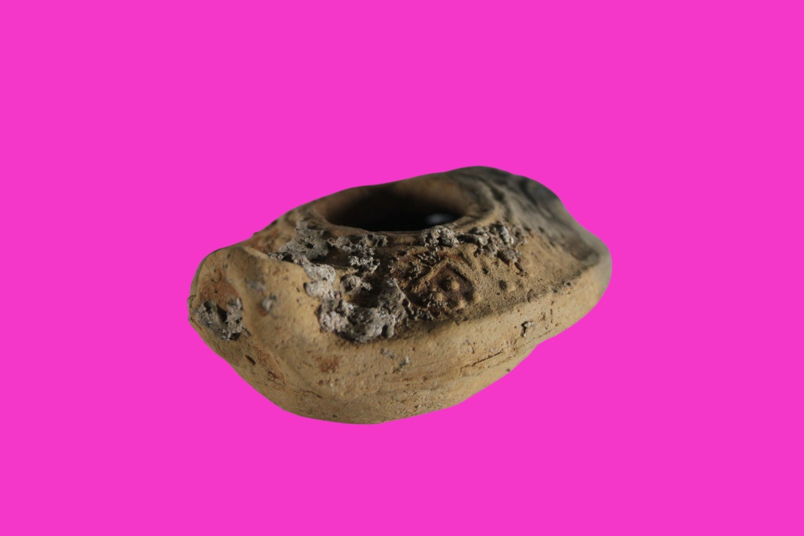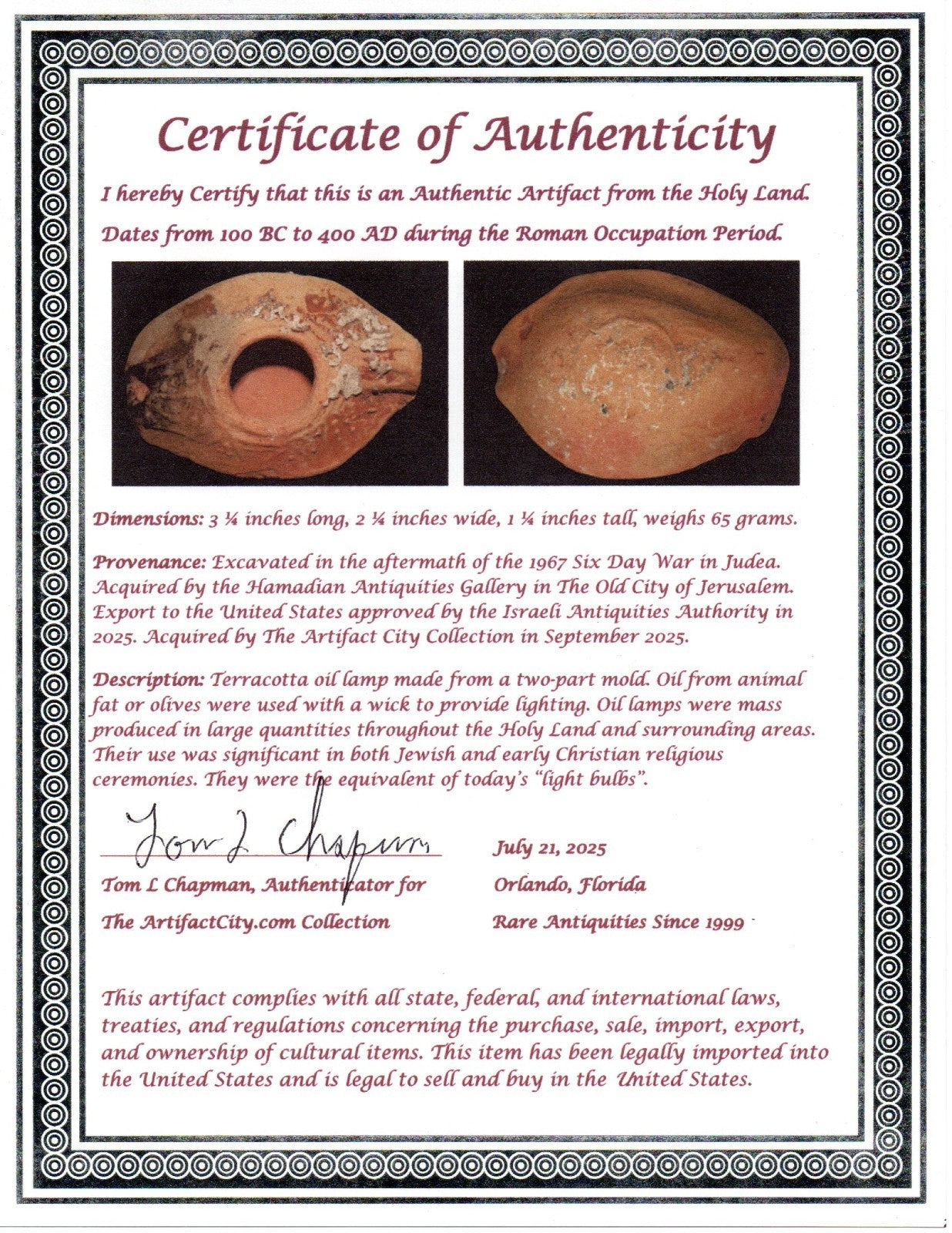 Dimensions: 3 ¼ inches long, 2 ¼ inches wide, 1 ¼ inches tall, weighs 65 grams. Provenance: Excavated in the aftermath of the 1967 Six Day War in Judea. Acquired by the Hamadian Antiquities Gallery in The Old City of Jerusalem. Export to the United States approved by the Israeli Antiquities Authority in 2025. Acquired by The Artifact City Collection in September 2025. Description: Terracotta oil lamp made from a two-part mold. Oil from animal fat or olives were used with a wick to provide lighting. Oil lamps were mass produced in large quantities throughout the Holy Land and surrounding areas. Their use was significant in both Jewish and early Christian religious ceremonies. They were the equivalent of today’s “light bulbs”.