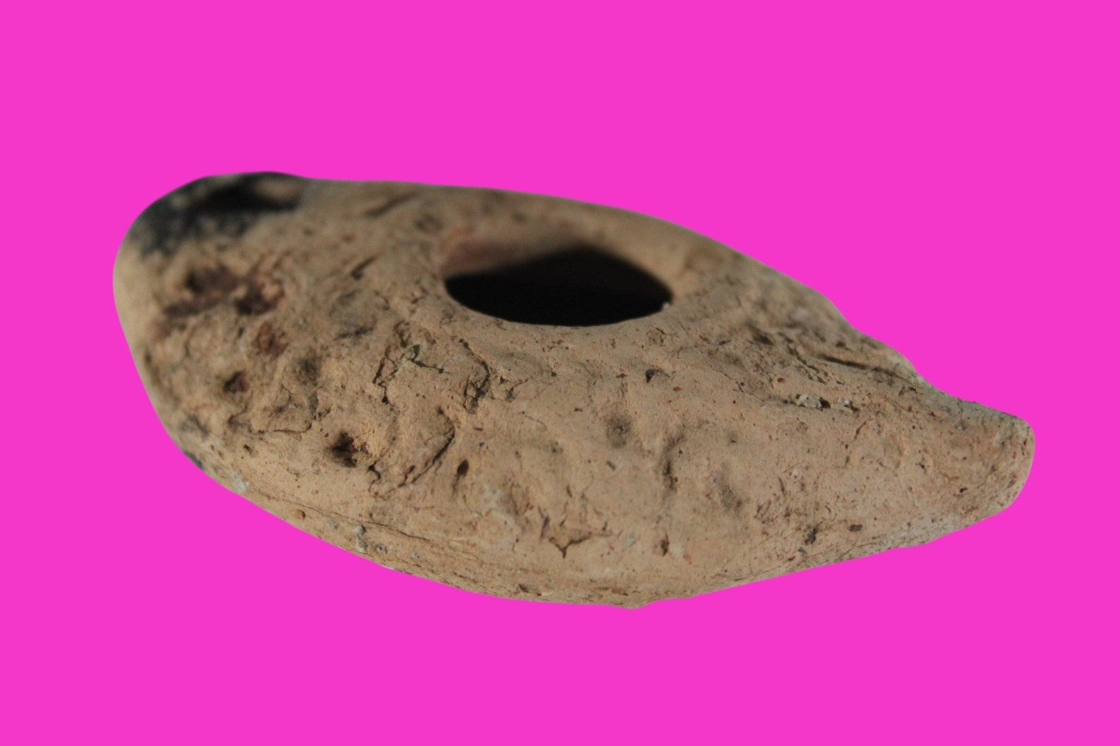Dimensions: 1 inch tall, 3 inches long, 2 inches wide, weighs 47 grams Provenance: Ex. Private Jerusalem collection, Acquired in the aftermath of the 1967 Six Day War. Acquired by John McIntosh, MSE, MBA, Ancient Artifacts & Treasures, Winter Park, Florida in 2022. Acquired by The Artifact City collection in 2025. Description: Redware oil lamp made from a two part mold. Oil from animal fat or olives were used with a wick to provide lighting. Oil lamps were mass produced in large quantities throughout the Holy Land and surrounding areas. Their use was significant in both Jewish and early Christian religious ceremonies. They were the equivalent of today’s “light bulbs”.