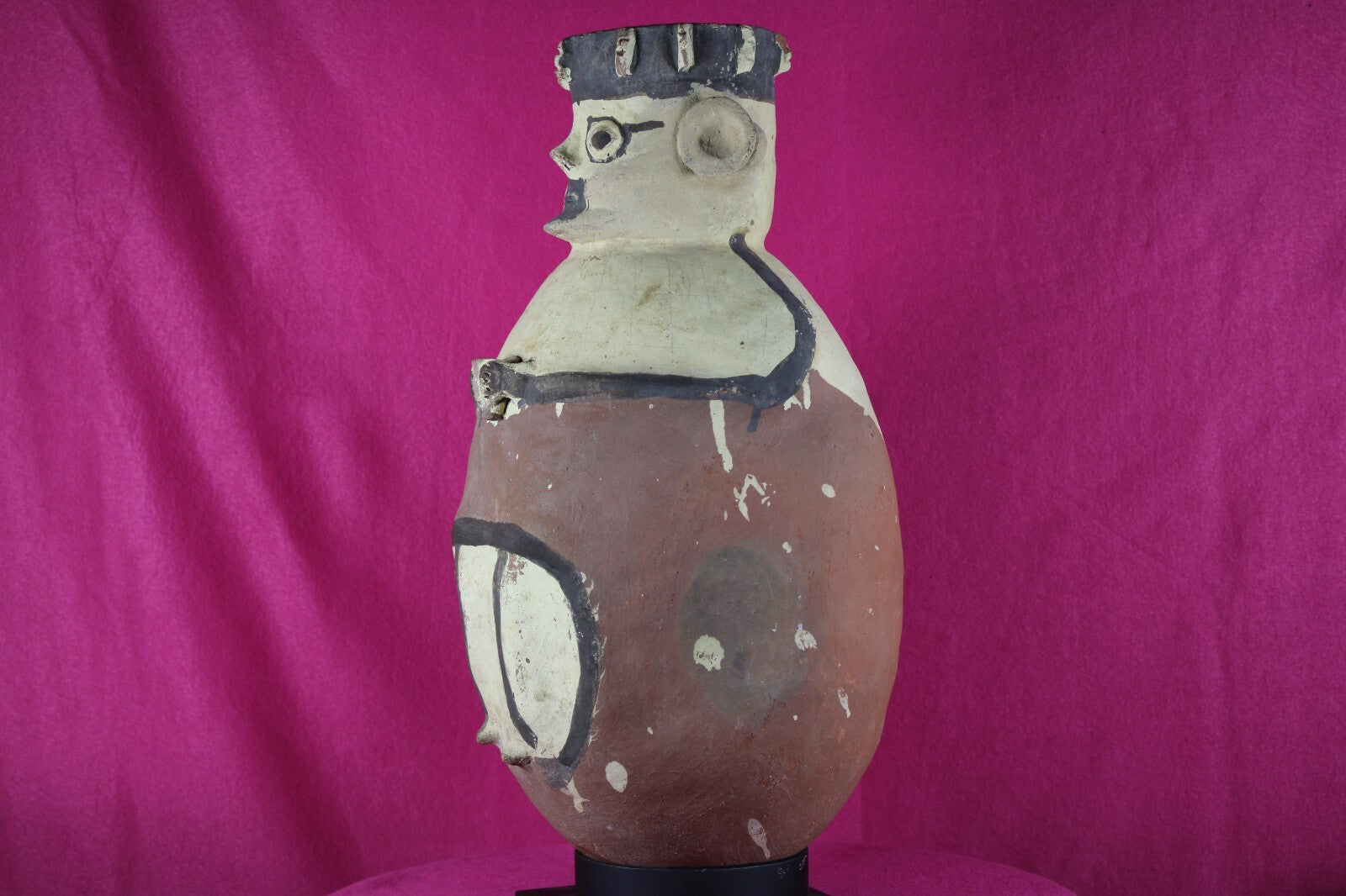 Museum quality polychrome painted pottery anthropomorphic vessel, wearing a multi lug decorated headband and large ear spools. Holding a kero with both hands. A flute hangs in the center of his back. Painted black, red-brown and white. A flake on his right ear ornament, and two very minor rim flakes, otherwise intact, excellent condition. Custom metal base. A very nice example.