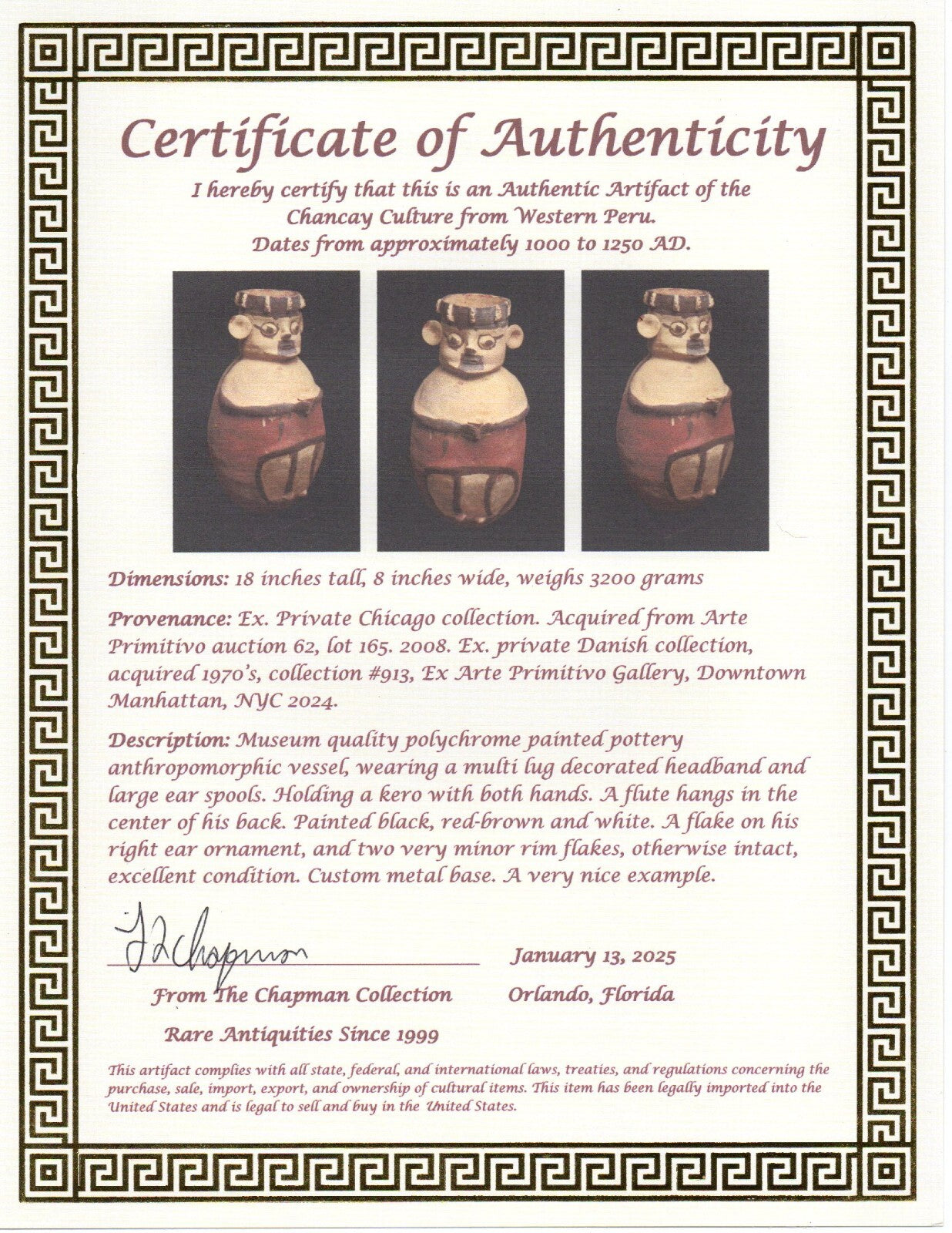 Pre Columbian Artifact Authentic 18 Inch Chancay Man Ex Arte Primitivo COA T106