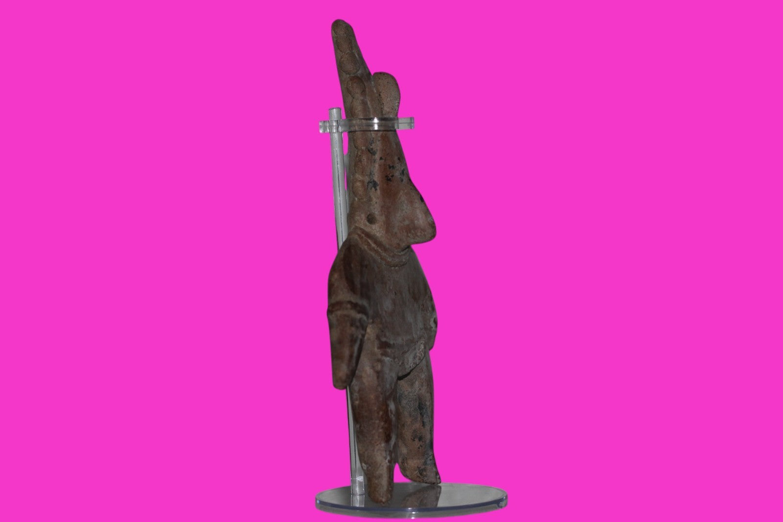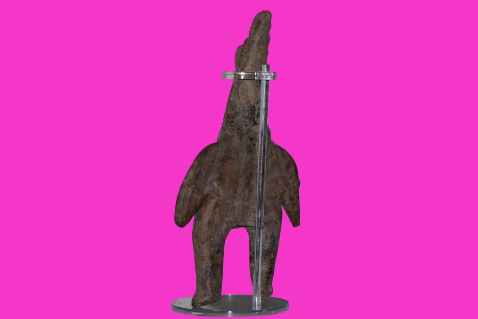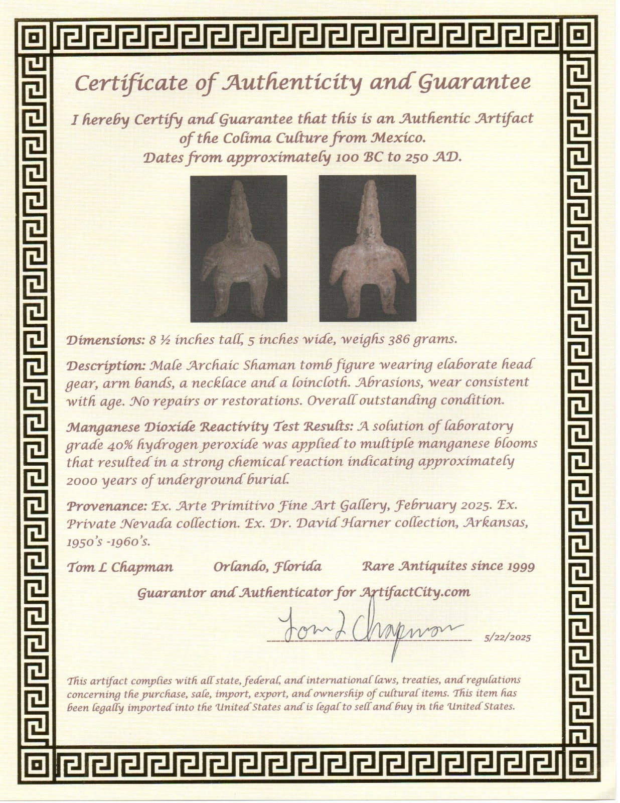 Dimensions: 8 ½ inches tall, 5 inches wide, weighs 386 grams. Description: Male Archaic Shaman tomb figure wearing elaborate head gear, arm bands, a necklace and a loincloth. Abrasions, wear consistent with age. No repairs or restorations. Overall outstanding condition. Manganese Dioxide Reactivity Test Results: A solution of laboratory grade 40% hydrogen peroxide was applied to multiple manganese blooms that resulted in a strong chemical reaction indicating approximately 2000 years of underground burial. Provenance: Ex. Arte Primitivo Fine Art Gallery, February 2025. Ex. Private Nevada collection. Ex. Dr. David Harner collection, Arkansas, 1950’s -1960’s.
