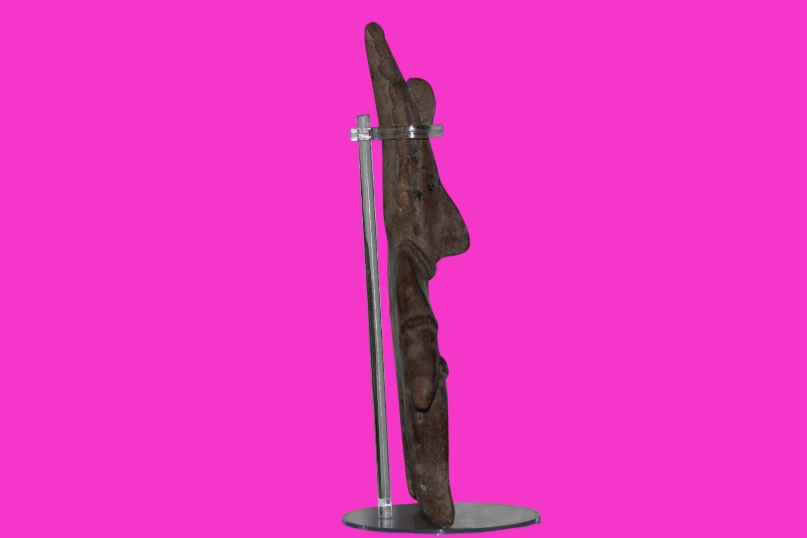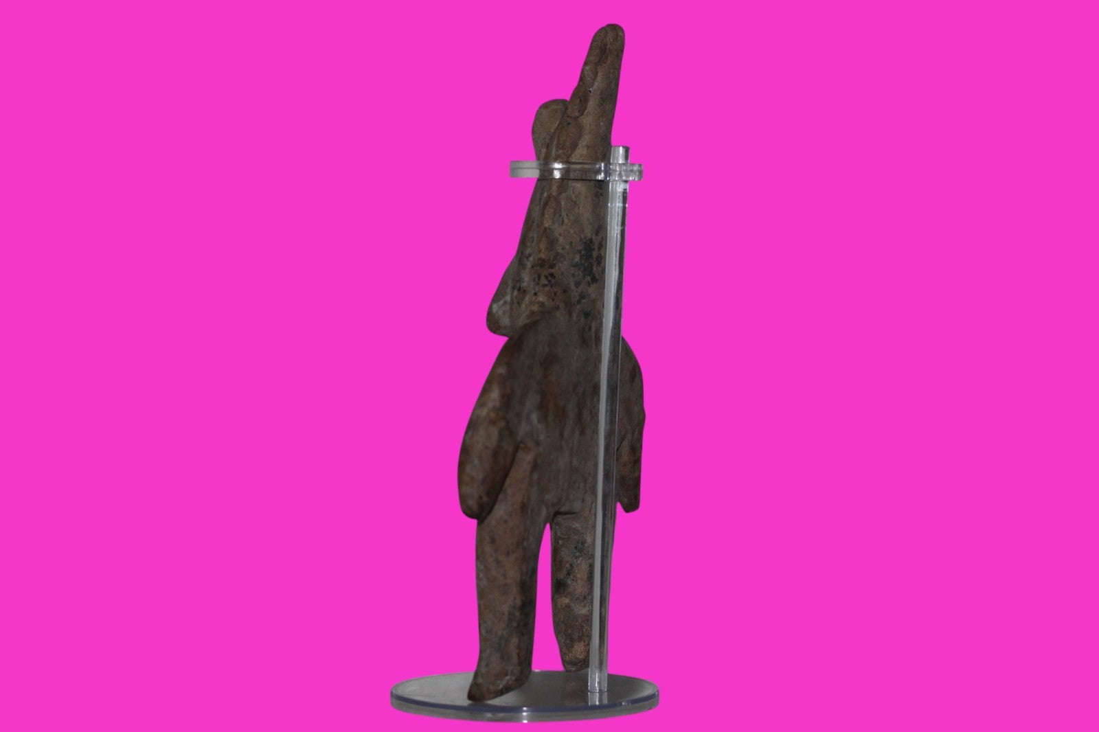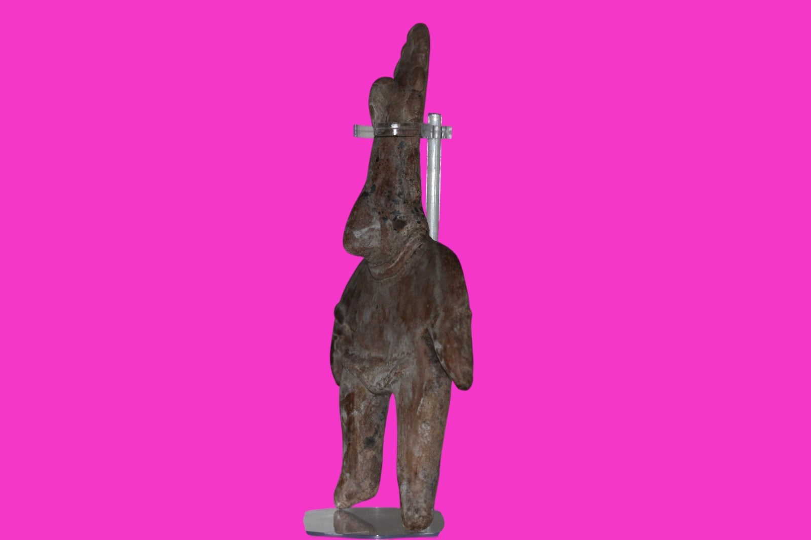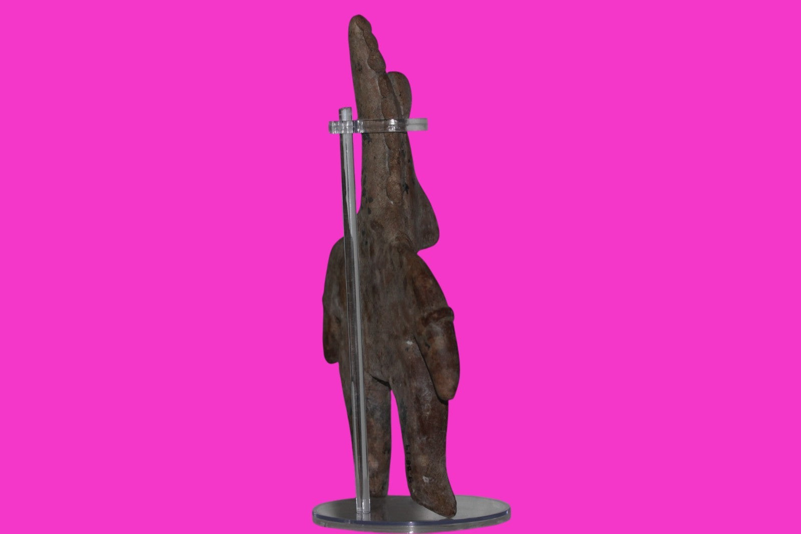 Dimensions: 8 ½ inches tall, 5 inches wide, weighs 386 grams. Description: Male Archaic Shaman tomb figure wearing elaborate head gear, arm bands, a necklace and a loincloth. Abrasions, wear consistent with age. No repairs or restorations. Overall outstanding condition. Manganese Dioxide Reactivity Test Results: A solution of laboratory grade 40% hydrogen peroxide was applied to multiple manganese blooms that resulted in a strong chemical reaction indicating approximately 2000 years of underground burial. Provenance: Ex. Arte Primitivo Fine Art Gallery, February 2025. Ex. Private Nevada collection. Ex. Dr. David Harner collection, Arkansas, 1950’s -1960’s.