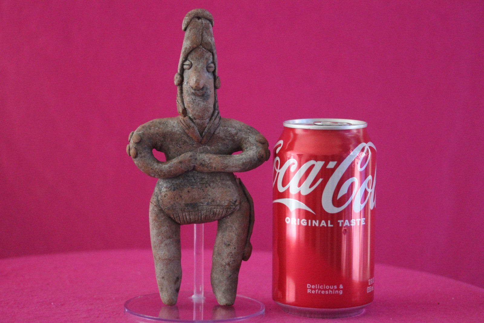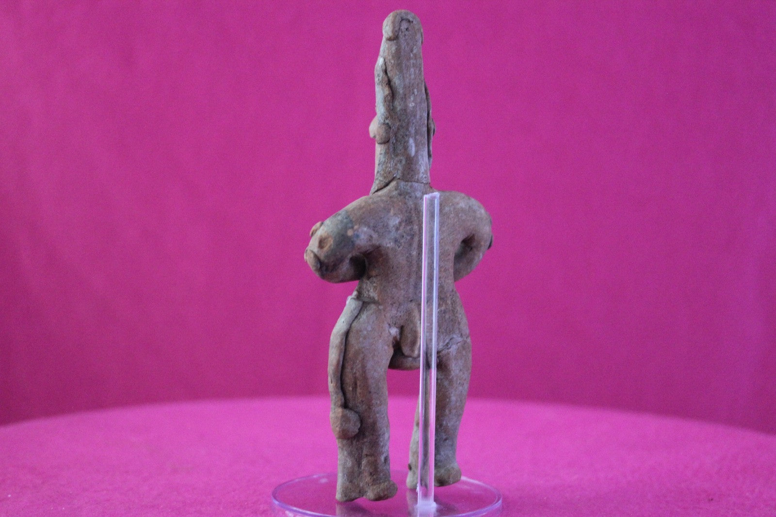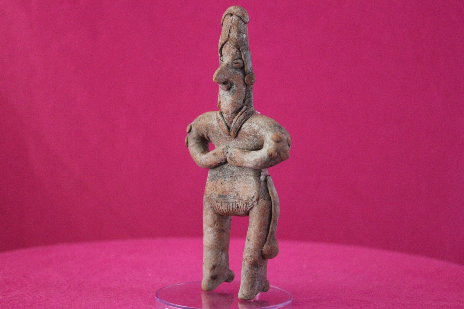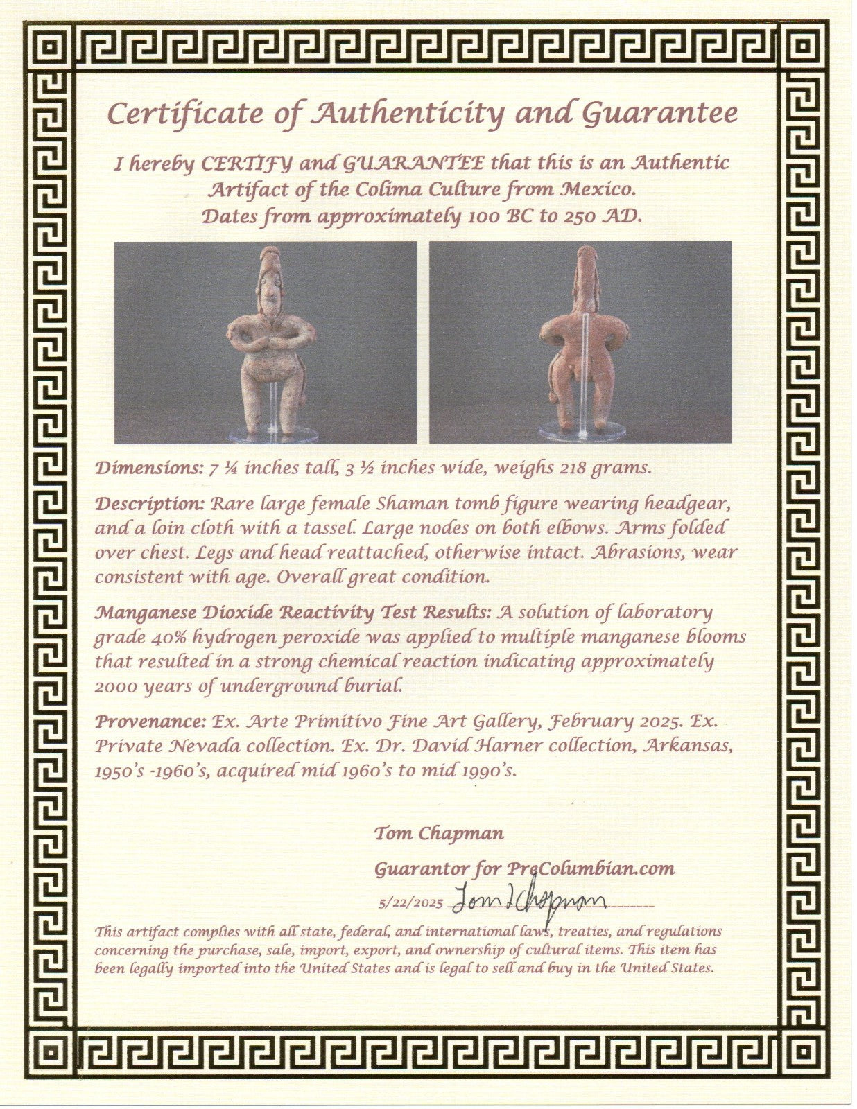 Dimensions: 7 ¼ inches tall, 3 ½ inches wide, weighs 218 grams.Description: Rare large female Shaman tomb figure wearing headgear, and a loin cloth with a tassel. Large nodes on both elbows. Arms folded over chest. Legs and head reattached, otherwise intact. Abrasions, wear consistent with age. Overall great condition.Manganese Dioxide Reactivity Test Results: A solution of laboratory grade 40% hydrogen peroxide was applied to multiple manganese blooms that resulted in a strong chemical reaction indicating approximately 2000 years of underground burial.Provenance: Ex. Arte Primitivo Fine Art Gallery, February 2025. Ex. Private Nevada collection. Ex. Dr. David Harner collection, Arkansas, 1950’s -1960’s, acquired mid 1960’s to mid 1990’s.