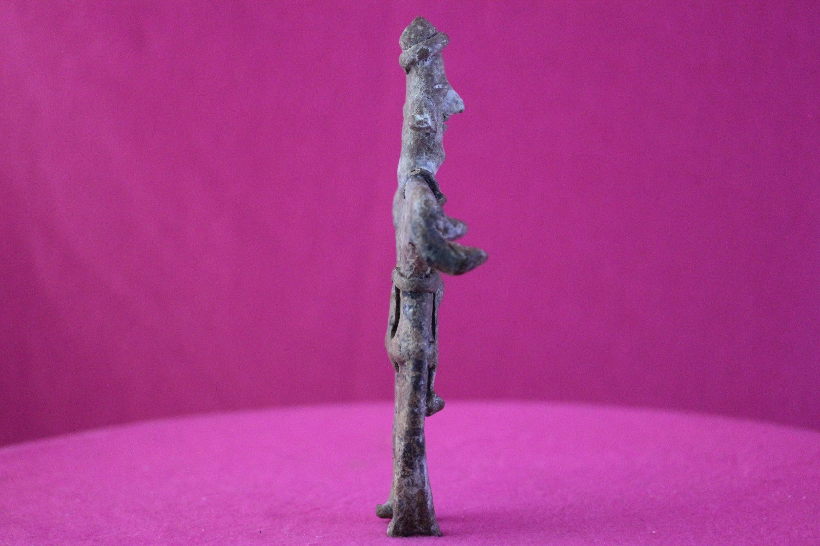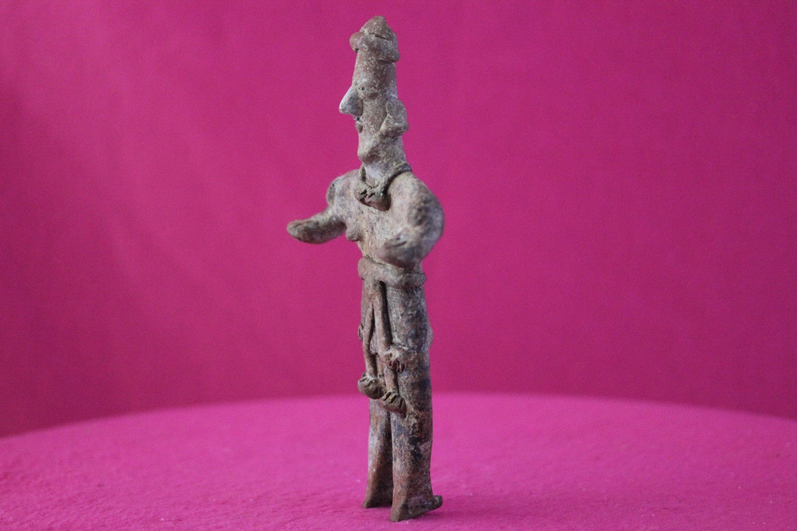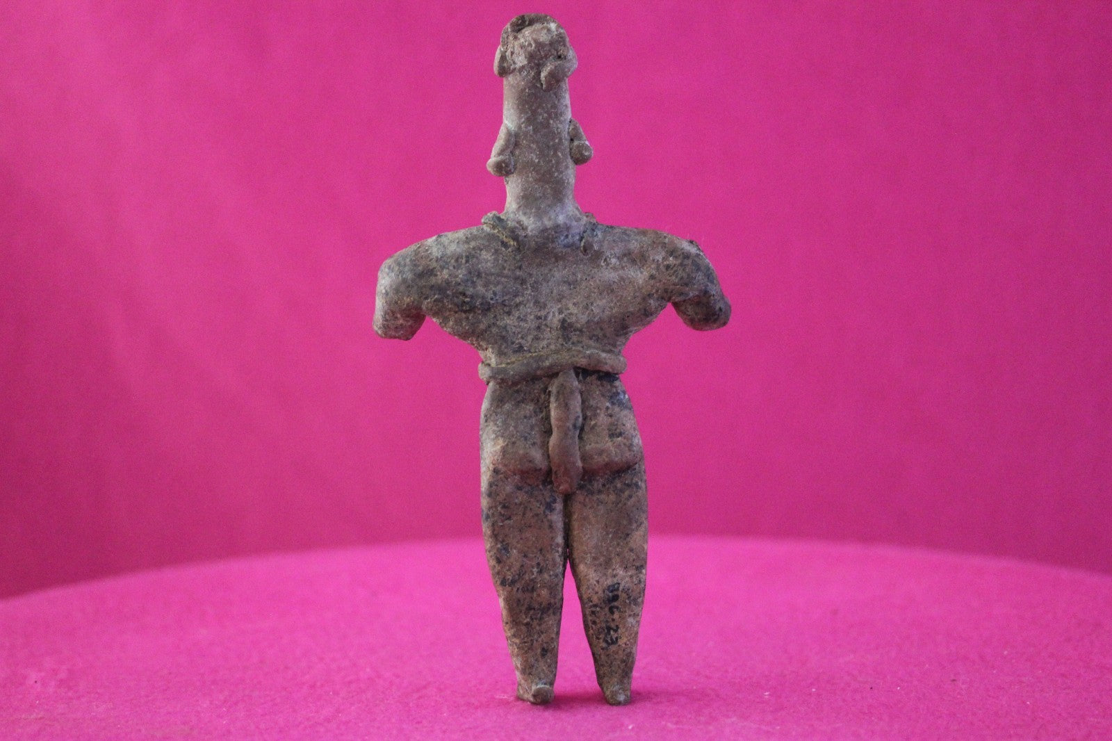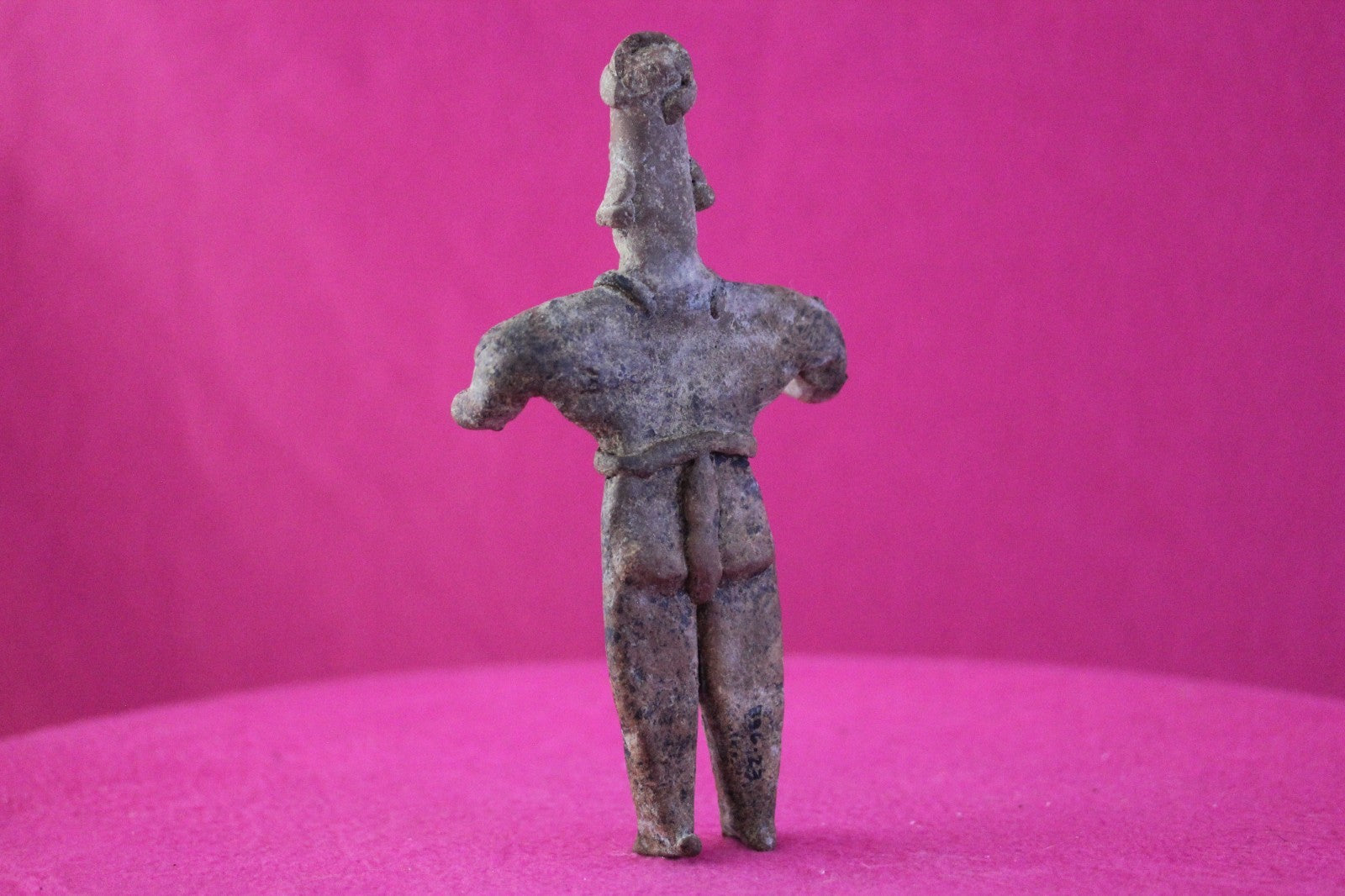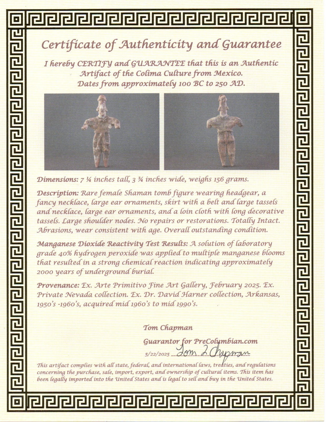 Dimensions: 7 ¼ inches tall, 3 ¾ inches wide, weighs 156 grams.Description: Rare female Shaman tomb figure wearing headgear, a fancy necklace, large ear ornaments, skirt with a belt and large tassels and necklace, large ear ornaments, and a loin cloth with long decorative tassels. Large shoulder nodes. No repairs or restorations. Totally Intact. Abrasions, wear consistent with age. Overall outstanding condition.Manganese Dioxide Reactivity Test Results: A solution of laboratory grade 40% hydrogen peroxide was applied to multiple manganese blooms that resulted in a strong chemical reaction indicating approximately 2000 years of underground burial.Provenance: Ex. Arte Primitivo Fine Art Gallery, February 2025. Ex. Private Nevada collection. Ex. Dr. David Harner collection, Arkansas, 1950’s -1960’s, acquired mid 1960’s to mid 1990’s.