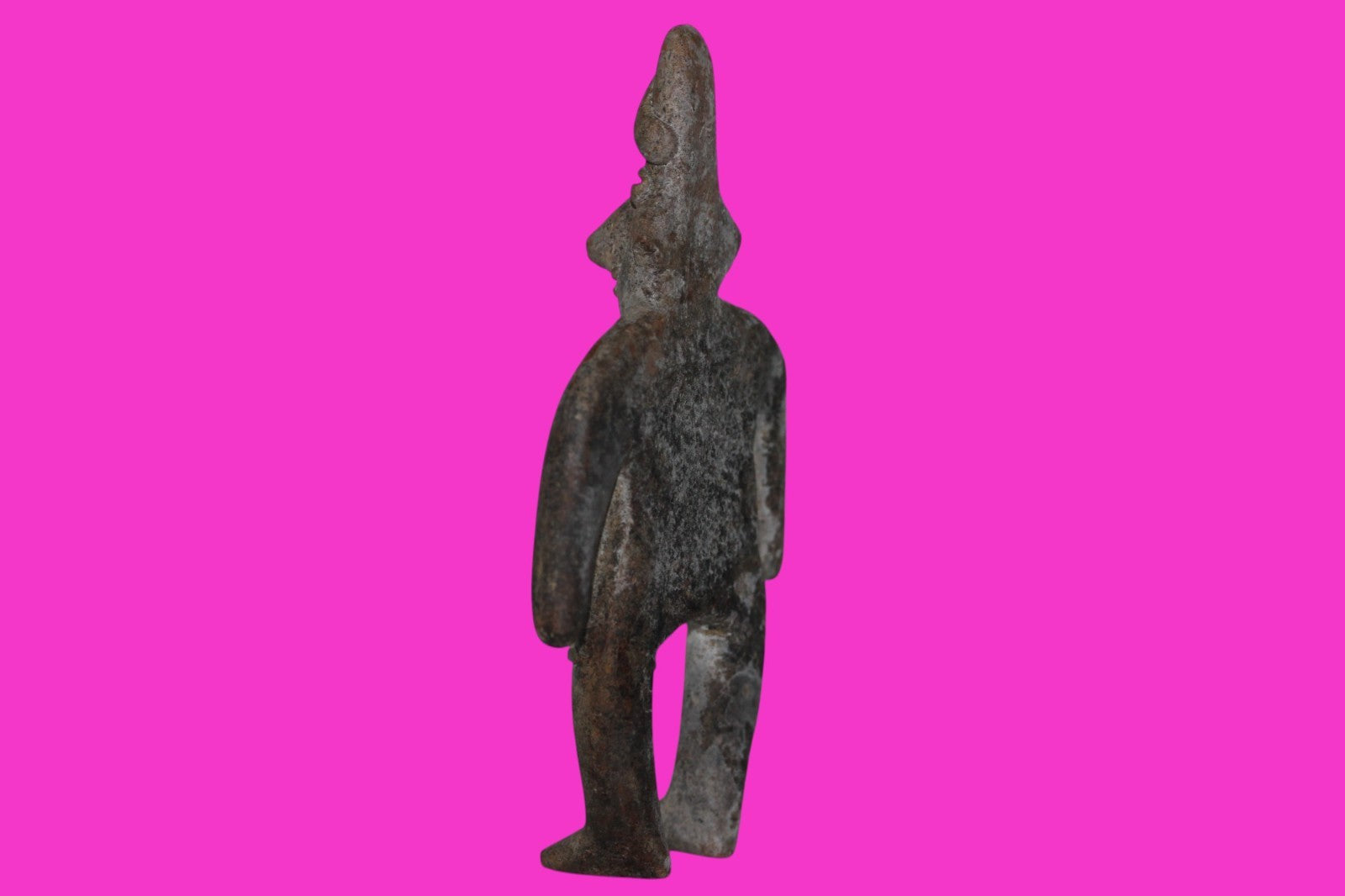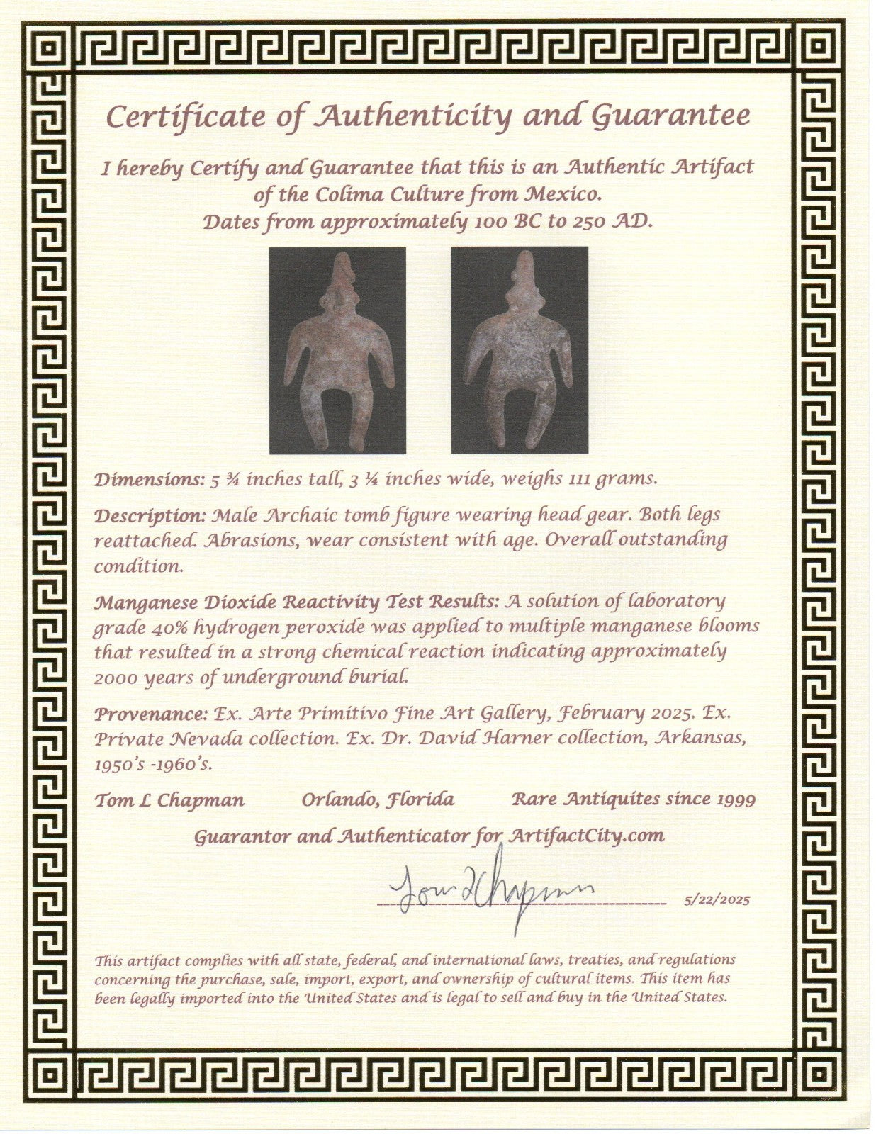 Dimensions: 5 ¾ inches tall, 3 ¼ inches wide, weighs 111 grams. Description: Male Archaic tomb figure wearing head gear. Both legs reattached. Abrasions, wear consistent with age. Overall outstanding condition. Manganese Dioxide Reactivity Test Results: A solution of laboratory grade 40% hydrogen peroxide was applied to multiple manganese blooms that resulted in a strong chemical reaction indicating approximately 2000 years of underground burial. Provenance: Ex. Arte Primitivo Fine Art Gallery, February 2025. Ex. Private Nevada collection. Ex. Dr. David Harner collection, Arkansas, 1950’s -1960’s.