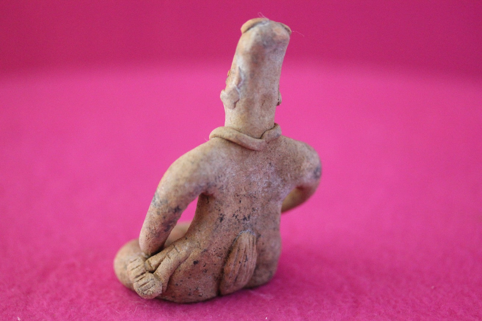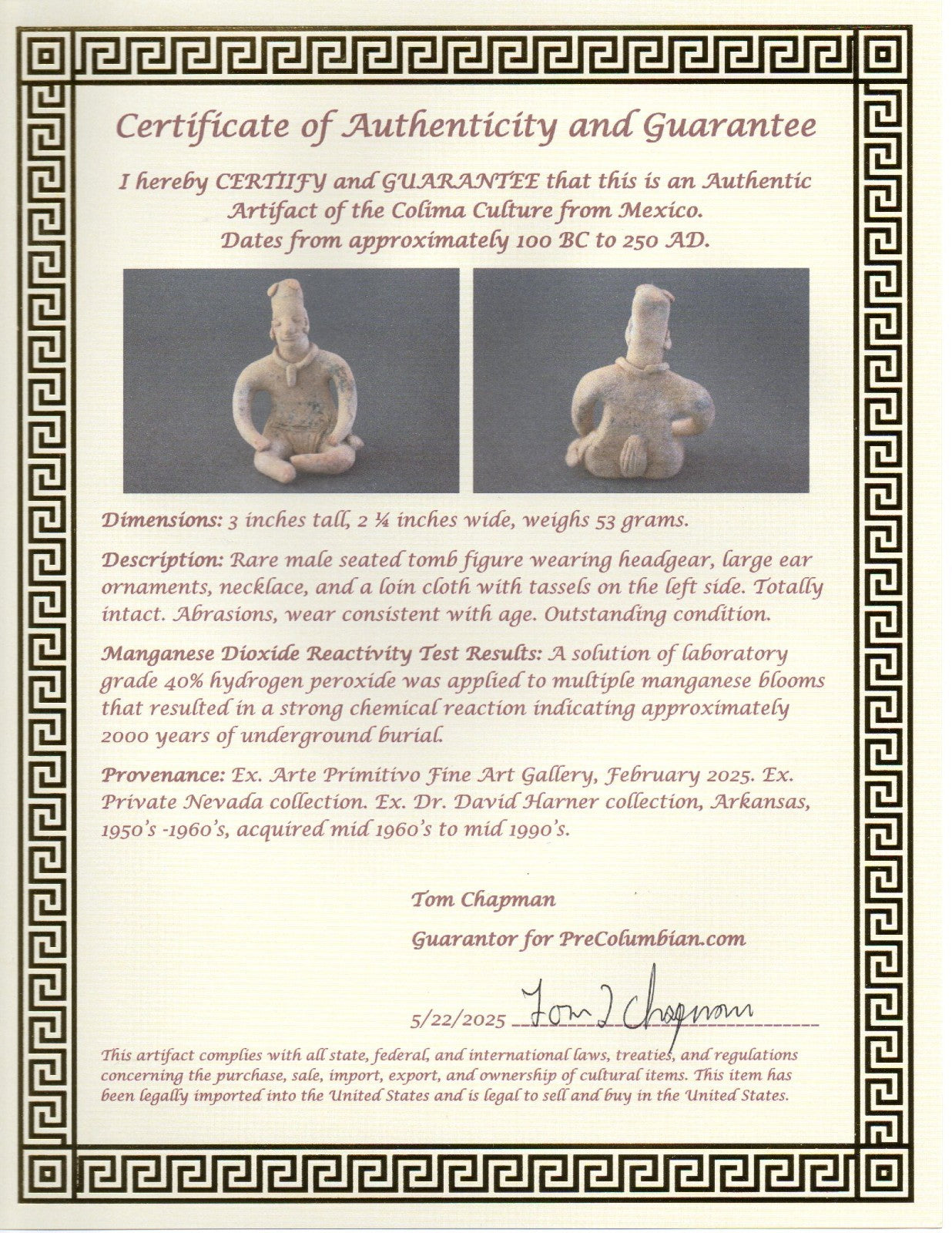 Dimensions: 3 inches tall, 2 ¼ inches wide, weighs 53 grams.Description: Rare male seated tomb figure wearing headgear, large ear ornaments, necklace, and a loin cloth with tassels on the left side. Totally intact. Abrasions, wear consistent with age. Outstanding condition.Manganese Dioxide Reactivity Test Results: A solution of laboratory grade 40% hydrogen peroxide was applied to multiple manganese blooms that resulted in a strong chemical reaction indicating approximately 2000 years of underground burial.Provenance: Ex. Arte Primitivo Fine Art Gallery, February 2025. Ex. Private Nevada collection. Ex. Dr. David Harner collection, Arkansas, 1950’s -1960’s, acquired mid 1960’s to mid 1990’s.