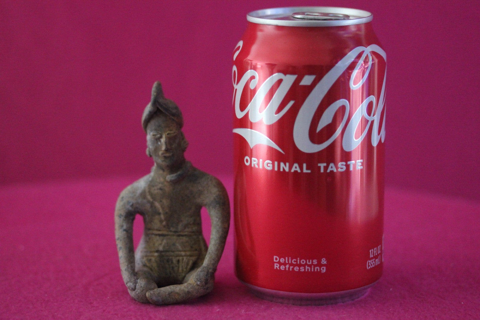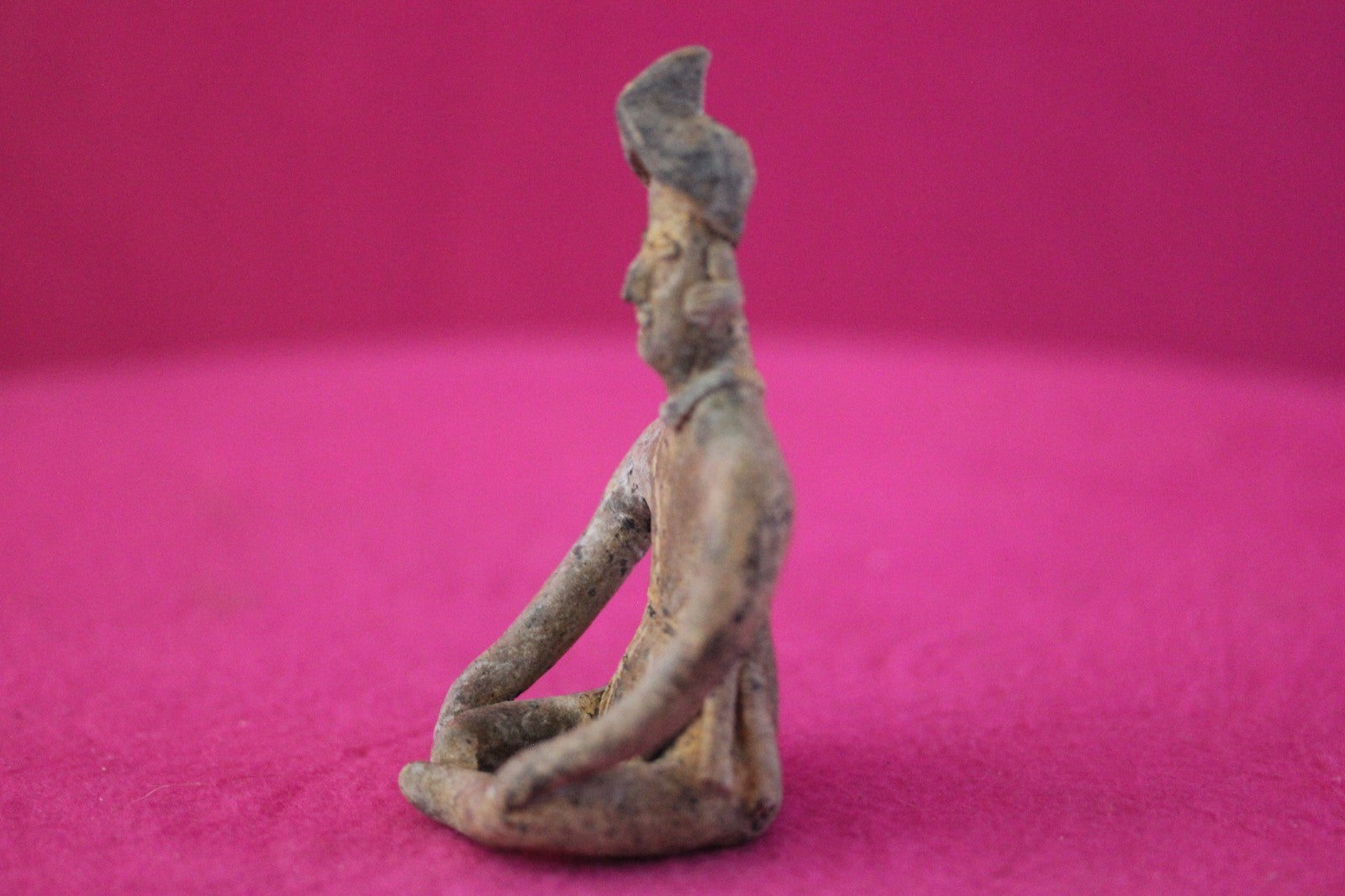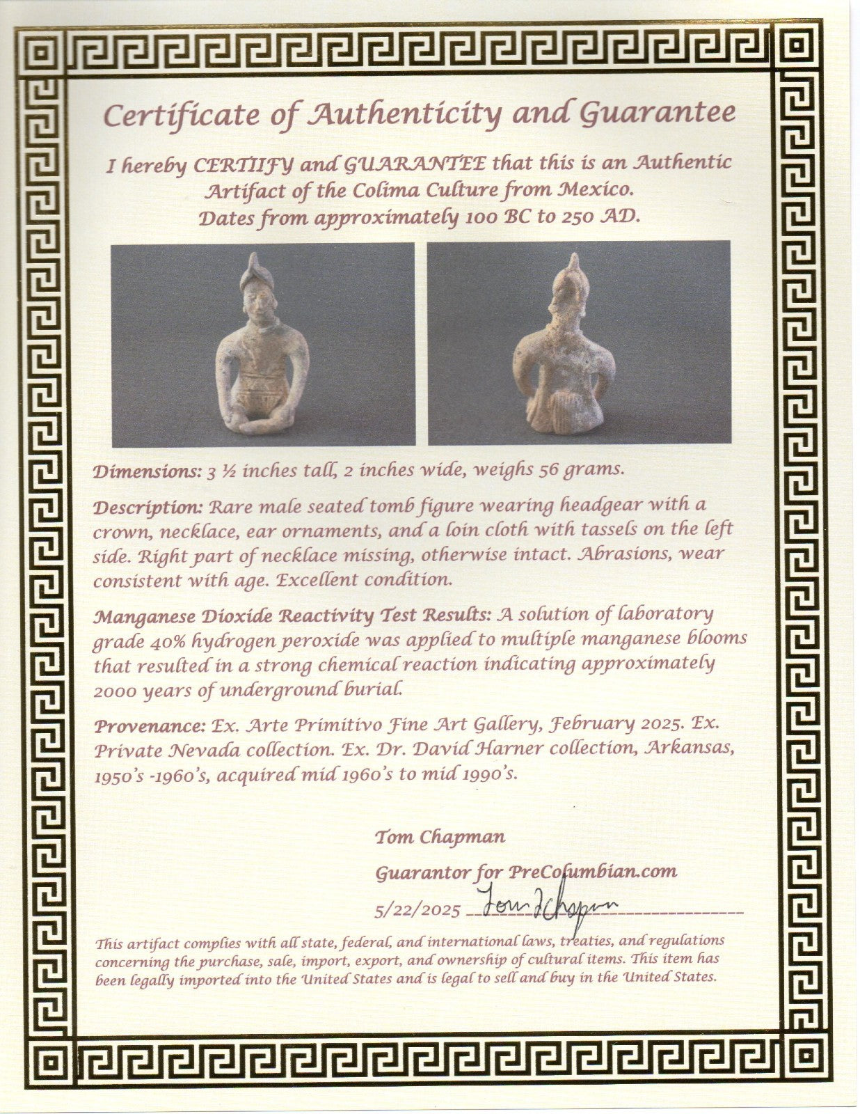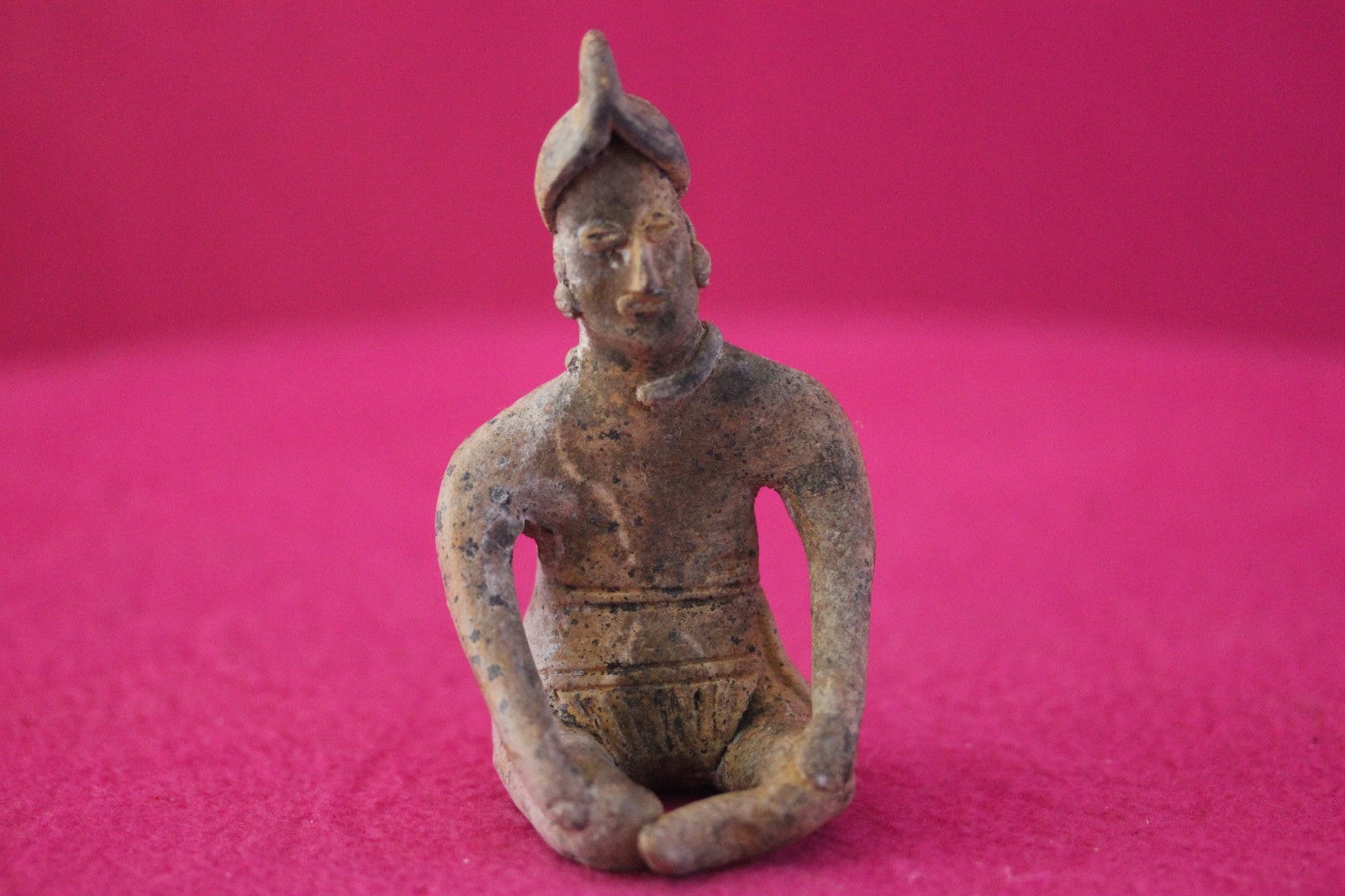 Dimensions: 3 ½ inches tall, 2 inches wide, weighs 56 grams.Description: Rare male seated tomb figure wearing headgear with a crown, necklace, ear ornaments, and a loin cloth with tassels on the left side. Right part of necklace missing, otherwise intact. Abrasions, wear consistent with age. Excellent condition.Manganese Dioxide Reactivity Test Results: A solution of laboratory grade 40% hydrogen peroxide was applied to multiple manganese blooms that resulted in a strong chemical reaction indicating approximately 2000 years of underground burial.Provenance: Ex. Arte Primitivo Fine Art Gallery, February 2025. Ex. Private Nevada collection. Ex. Dr. David Harner collection, Arkansas, 1950’s -1960’s, acquired mid 1960’s to mid 1990’s.