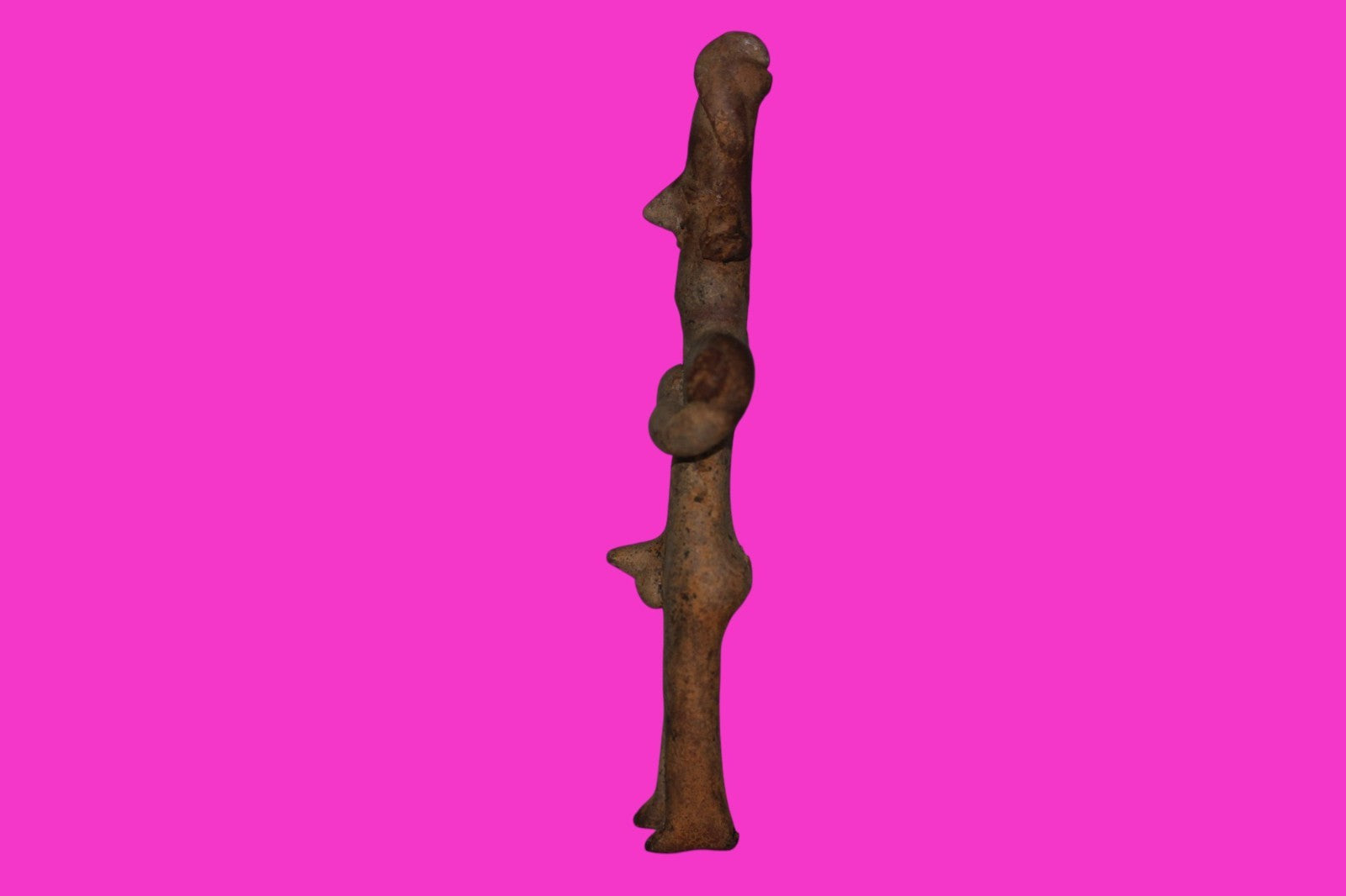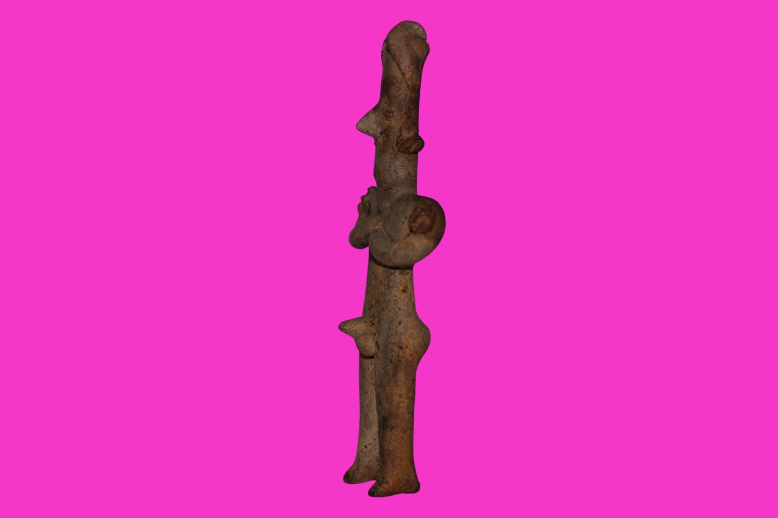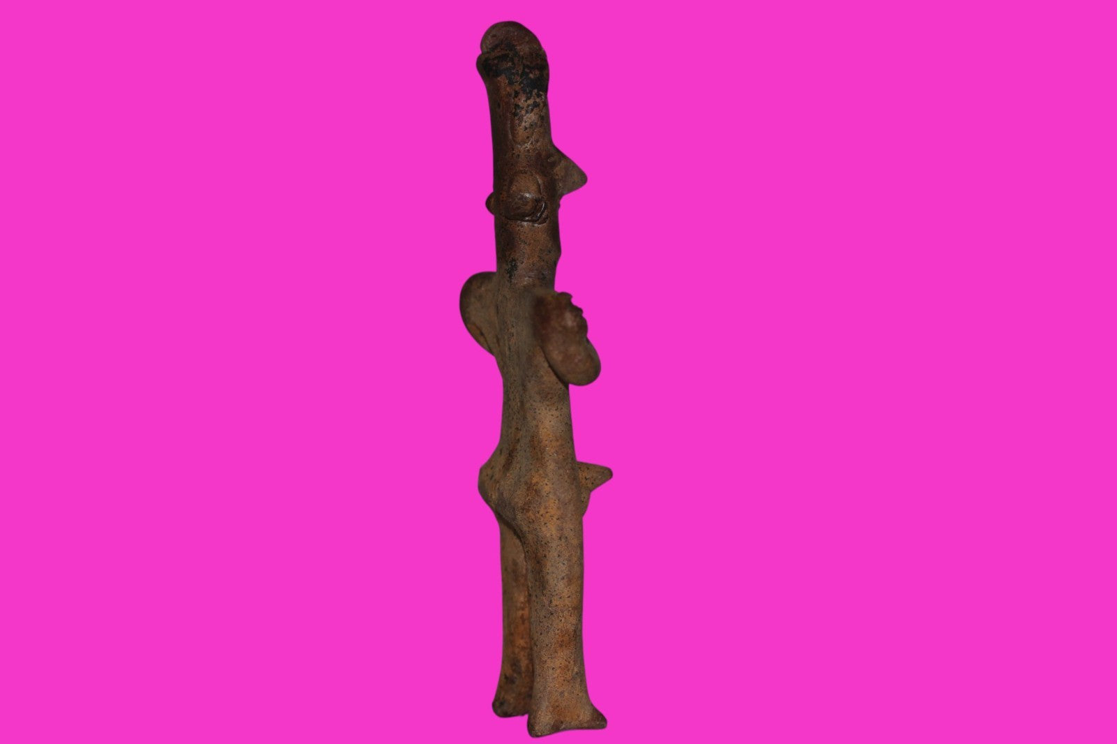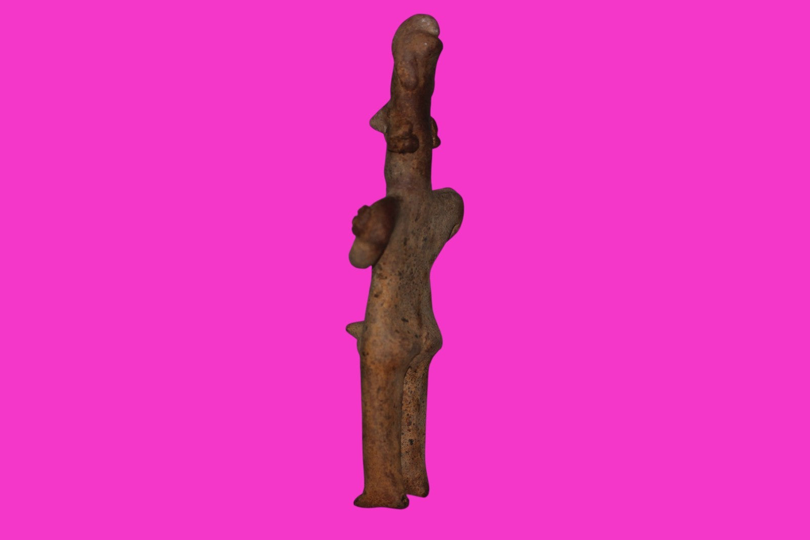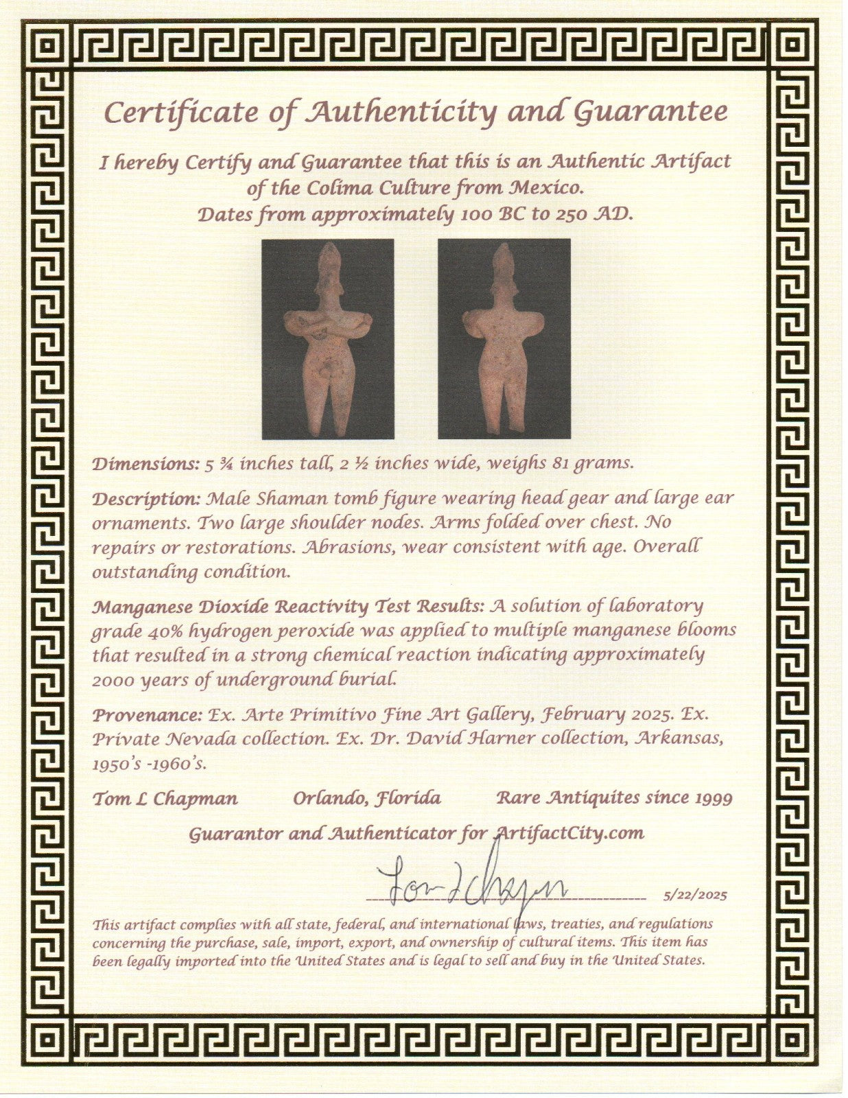 Dimensions: 5 ¾ inches tall, 2 ½ inches wide, weighs 81 grams. Description: Male Shaman tomb figure wearing head gear and large ear ornaments. Two large shoulder nodes. Arms folded over chest. No repairs or restorations. Abrasions, wear consistent with age. Overall outstanding condition. Manganese Dioxide Reactivity Test Results: A solution of laboratory grade 40% hydrogen peroxide was applied to multiple manganese blooms that resulted in a strong chemical reaction indicating approximately 2000 years of underground burial. Provenance: Ex. Arte Primitivo Fine Art Gallery, February 2025. Ex. Private Nevada collection. Ex. Dr. David Harner collection, Arkansas, 1950’s -1960’s.