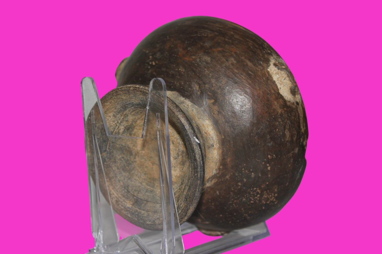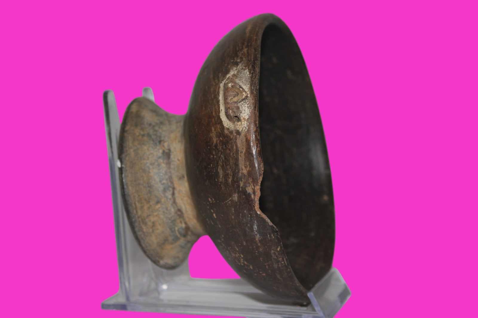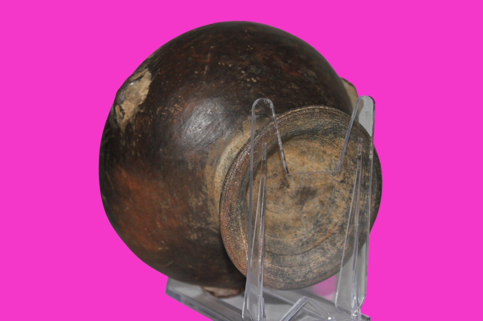 Dimensions: 2 ¾ inches tall, 5 ½ inches wide, weighs 422 grams. Description: Solid chocolate ware pedestal bowl. Three applied decorative gripping handles around the rim. 1 inch rim chip in antiquity. No repairs or restorations. Small rim chips, minor abrasions, otherwise intact. Overall good condition. Manganese Dioxide Reactivity Test Results: A solution of laboratory grade 40% hydrogen peroxide was applied to multiple manganese blooms that resulted in a strong chemical reaction indicating approximately 1000 years of underground burial. Provenance: Ex. Private Longwood, Florida collection. Collected in the 1970’s. Acquired by John McIntosh, MSE, MBA of Ancient Artifacts & Treasures, Winter Park, Florida in 2023. Consigned to The Artifact City Collection in 2025.
