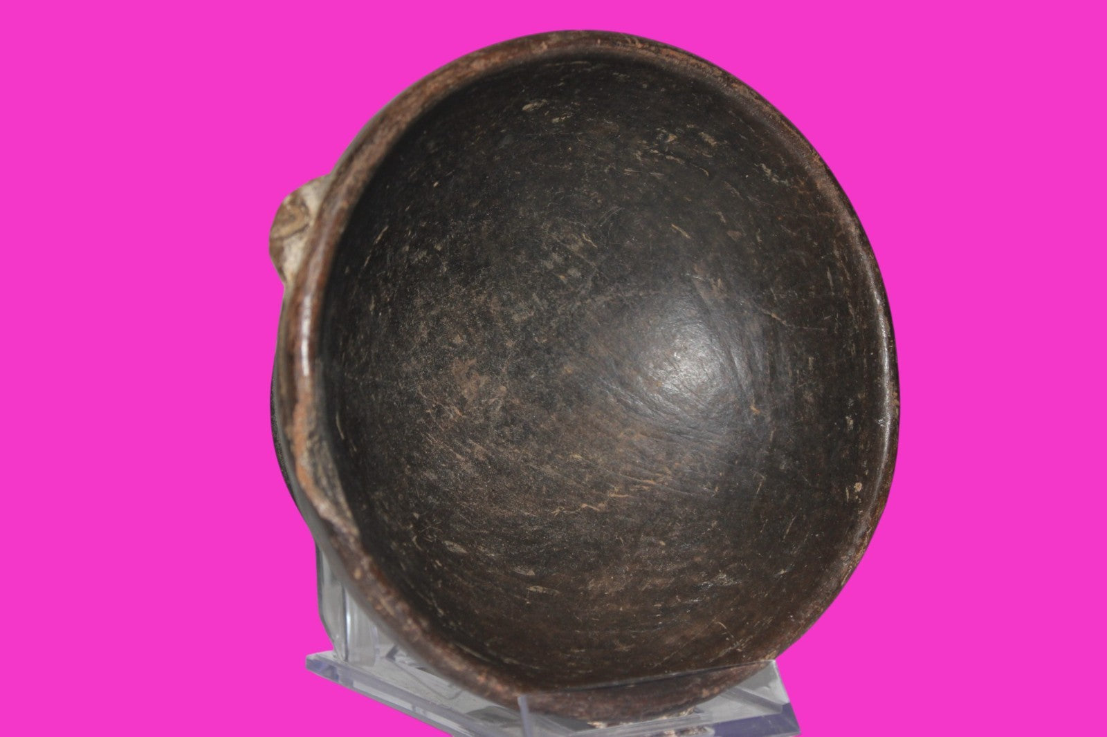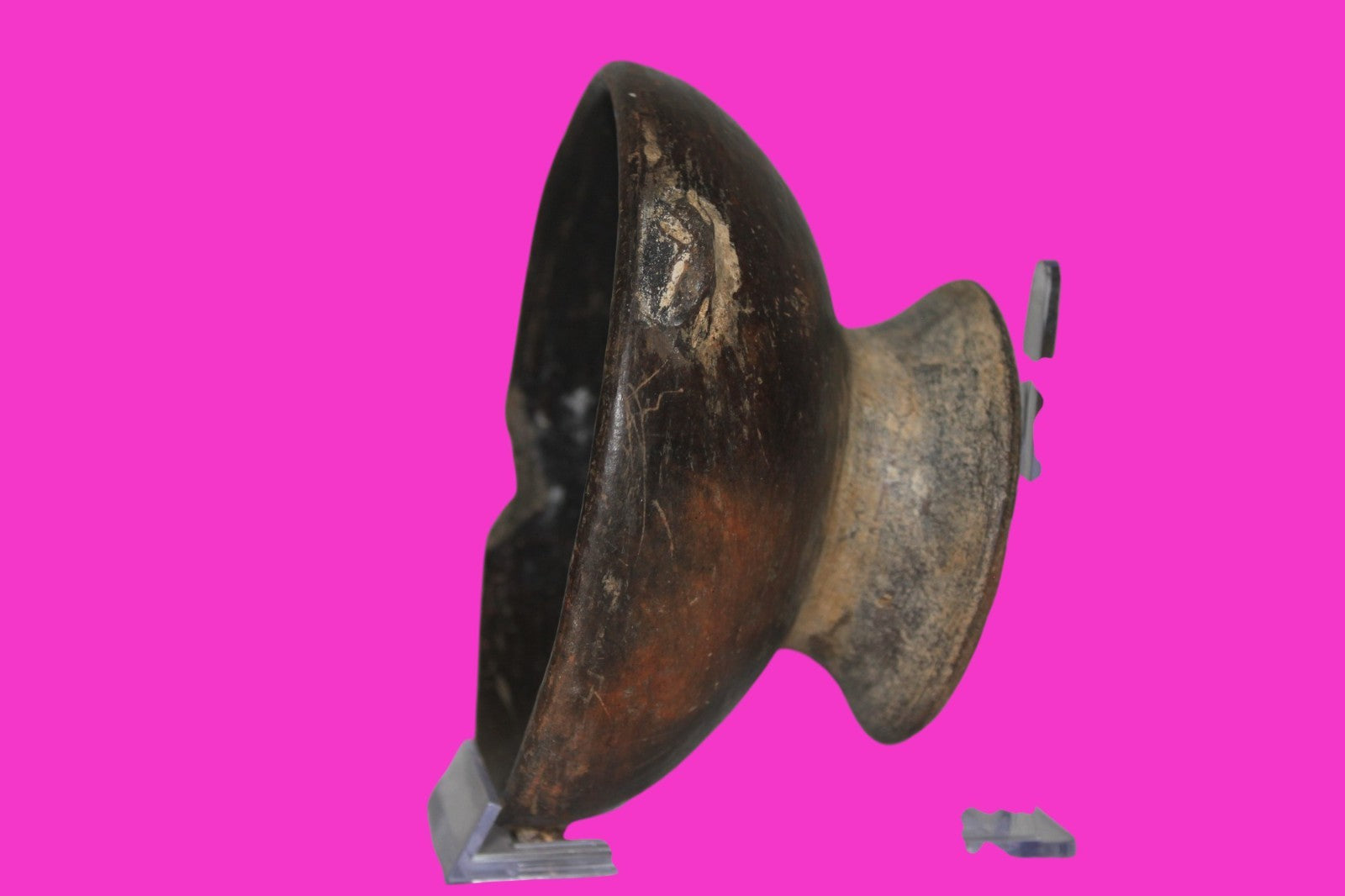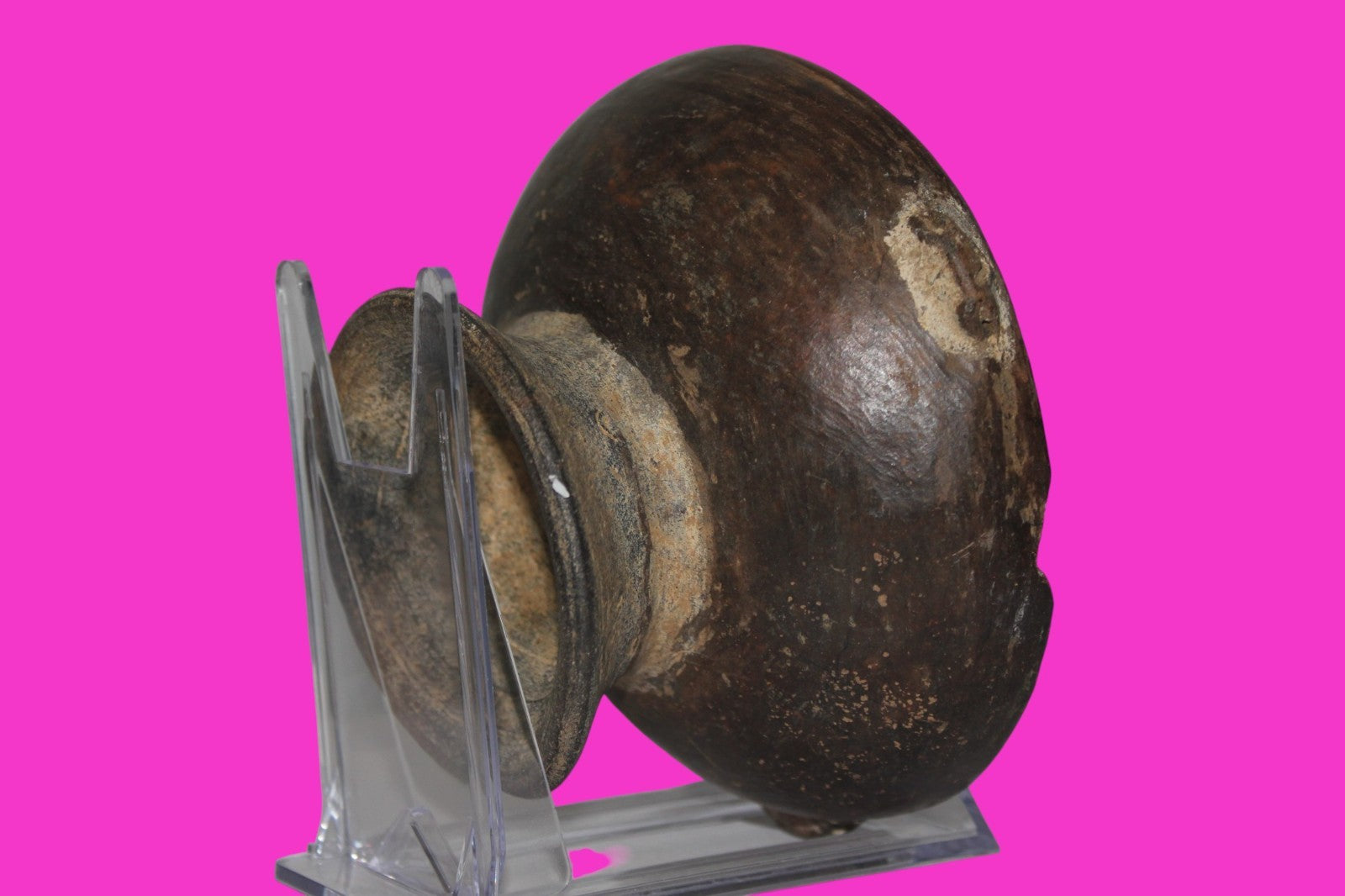 Dimensions: 2 ¾ inches tall, 5 ½ inches wide, weighs 422 grams. Description: Solid chocolate ware pedestal bowl. Three applied decorative gripping handles around the rim. 1 inch rim chip in antiquity. No repairs or restorations. Small rim chips, minor abrasions, otherwise intact. Overall good condition. Manganese Dioxide Reactivity Test Results: A solution of laboratory grade 40% hydrogen peroxide was applied to multiple manganese blooms that resulted in a strong chemical reaction indicating approximately 1000 years of underground burial. Provenance: Ex. Private Longwood, Florida collection. Collected in the 1970’s. Acquired by John McIntosh, MSE, MBA of Ancient Artifacts & Treasures, Winter Park, Florida in 2023. Consigned to The Artifact City Collection in 2025.