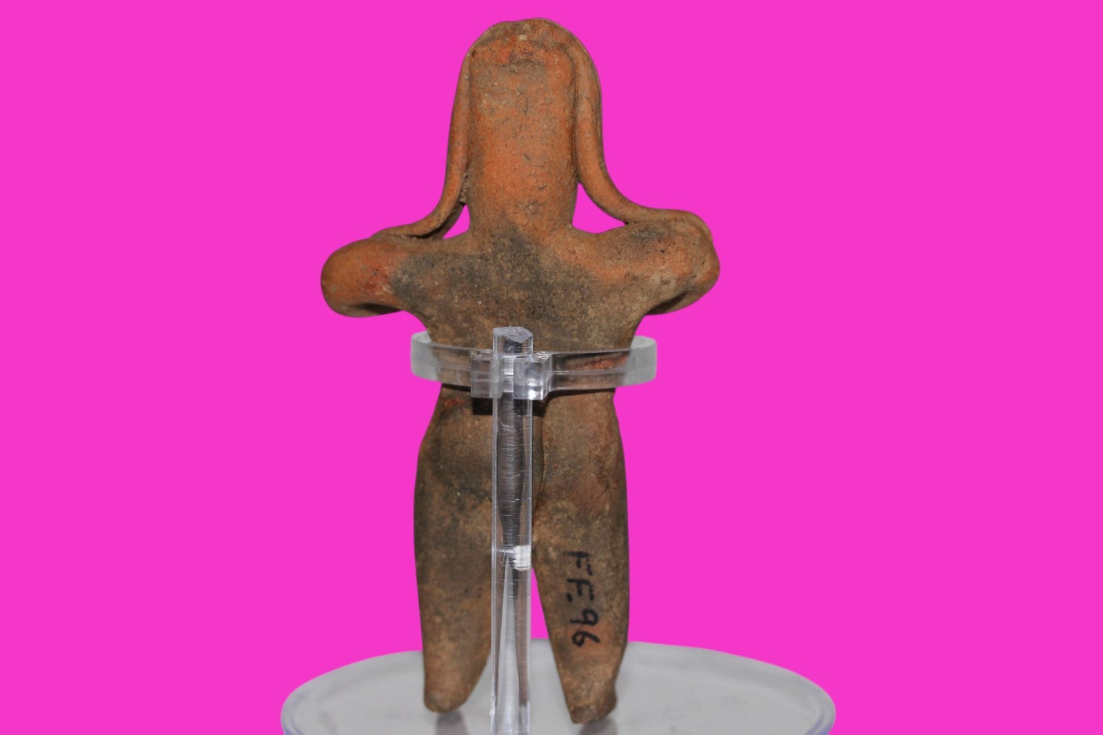 Dimensions: 4 ½ inches tall, 2 ½ inches wide, weighs 66 grams. Description: Female “Pretty Lady’ tomb figure with very long hair. Tips of hair resting on her shoulders. Wearing a loin cloth with incisions and tassels. Arms folded over chest. End of nose chipped. Repaired from two original pieces. Abrasions, wear consistent with age. Overall excellent condition. Provenance: Ex. Arte Primitivo Fine Art Gallery, February 2025. Ex. Private Nevada collection. Ex. Dr. David Harner collection, Arkansas, 1950’s -1960’s.