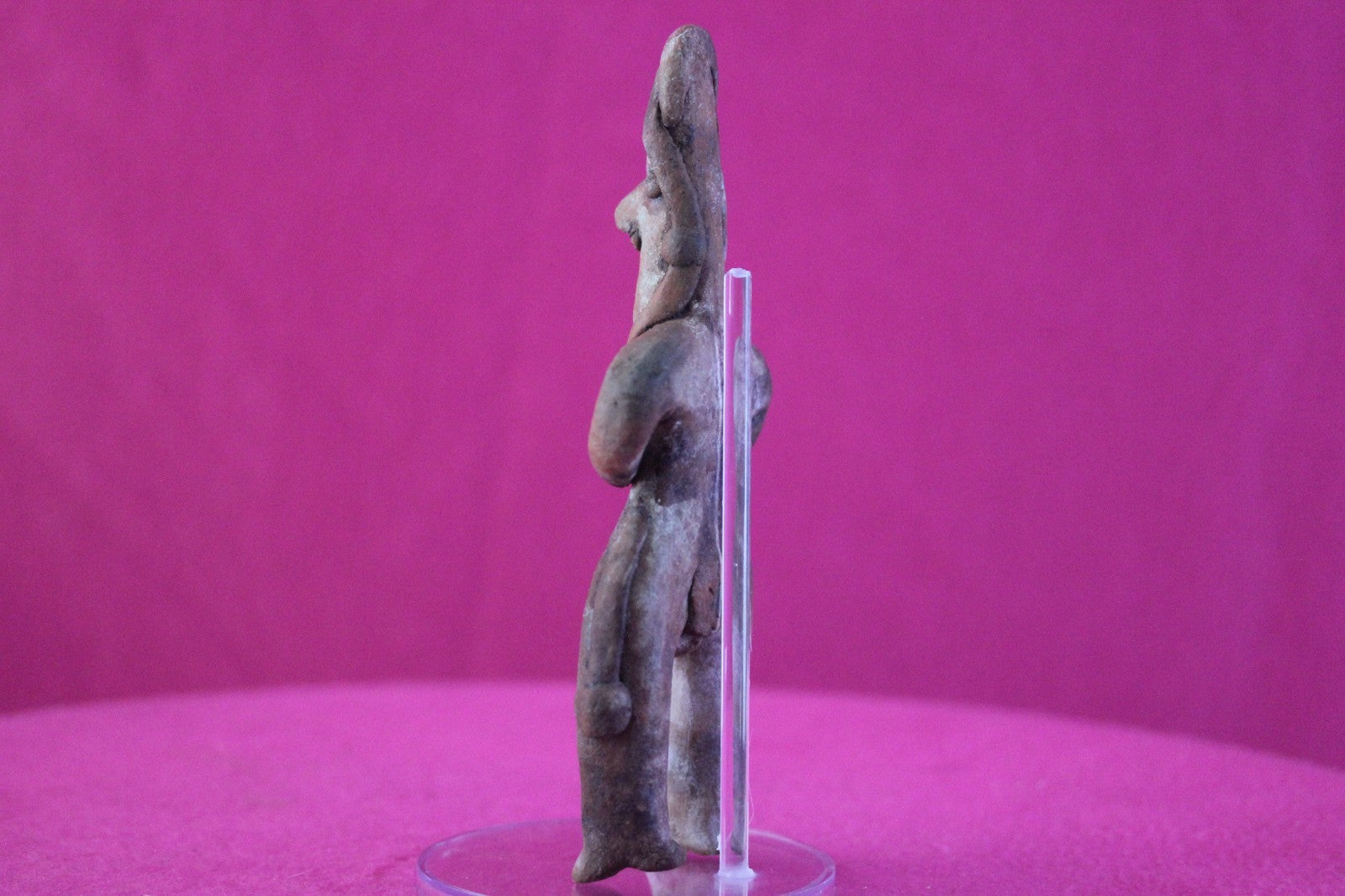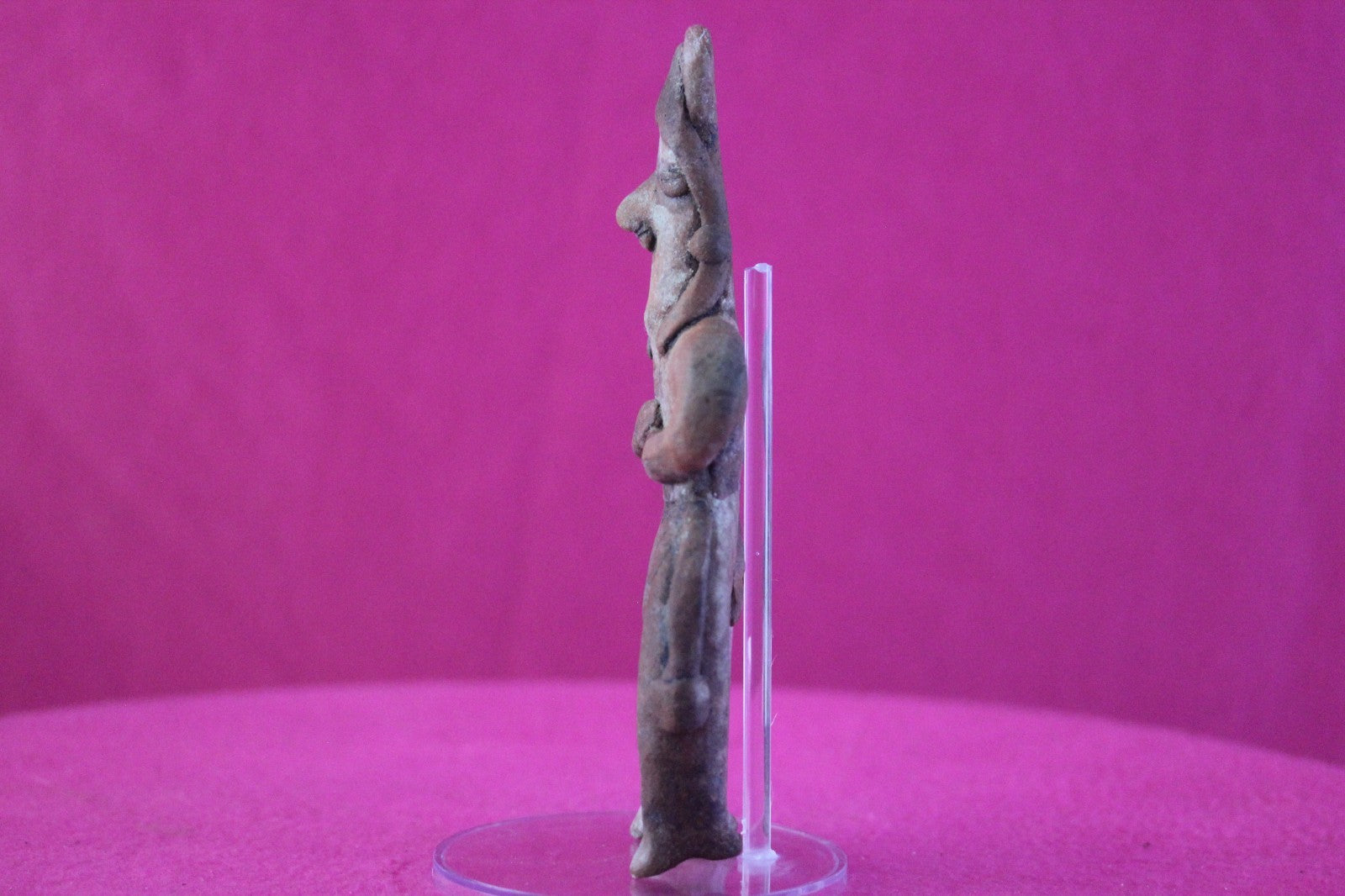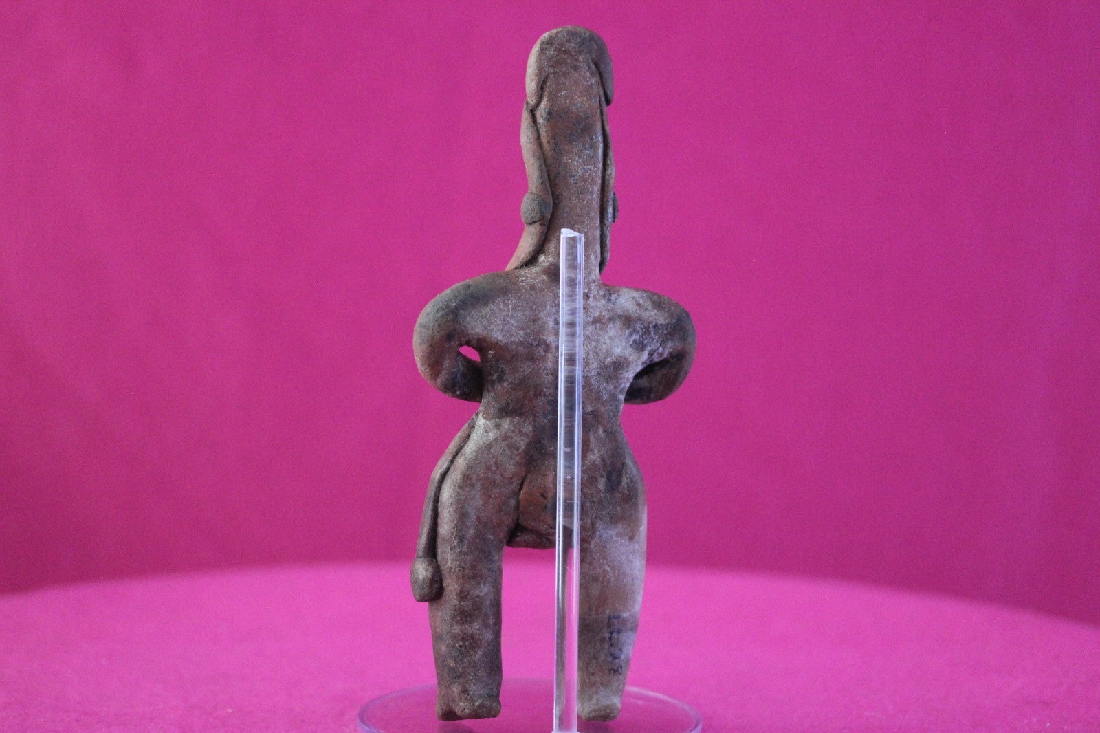 Dimensions: 6 inches tall, 3 inches wide, weighs 188 grams.Description: Female “Pretty Lady” tomb figure wearing headgear and a loin cloth with a tassel. Arms folded over chest. No repairs or restorations. Totally intact. Abrasions, wear consistent with age. Overall outstanding condition.Manganese Dioxide Reactivity Test Results: A solution of laboratory grade 40% hydrogen peroxide was applied to multiple manganese blooms that resulted in a strong chemical reaction indicating approximately 2000 years of underground burial.Provenance: Ex. Arte Primitivo Fine Art Gallery, February 2025. Ex. Private Nevada collection. Ex. Dr. David Harner collection, Arkansas, 1950’s -1960’s, acquired mid 1960’s to mid 1990’s.