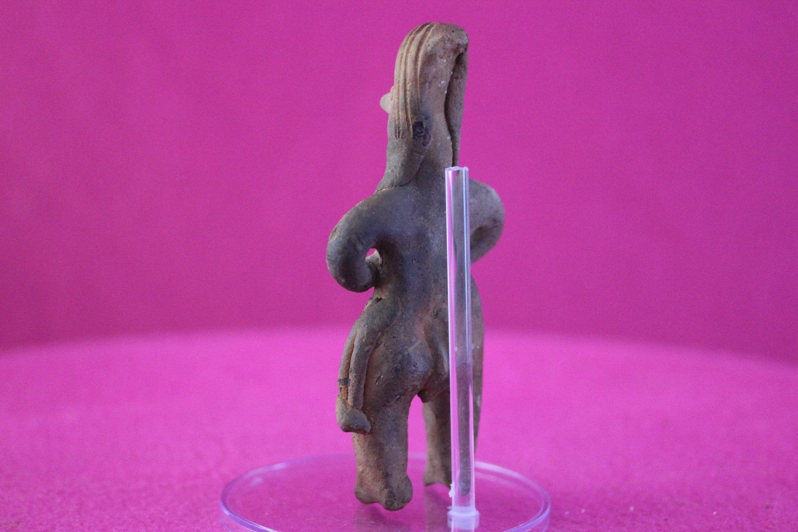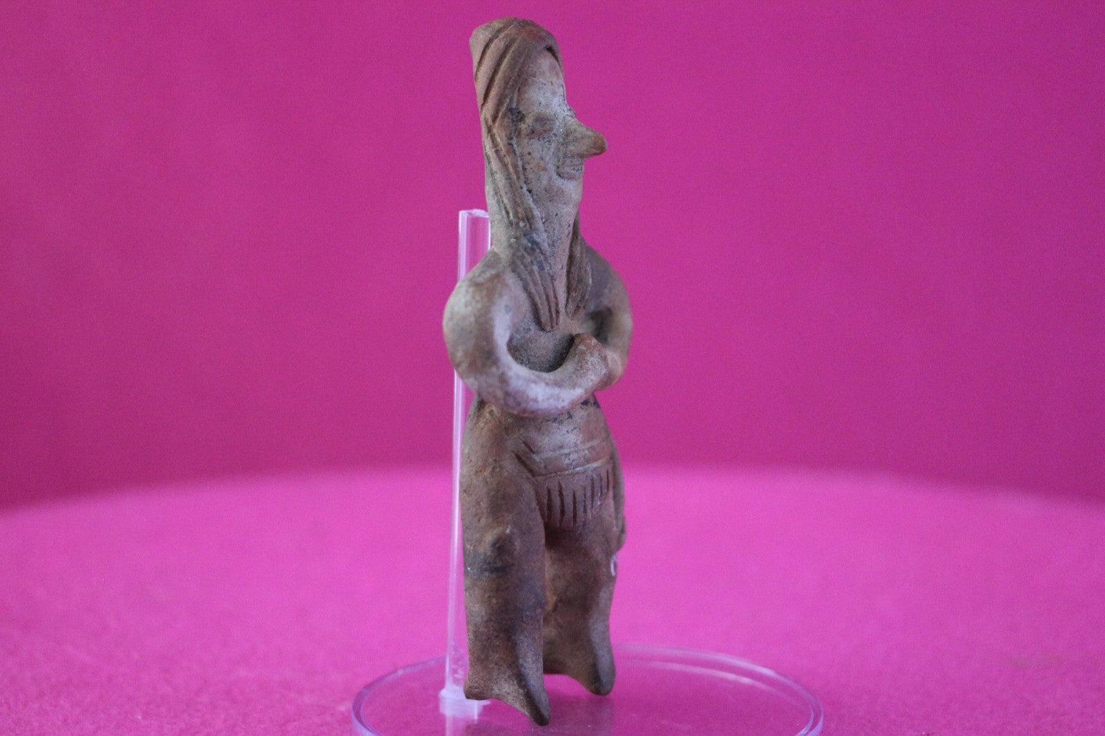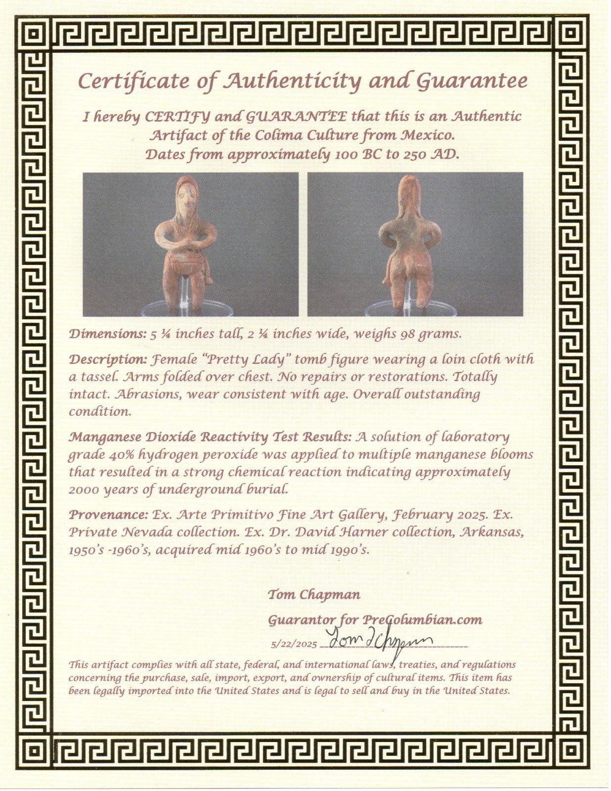 Dimensions: 5 ¼ inches tall, 2 ¼ inches wide, weighs 98 grams.Description: Female “Pretty Lady” tomb figure wearing a loin cloth with a tassel. Arms folded over chest. No repairs or restorations. Totally intact. Abrasions, wear consistent with age. Overall outstanding condition.Manganese Dioxide Reactivity Test Results: A solution of laboratory grade 40% hydrogen peroxide was applied to multiple manganese blooms that resulted in a strong chemical reaction indicating approximately 2000 years of underground burial.Provenance: Ex. Arte Primitivo Fine Art Gallery, February 2025. Ex. Private Nevada collection. Ex. Dr. David Harner collection, Arkansas, 1950’s -1960’s, acquired mid 1960’s to mid 1990’s.