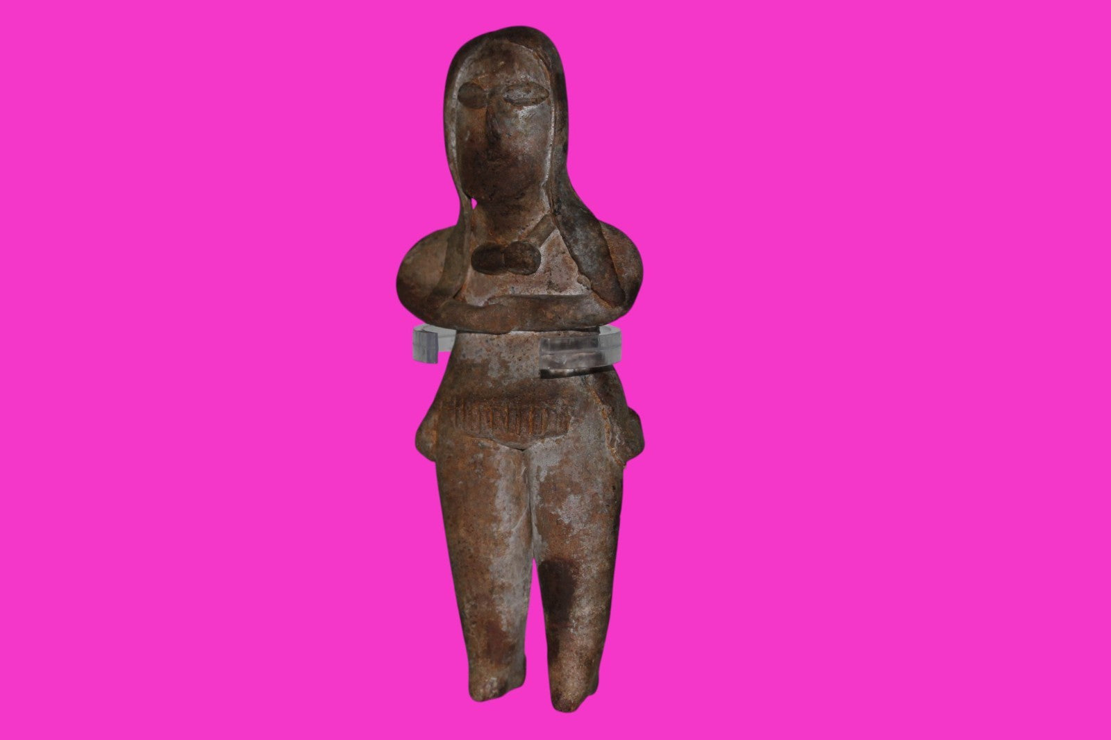 Dimensions: 4 ¾ inches tall, 2 inches wide, weighs 79 grams. Description: Female “Pretty Lady’ tomb figure with long hair, wearing a necklace, loin cloth with incisions and tassels. Arms folded over chest. No repairs or restorations. Small chip on the end of the nose, otherwise intact. Abrasions, wear consistent with age. Overall excellent condition. Manganese Dioxide Reactivity Test Results: A solution of laboratory grade 40% hydrogen peroxide was applied to multiple manganese blooms that resulted in a strong chemical reaction indicating approximately 2000 years of underground burial. Provenance: Ex. Arte Primitivo Fine Art Gallery, February 2025. Ex. Private Nevada collection. Ex. Dr. David Harner collection, Arkansas, 1950’s -1960’s.