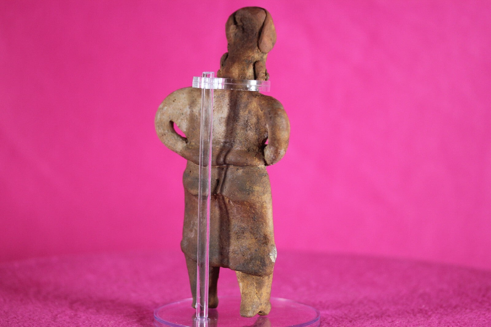 Dimensions: 6 ½ inches tall, 3 ½ inches wide, weighs 156 grams.Description: Rare elderly lady tomb figure wearing a skirt, with large ear spools, necklace, and a headwrap. Leaning forward as if suffering from back pain. Minor chips and abrasions, otherwise intact. Overall excellent condition.Provenance: Ex. Arte Primitivo Fine Art Gallery, February 2025. Ex. Private Nevada collection. Ex. Dr. David Harner collection, Arkansas, 1950’s -1960’s, acquired mid 1960’s to mid 1990’s.