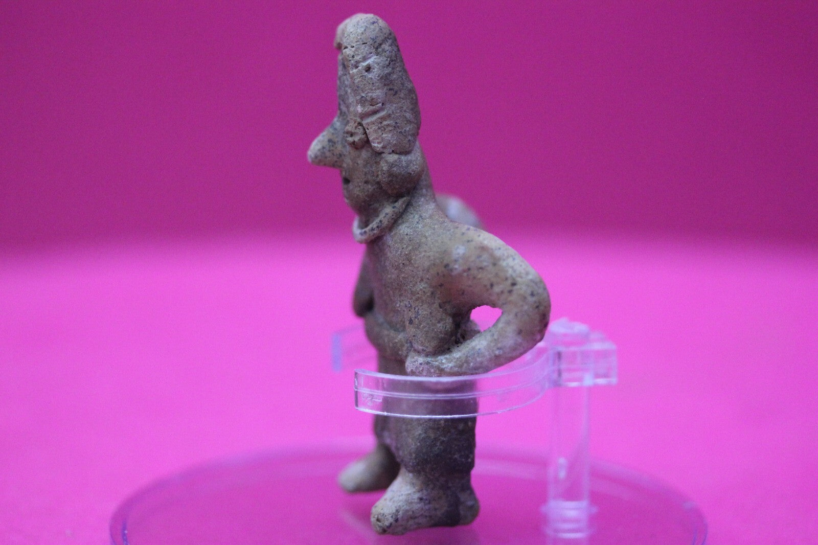 Dimensions: 3 inches tall, 1 ¾ inches wide, weighs 33 grams.Description: Rare elderly lady tomb figure wearing a skirt, elaborate necklace, and a wrap around the waist. Leaning forward as if suffering from back pain. Minor abrasions, otherwise intact. Overall excellent condition.Provenance: Ex. Arte Primitivo Fine Art Gallery, February 2025. Ex. Private Nevada collection. Ex. Dr. David Harner collection, Arkansas, 1950’s -1960’s, acquired mid 1960’s to mid 1990’s.