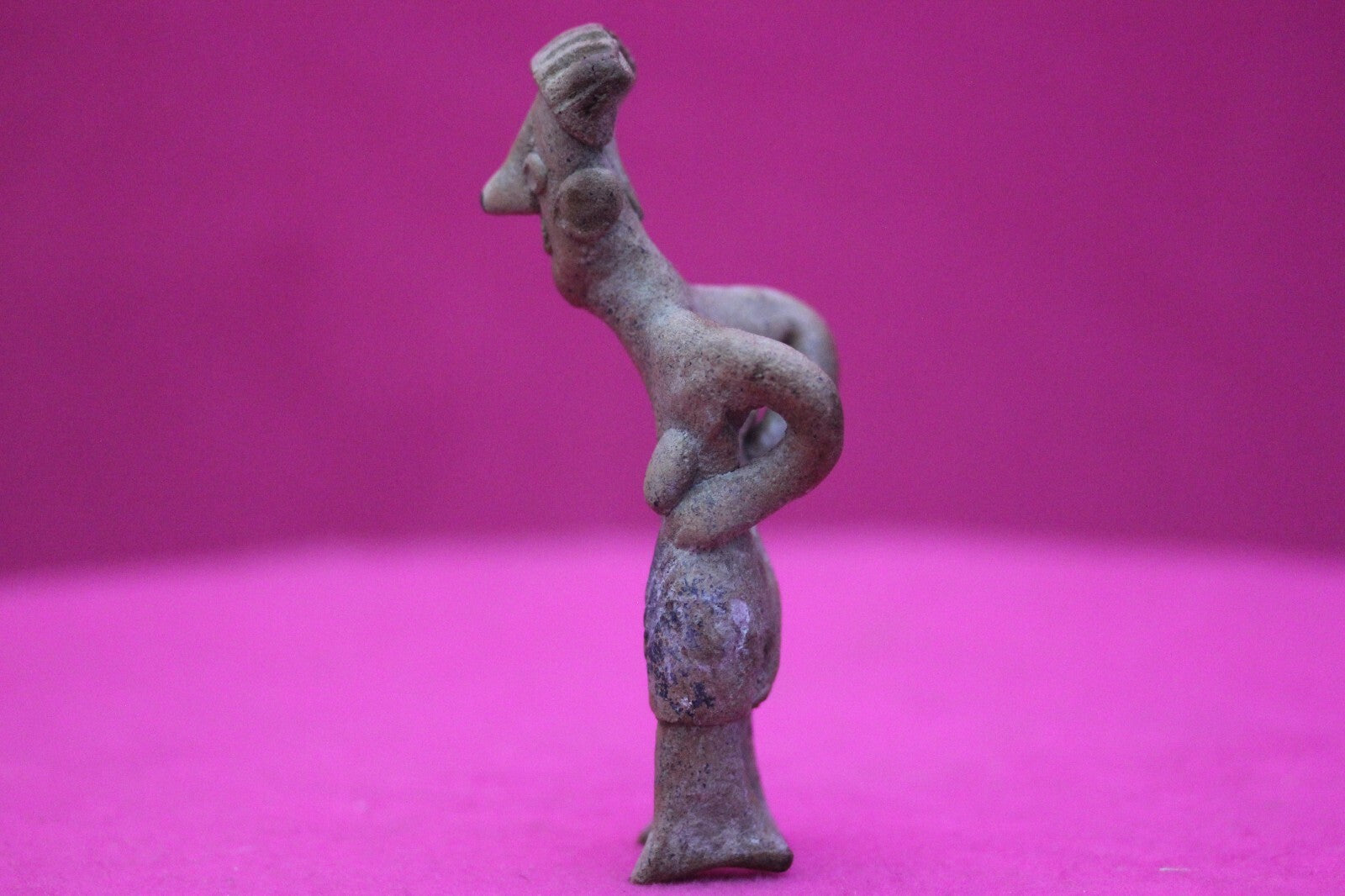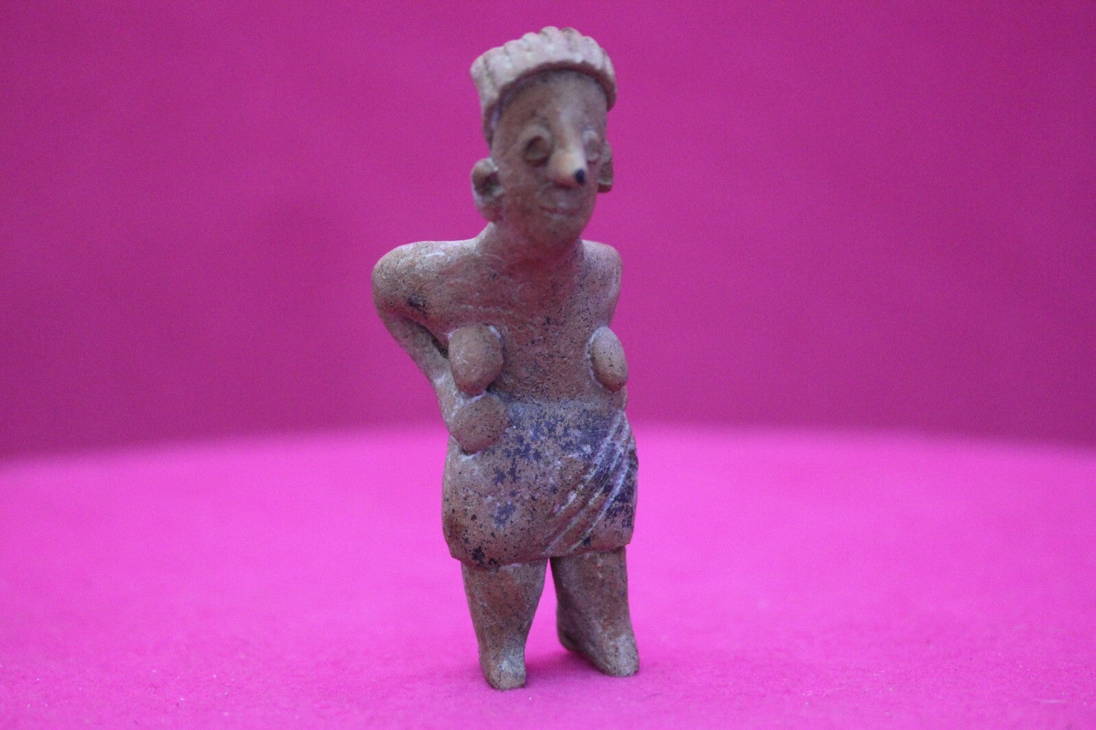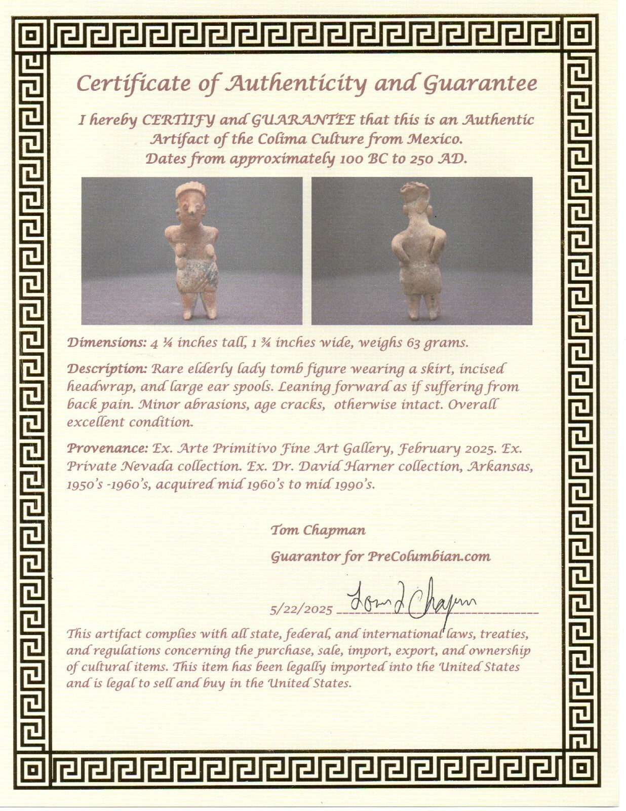 Dimensions: 4 ¼ inches tall, 1 ¾ inches wide, weighs 63 grams.Description: Rare elderly lady tomb figure wearing a skirt, incised headwrap, and large ear spools. Leaning forward as if suffering from back pain. Minor abrasions, age cracks, otherwise intact. Overall excellent condition.Provenance: Ex. Arte Primitivo Fine Art Gallery, February 2025. Ex. Private Nevada collection. Ex. Dr. David Harner collection, Arkansas, 1950’s -1960’s, acquired mid 1960’s to mid 1990’s.