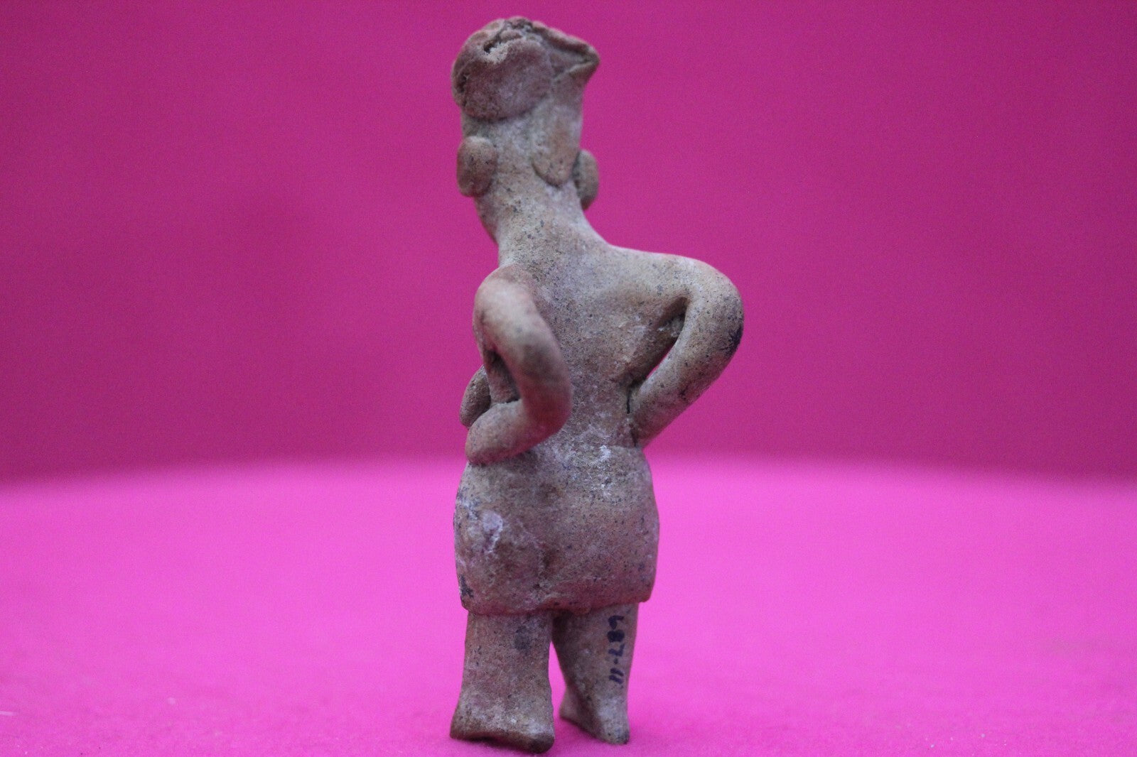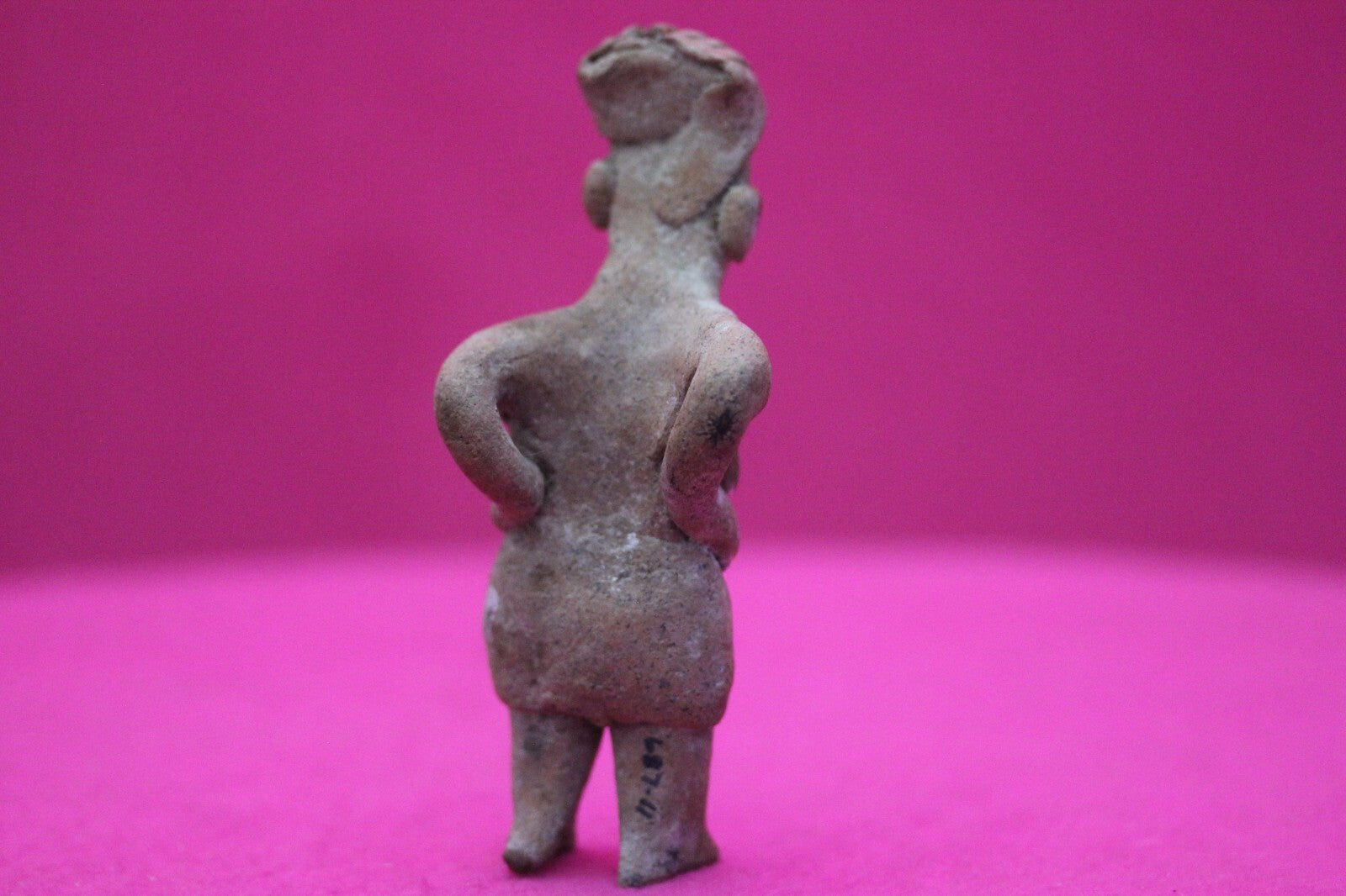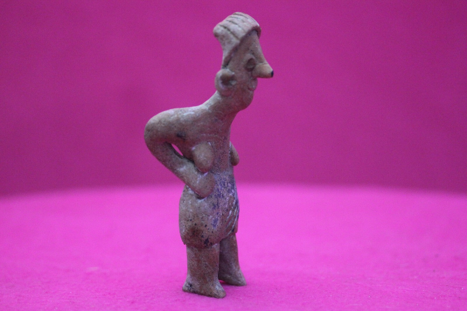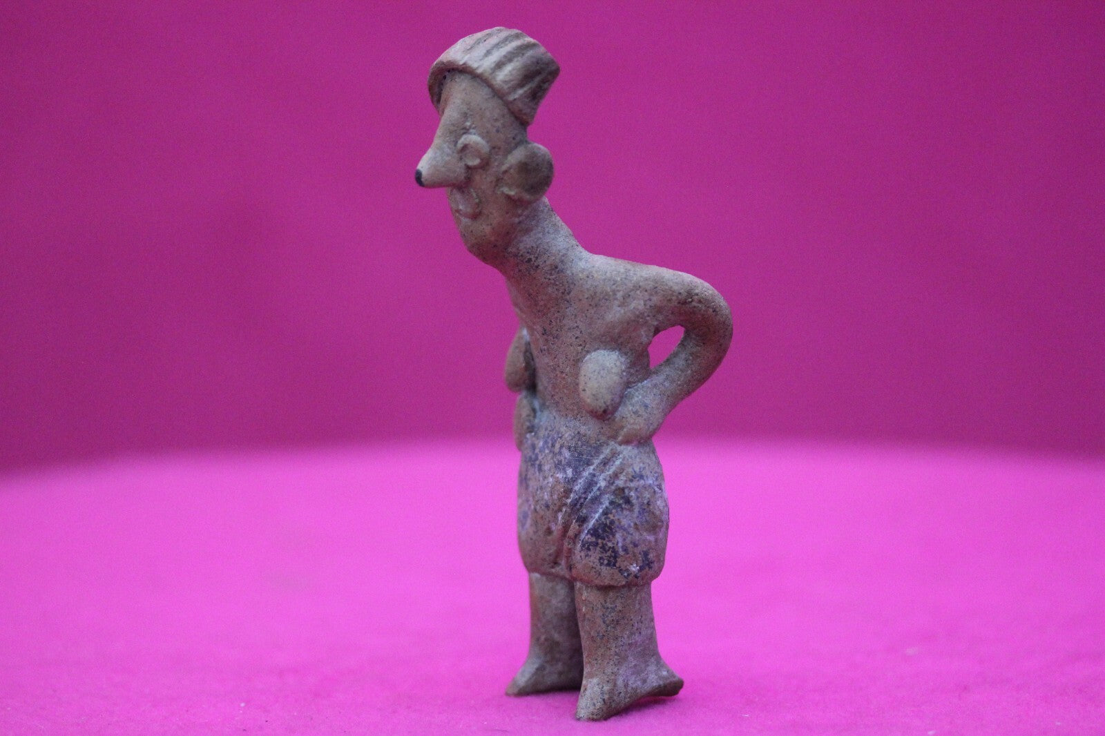 Dimensions: 4 ¼ inches tall, 1 ¾ inches wide, weighs 63 grams.Description: Rare elderly lady tomb figure wearing a skirt, incised headwrap, and large ear spools. Leaning forward as if suffering from back pain. Minor abrasions, age cracks, otherwise intact. Overall excellent condition.Provenance: Ex. Arte Primitivo Fine Art Gallery, February 2025. Ex. Private Nevada collection. Ex. Dr. David Harner collection, Arkansas, 1950’s -1960’s, acquired mid 1960’s to mid 1990’s.