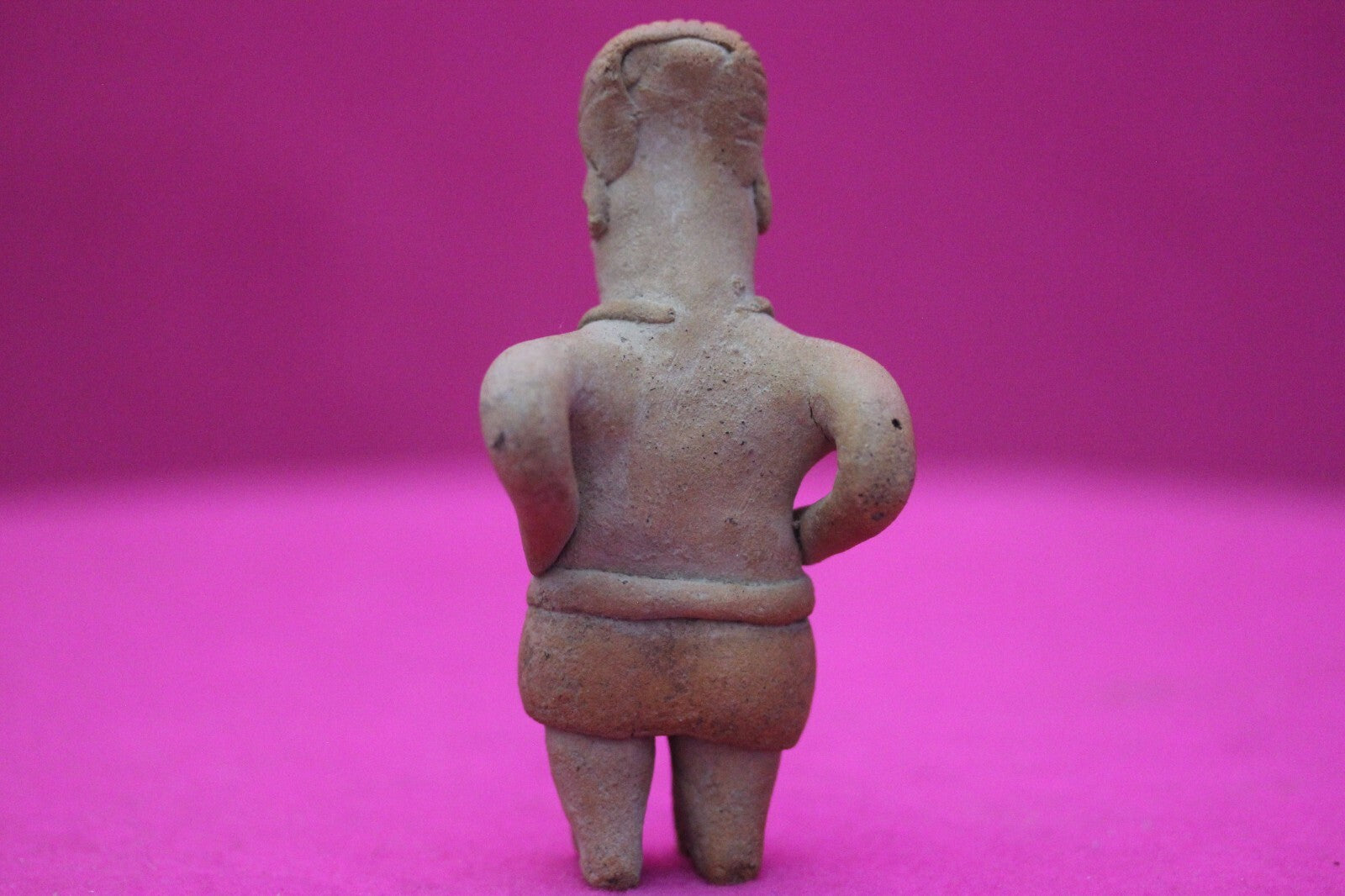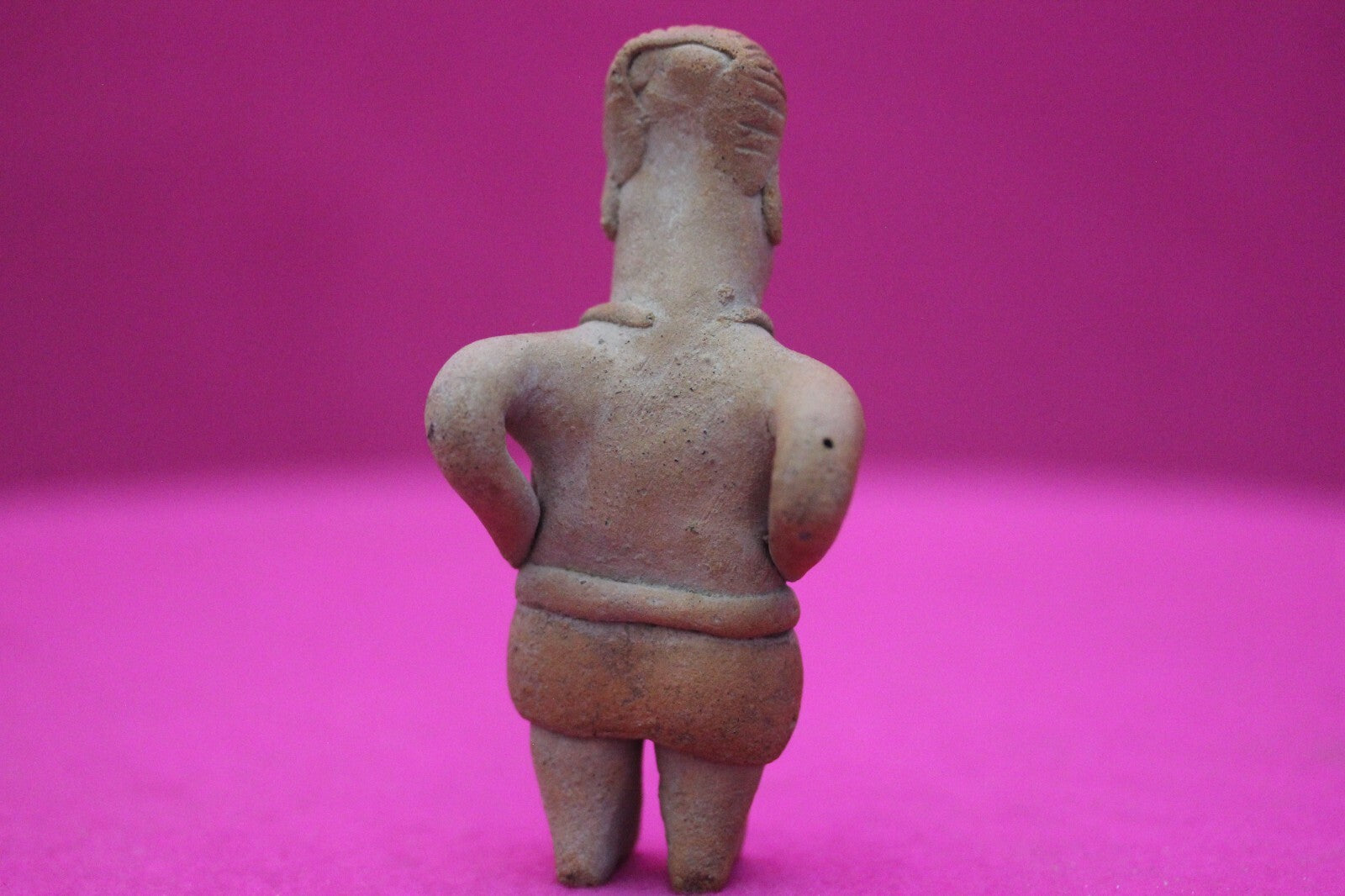 Dimensions: 3 ½ inches tall, 1 ¾ inches wide, weighs 48 grams.Description: Rare elderly lady tomb figure wearing a skirt, incised headwrap, necklace, and belt. Leaning forward as if suffering from back pain. Minor abrasions, otherwise intact. Overall excellent condition.Provenance: Ex. Arte Primitivo Fine Art Gallery, February 2025. Ex. Private Nevada collection. Ex. Dr. David Harner collection, Arkansas, 1950’s -1960’s, acquired mid 1960’s to mid 1990’s.