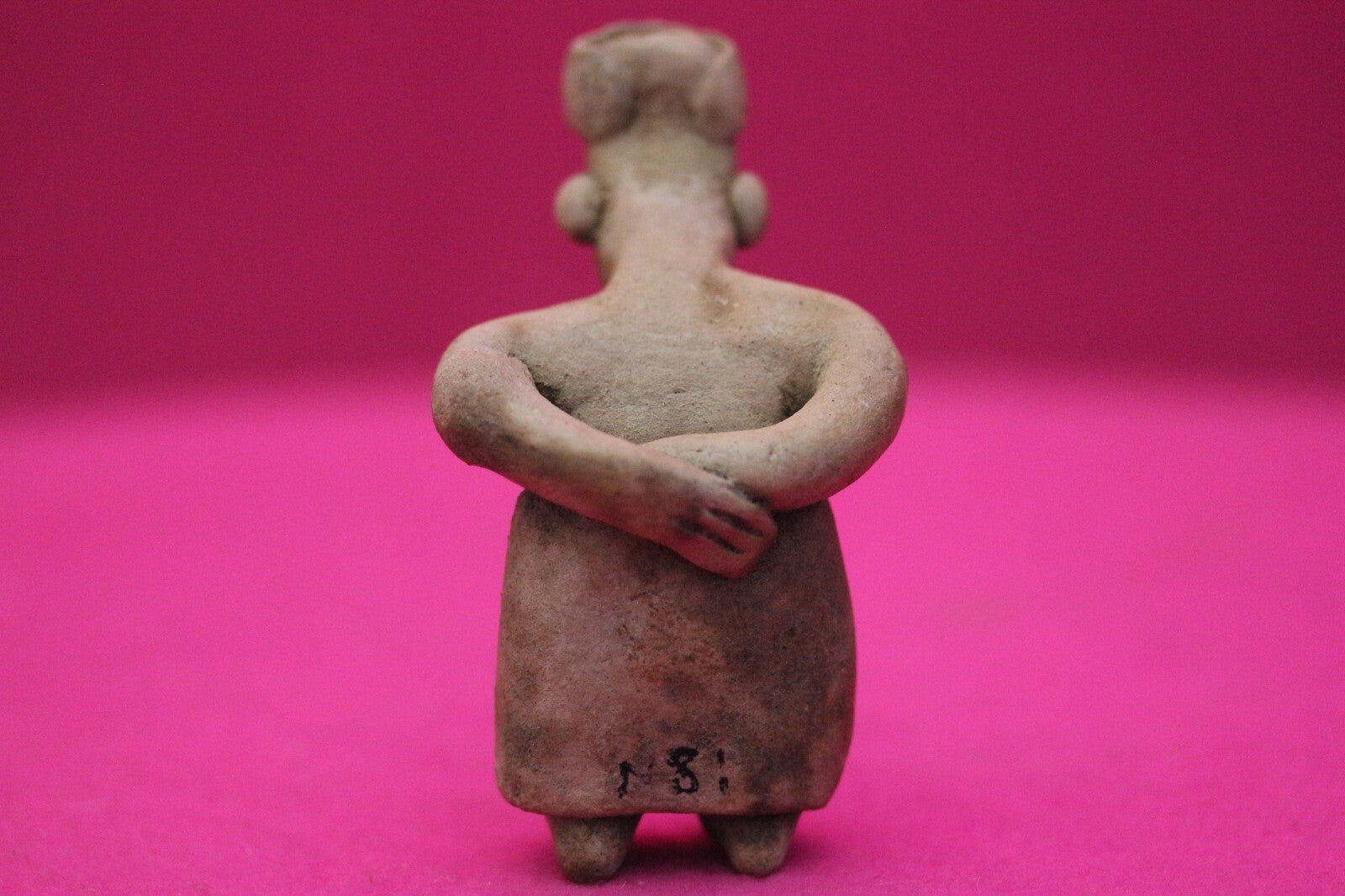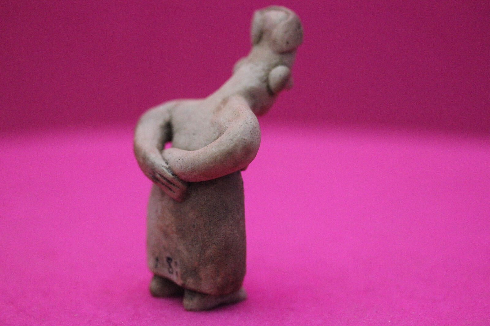 Dimensions: 3 inches tall, 1 ¾ inches wide, weighs 56 grams.Description: Rare elderly lady tomb figure wearing a skirt, incised headwrap, and large earspools. Leaning forward as if suffering from back pain. Minor abrasions, otherwise intact. Overall excellent condition.Provenance: Ex. Arte Primitivo Fine Art Gallery, February 2025. Ex. Private Nevada collection. Ex. Dr. David Harner collection, Arkansas, 1950’s -1960’s, acquired mid 1960’s to mid 1990’s.