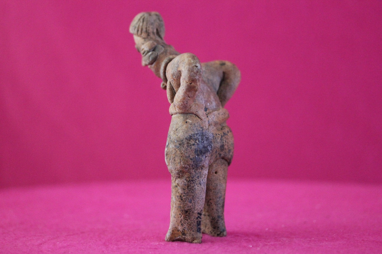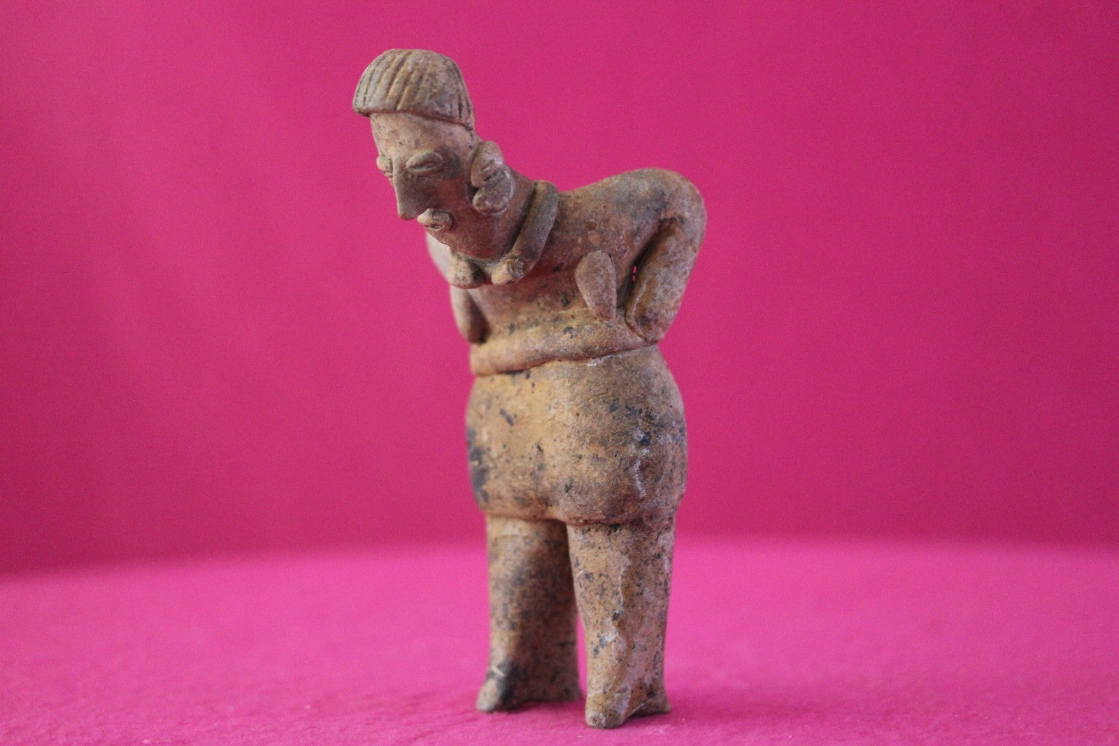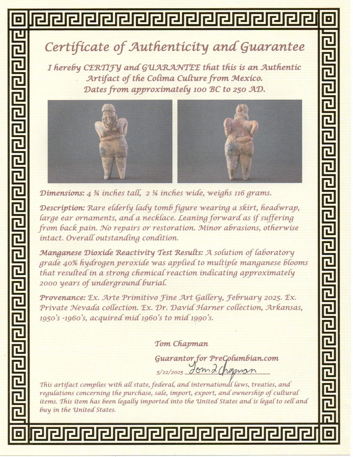 Dimensions: 4 ¾ inches tall, 2 ¼ inches wide, weighs 116 grams.Description: Rare elderly lady tomb figure wearing a skirt, headwrap, large ear ornaments, and a necklace. Leaning forward as if suffering from back pain. No repairs or restoration. Minor abrasions, otherwise intact. Overall outstanding condition.Manganese Dioxide Reactivity Test Results: A solution of laboratory grade 40% hydrogen peroxide was applied to multiple manganese blooms that resulted in a strong chemical reaction indicating approximately 2000 years of underground burial.Provenance: Ex. Arte Primitivo Fine Art Gallery, February 2025. Ex. Private Nevada collection. Ex. Dr. David Harner collection, Arkansas, 1950’s -1960’s, acquired mid 1960’s to mid 1990’s.