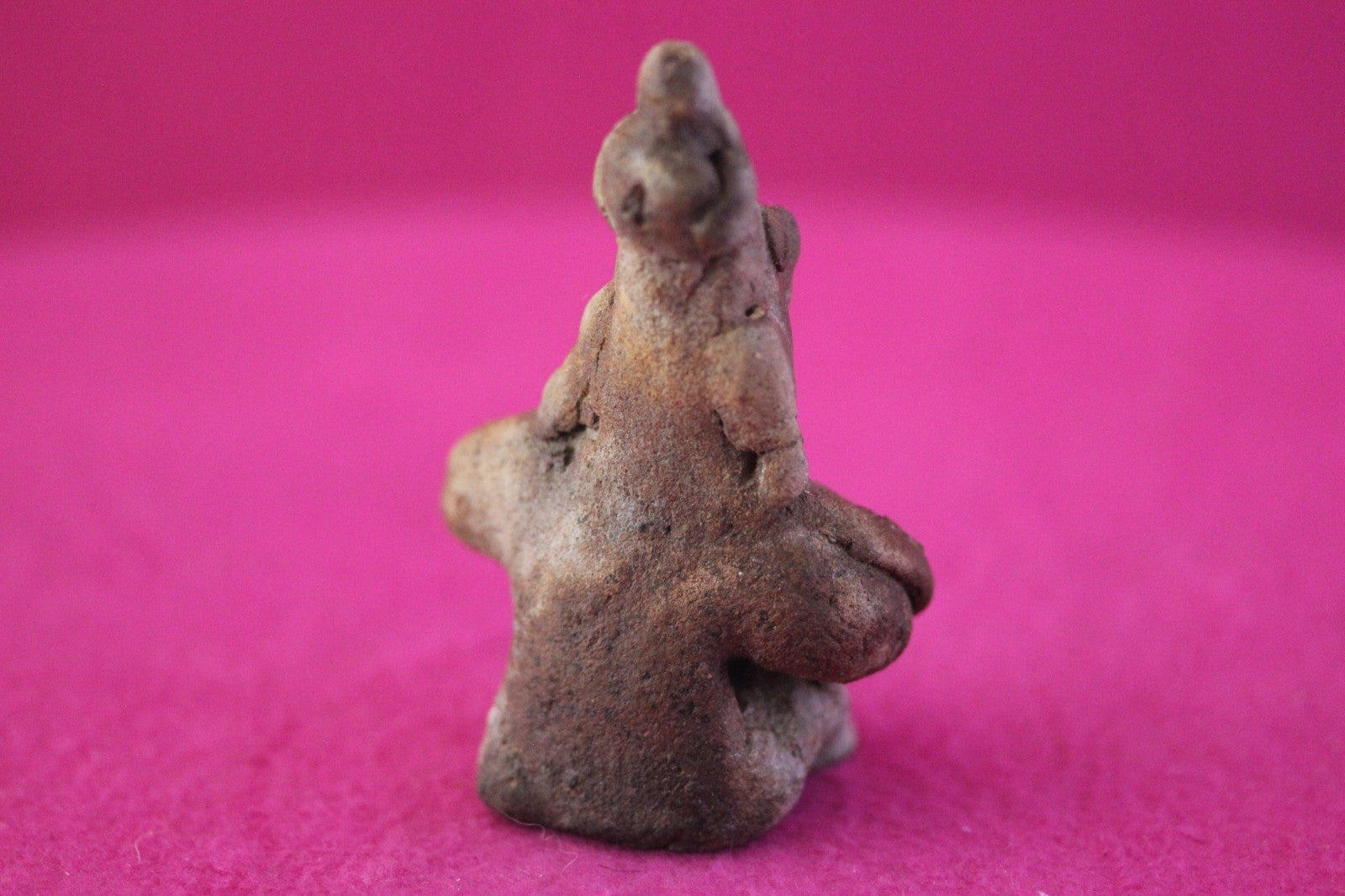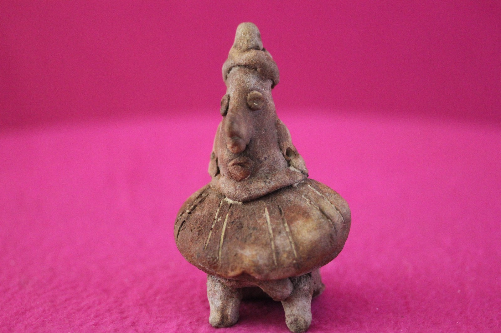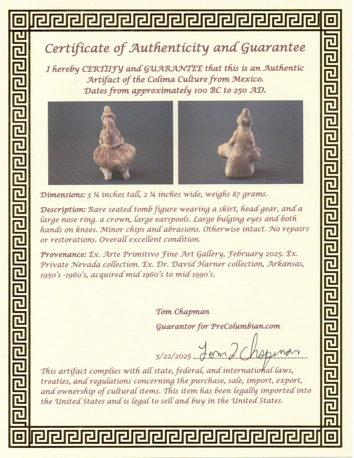 Dimensions: 3 ¼ inches tall, 2 ¼ inches wide, weighs 87 grams.Description: Rare seated tomb figure wearing a skirt, head gear, and a large nose ring. a crown, large earspools. Large bulging eyes and both hands on knees. Minor chips and abrasions. Otherwise intact. No repairs or restorations. Overall excellent condition.Provenance: Ex. Arte Primitivo Fine Art Gallery, February 2025. Ex. Private Nevada collection. Ex. Dr. David Harner collection, Arkansas, 1950’s -1960’s, acquired mid 1960’s to mid 1990’s.