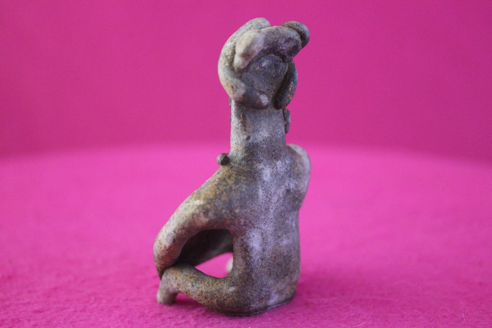 Dimensions: 4 ¼ inches tall, 3 inches wide, weighs 115 grams.Description: Rare skirted seated tomb figure wearing elaborate headwear, necklace, large ear rings. Left ear and right half of the necklace missing. Minor chips and abrasions. Otherwise intact. No repairs or restorations. Overall excellent condition.Manganese Dioxide Reactivity Test Results: A solution of laboratory grade 40% hydrogen peroxide was applied to multiple manganese blooms that resulted in a strong chemical reaction indicating approximately 2000 years of underground burial.Provenance: Ex. Arte Primitivo Fine Art Gallery, February 2025. Ex. Private Nevada collection. Ex. Dr. David Harner collection, Arkansas, 1950’s -1960’s, acquired mid 1960’s to mid 1990’s.