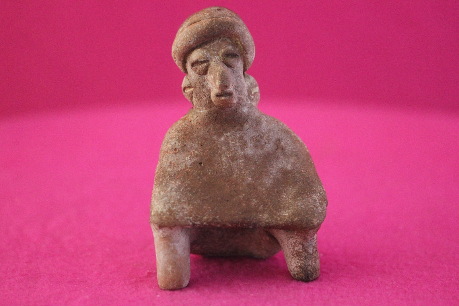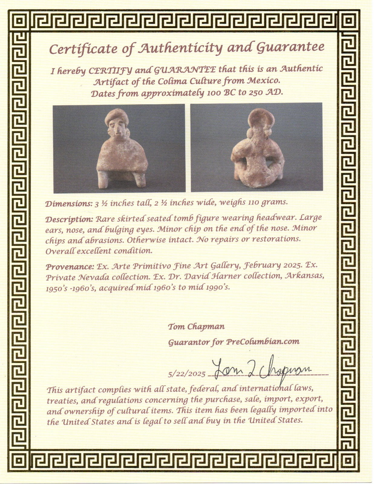 Dimensions: 3 ½ inches tall, 2 ½ inches wide, weighs 110 grams.Description: Rare skirted seated tomb figure wearing headwear. Large ears, nose, and bulging eyes. Minor chip on the end of the nose. Minor chips and abrasions. Otherwise intact. No repairs or restorations. Overall excellent condition.Provenance: Ex. Arte Primitivo Fine Art Gallery, February 2025. Ex. Private Nevada collection. Ex. Dr. David Harner collection, Arkansas, 1950’s -1960’s, acquired mid 1960’s to mid 1990’s.