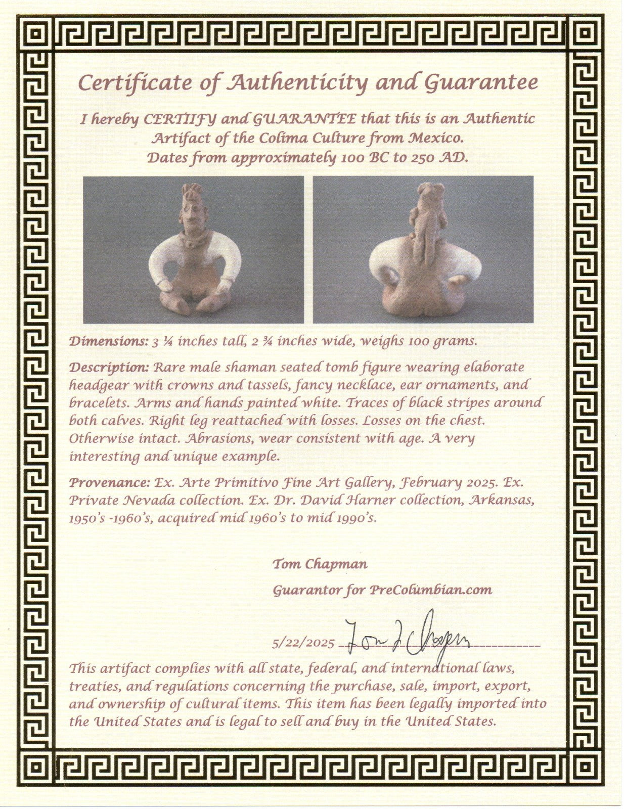 Dimensions: 3 ¼ inches tall, 2 ¾ inches wide, weighs 100 grams.Description: Rare male shaman seated tomb figure wearing elaborate headgear with crowns and tassels, fancy necklace, ear ornaments, and bracelets. Arms and hands painted white. Traces of black stripes around both calves. Right leg reattached with losses. Losses on the chest. Otherwise intact. Abrasions, wear consistent with age. A very interesting and unique example.Provenance: Ex. Arte Primitivo Fine Art Gallery, February 2025. Ex. Private Nevada collection. Ex. Dr. David Harner collection, Arkansas, 1950’s -1960’s, acquired mid 1960’s to mid 1990’s.