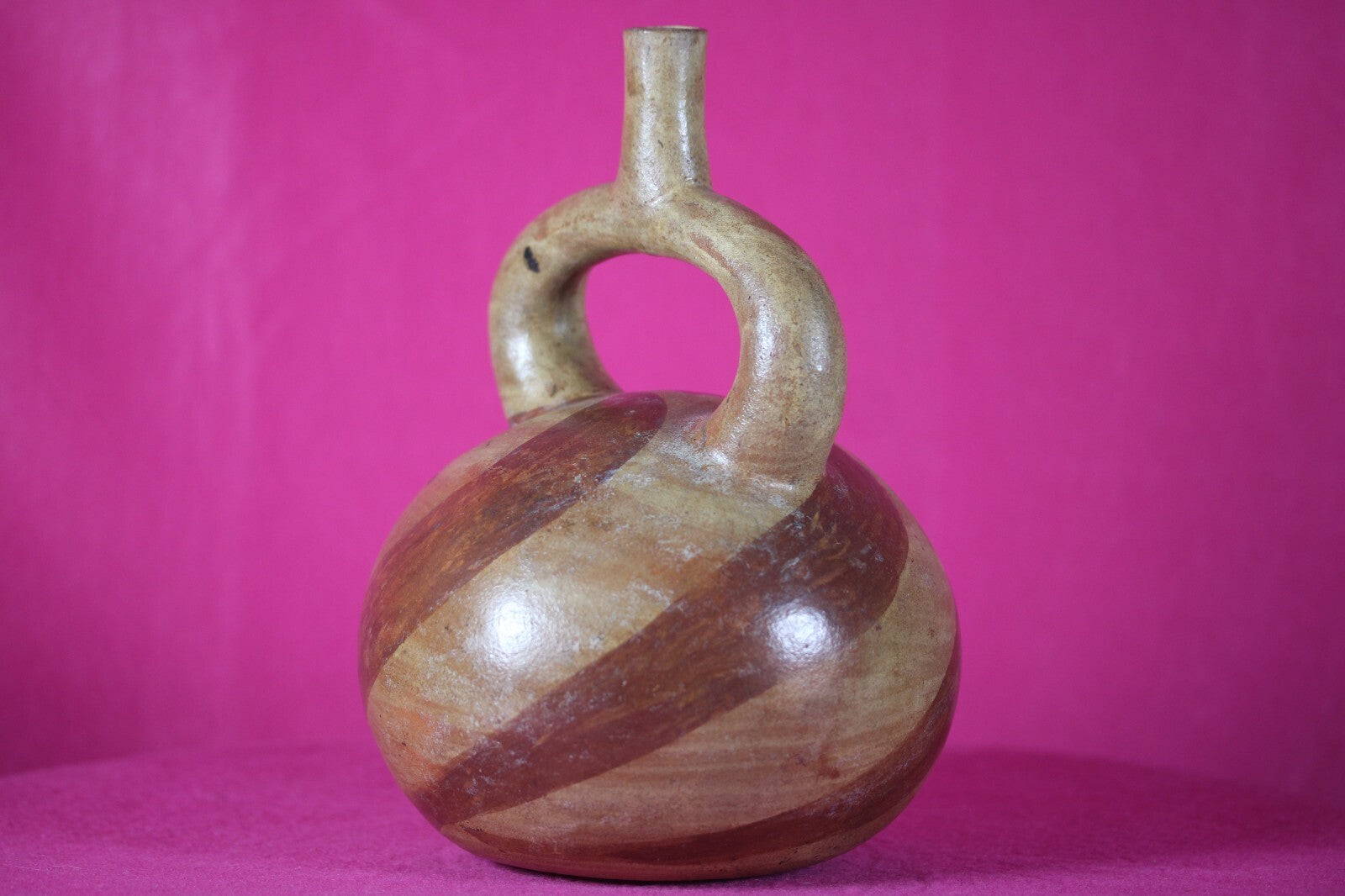 Museum Quality. Pottery vessel having a bulbous body and stirrup type spout, decorated with large painted red-brown swirls. Scattered mineral and surface deposits. Totally intact.