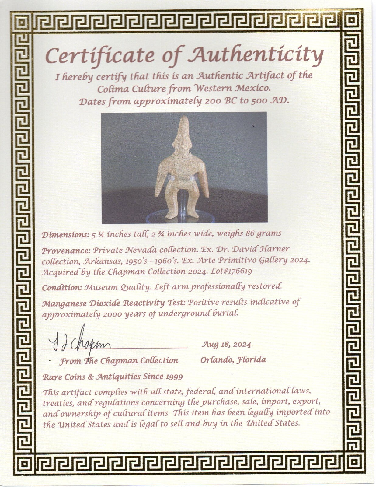 Acquired from the world renowned Arte Primitivo Gallery in Downtown Manhattan, New York City. This is the most prestigious gallery of ancient artifacts in the United States. Artifacts from Arte Primitivo are the most sought after in the world. They are instantly recognized and respected by antiquities dealers and collectors alike as being the best of the best. Artifacts that are authenticated by Arte Primitivo instantly increase in value due to their expertise and decades of experience. They are the go to experts when it comes to ancient art. Provenance: Private Nevada collection. Ex. Dr. David Harner collection, Arkansas, 1950’s - 1960’s. Ex. Arte Primitivo Gallery 2024. Acquired by the Chapman Collection 2024. Lot#176619. Condition: Museum Quality. Left arm professionally restored.Manganese Dioxide Reactivity Test: Positive results indicative of approximately 2000 years of underground burial.