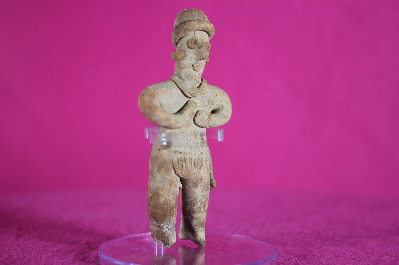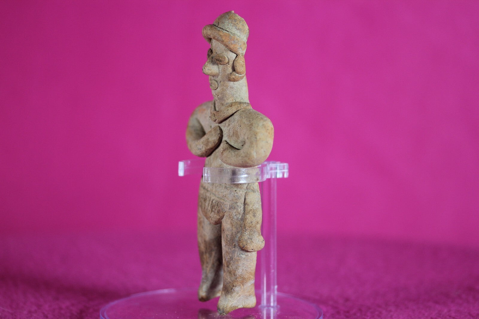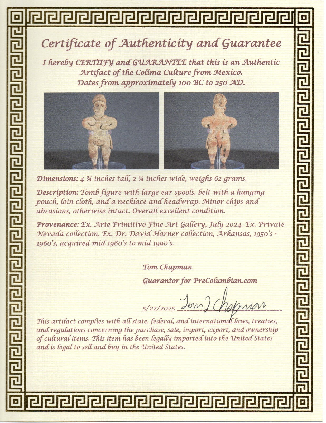 Dimensions: 4 ¼ inches tall, 2 ¼ inches wide, weighs 49 grams.Description: Tomb figure with large ear spools, belt with a hanging pouch, loin cloth, and an elaborate necklace and headwrap. Minor chips and abrasions, otherwise intact. Overall excellent condition.Provenance: Ex. Arte Primitivo Fine Art Gallery, July 2024. Ex. Private Nevada collection. Ex. Dr. David Harner collection, Arkansas, 1950’s -1960’s, acquired mid 1960’s to mid 1990’s.