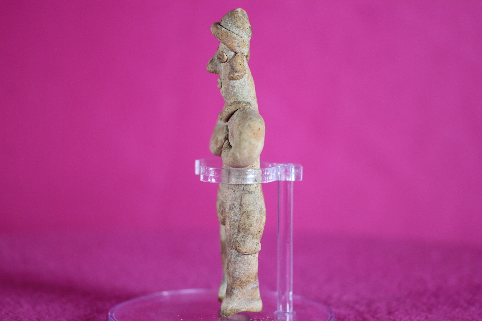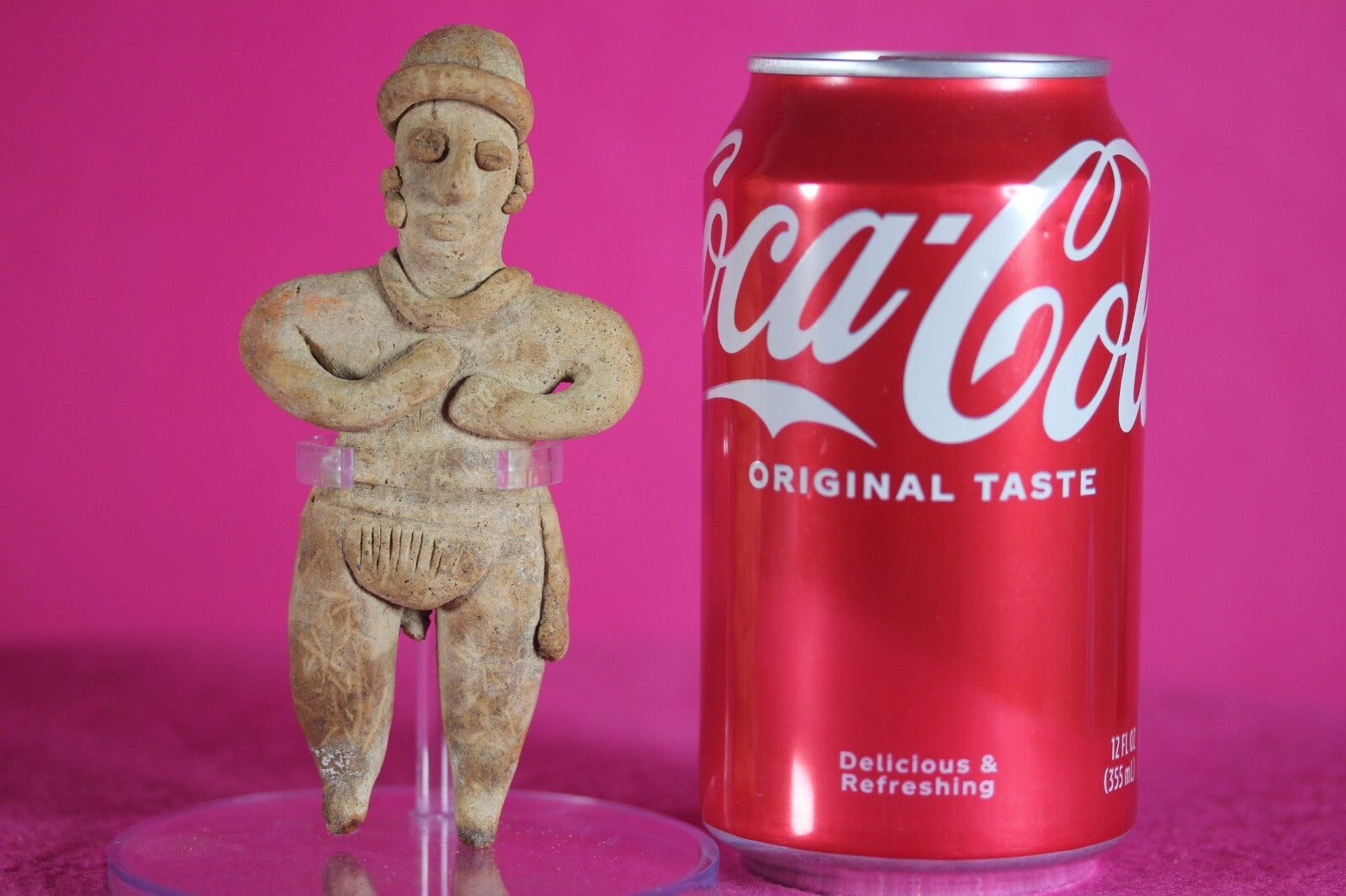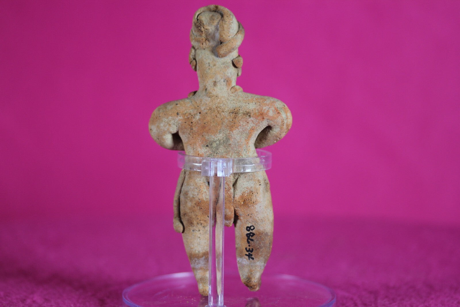 Dimensions: 4 ¼ inches tall, 2 ¼ inches wide, weighs 49 grams.Description: Tomb figure with large ear spools, belt with a hanging pouch, loin cloth, and an elaborate necklace and headwrap. Minor chips and abrasions, otherwise intact. Overall excellent condition.Provenance: Ex. Arte Primitivo Fine Art Gallery, July 2024. Ex. Private Nevada collection. Ex. Dr. David Harner collection, Arkansas, 1950’s -1960’s, acquired mid 1960’s to mid 1990’s.