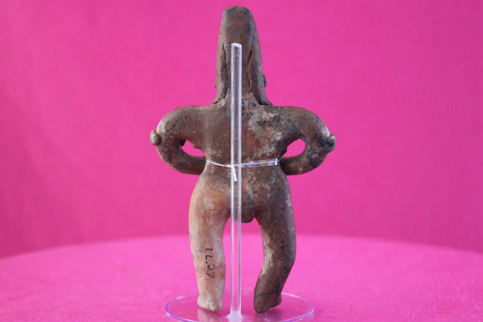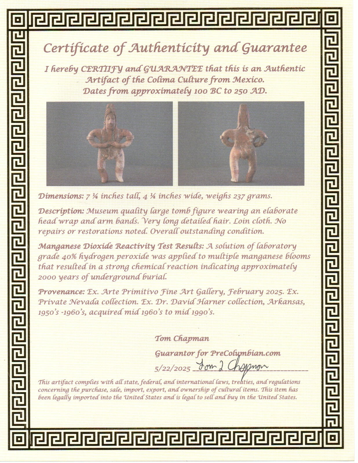 Dimensions: 7 ¼ inches tall, 4 ¼ inches wide, weighs 237 grams.Description: Museum quality large tomb figure wearing an elaborate head wrap and arm bands. Very long detailed hair. Loin cloth. No repairs or restorations noted. Overall outstanding condition.Manganese Dioxide Reactivity Test Results: A solution of laboratory grade 40% hydrogen peroxide was applied to multiple manganese blooms that resulted in a strong chemical reaction indicating approximately 2000 years of underground burial.Provenance: Ex. Arte Primitivo Fine Art Gallery, February 2025. Ex. Private Nevada collection. Ex. Dr. David Harner collection, Arkansas, 1950’s -1960’s, acquired mid 1960’s to mid 1990’s.
