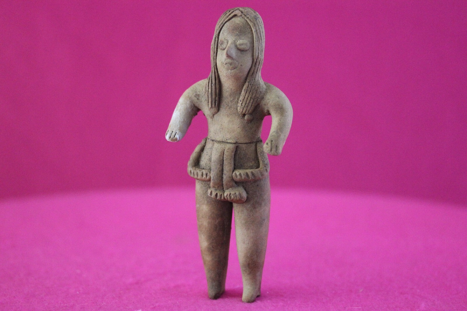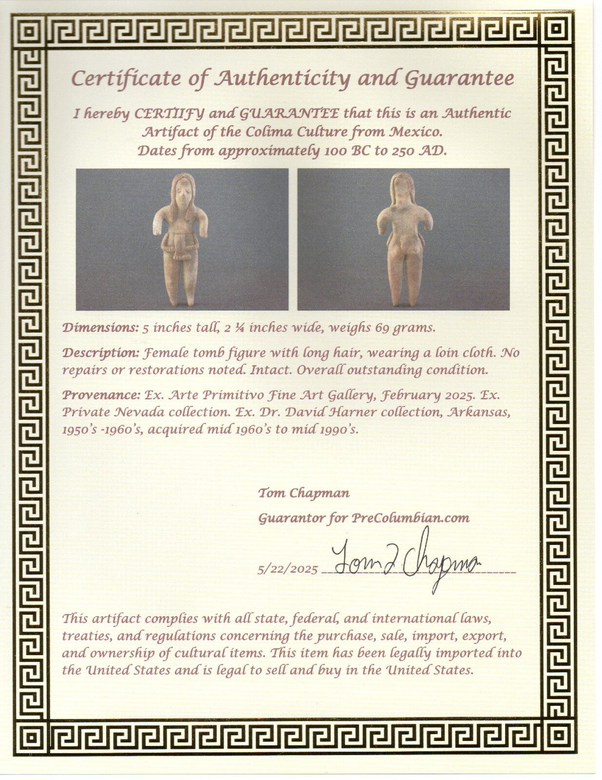Dimensions: 5 inches tall, 2 ¼ inches wide, weighs 69 grams.Description: Female tomb figure with long hair, wearing a loin cloth. No repairs or restorations noted. Intact. Overall outstanding condition.Provenance: Ex. Arte Primitivo Fine Art Gallery, February 2025. Ex. Private Nevada collection. Ex. Dr. David Harner collection, Arkansas, 1950’s -1960’s, acquired mid 1960’s to mid 1990’s.