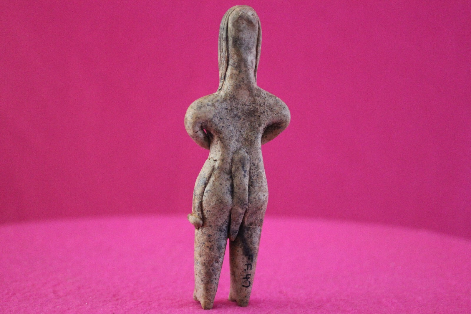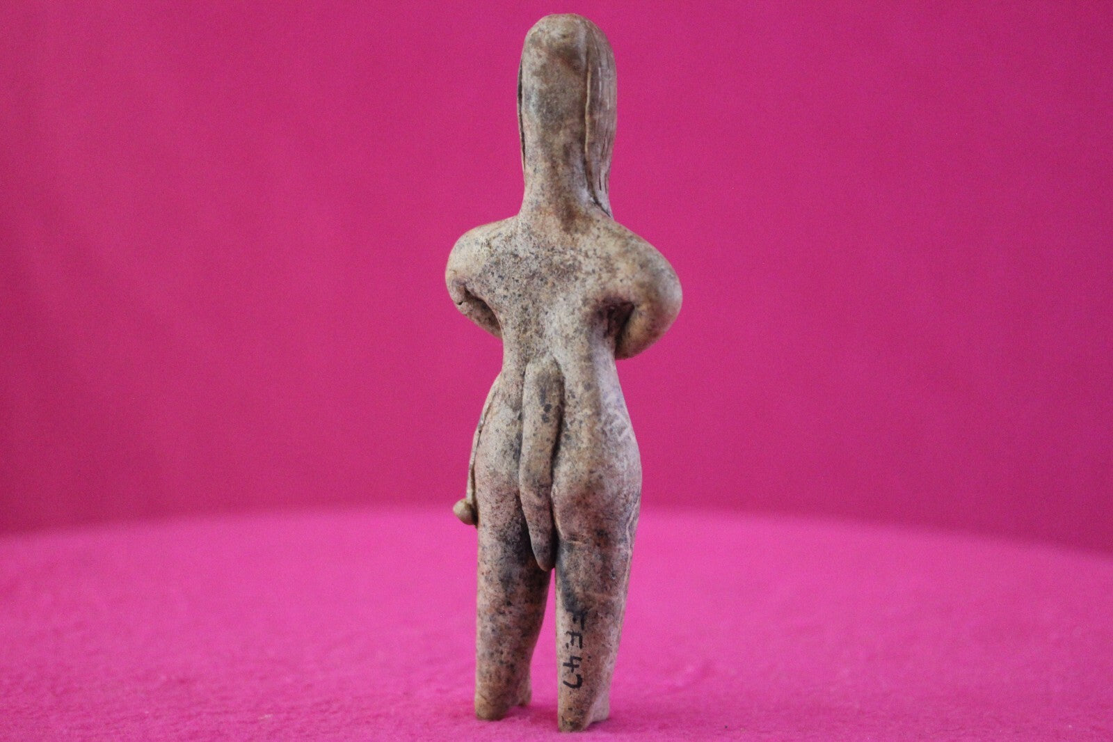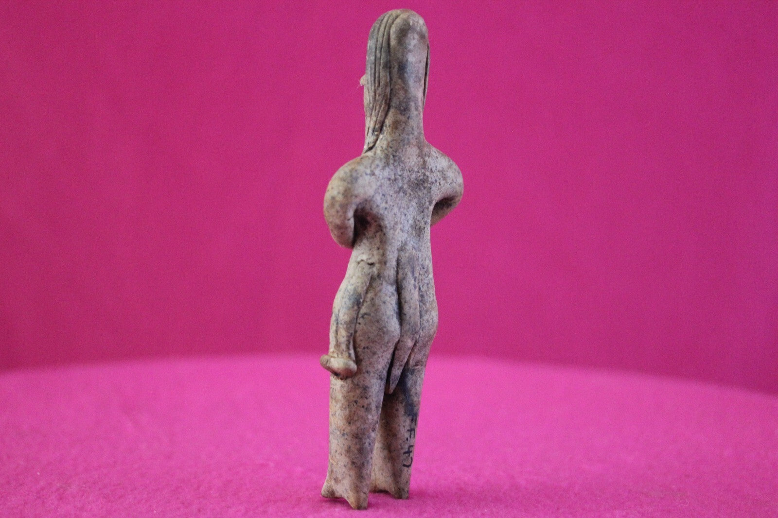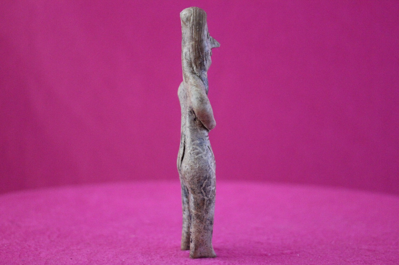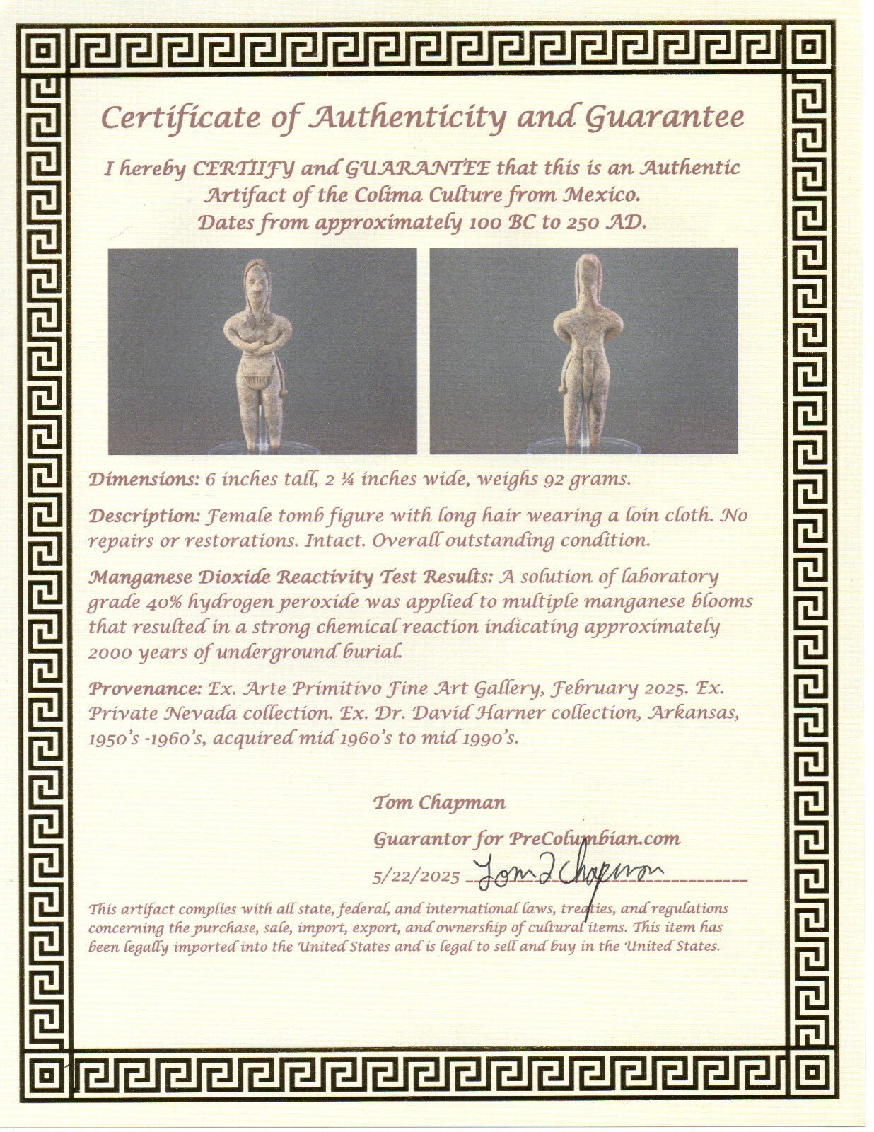 Dimensions: 6 inches tall, 2 ¼ inches wide, weighs 92 grams.Description: Female tomb figure with long hair wearing a loin cloth. No repairs or restorations. Intact. Overall outstanding condition.Manganese Dioxide Reactivity Test Results: A solution of laboratory grade 40% hydrogen peroxide was applied to multiple manganese blooms that resulted in a strong chemical reaction indicating approximately 2000 years of underground burial.Provenance: Ex. Arte Primitivo Fine Art Gallery, February 2025. Ex. Private Nevada collection. Ex. Dr. David Harner collection, Arkansas, 1950’s -1960’s, acquired mid 1960’s to mid 1990’s.
