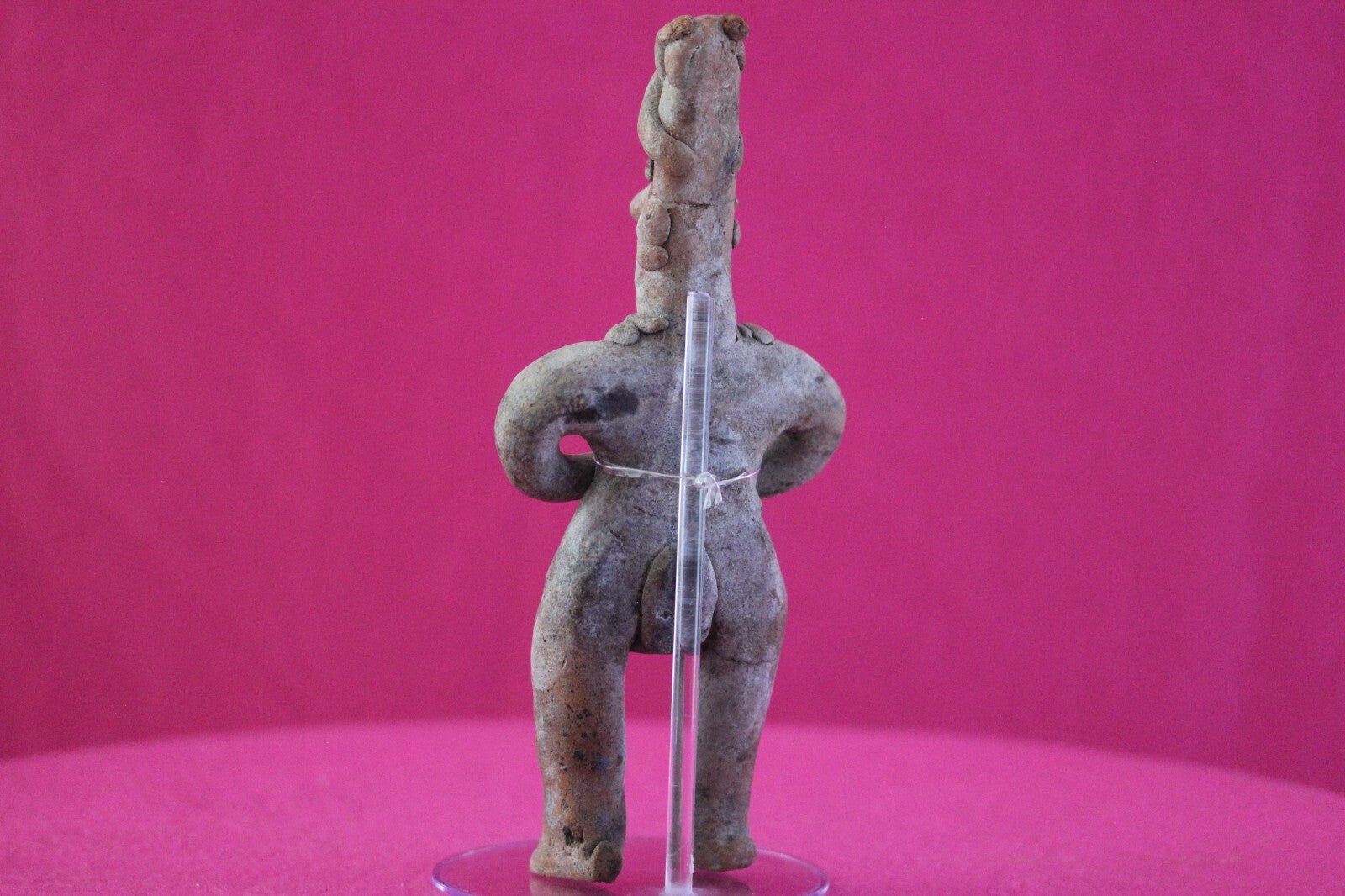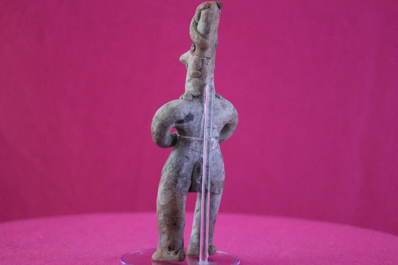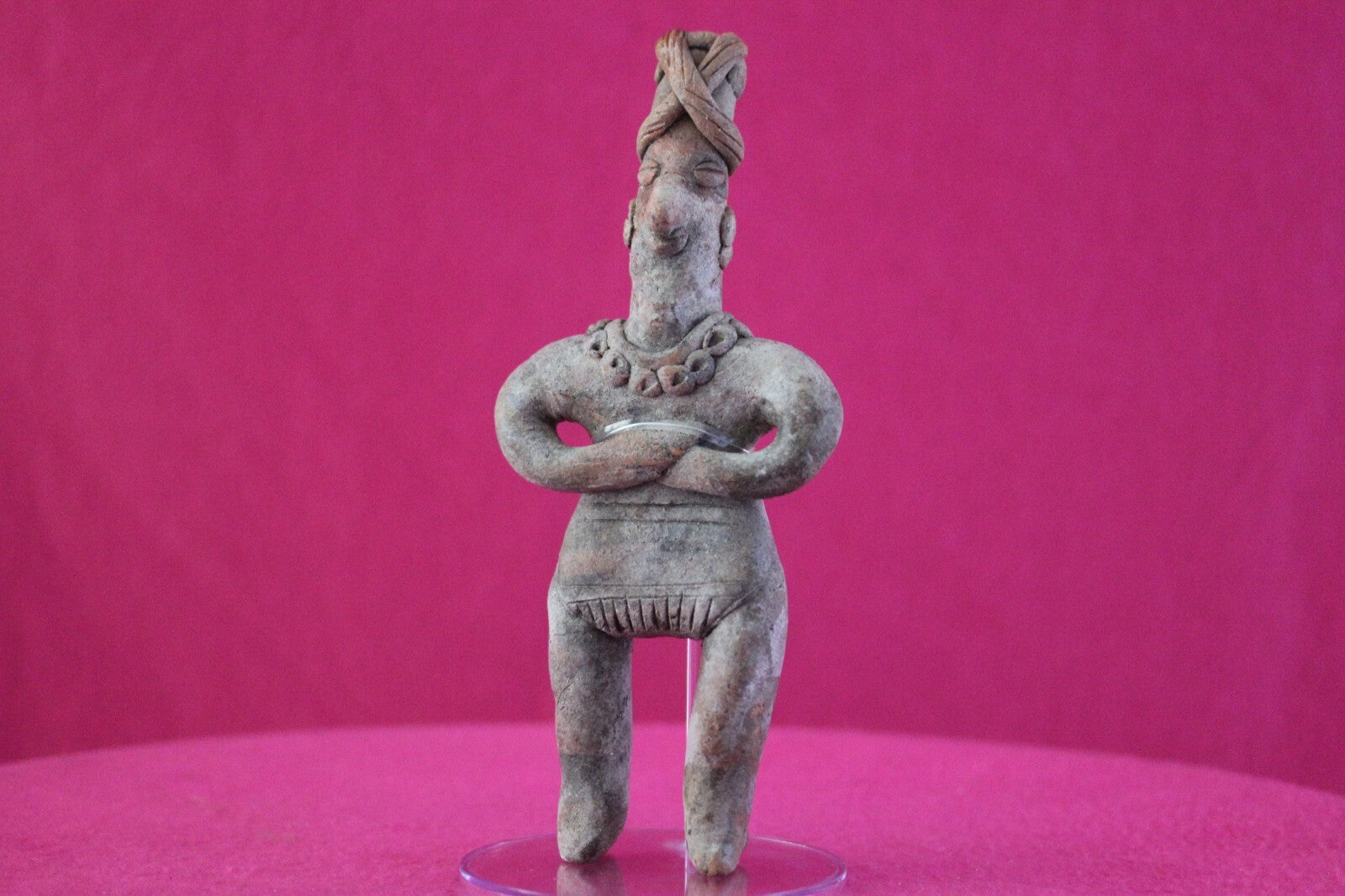 Dimensions: 7 ¾ inches tall, 3 ¼ inches wide, weighs 230 grams.Description: Large tomb figure wearing an elaborate head wrap and necklace, large ear spools, and a loin cloth. Traces of black bars painted on the torso. No repairs or restorations. Intact. Overall outstanding condition.Manganese Dioxide Reactivity Test Results: A solution of laboratory grade 40% hydrogen peroxide was applied to multiple manganese blooms that resulted in a strong chemical reaction indicating approximately 2000 years of underground burial.Provenance: Ex. Arte Primitivo Fine Art Gallery, February 2025. Ex. Private Nevada collection. Ex. Dr. David Harner collection, Arkansas, 1950’s -1960’s, acquired mid 1960’s to mid 1990’s.