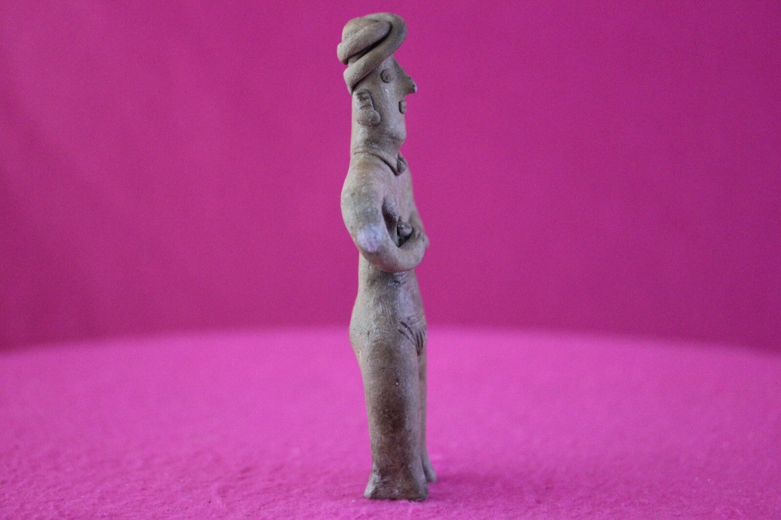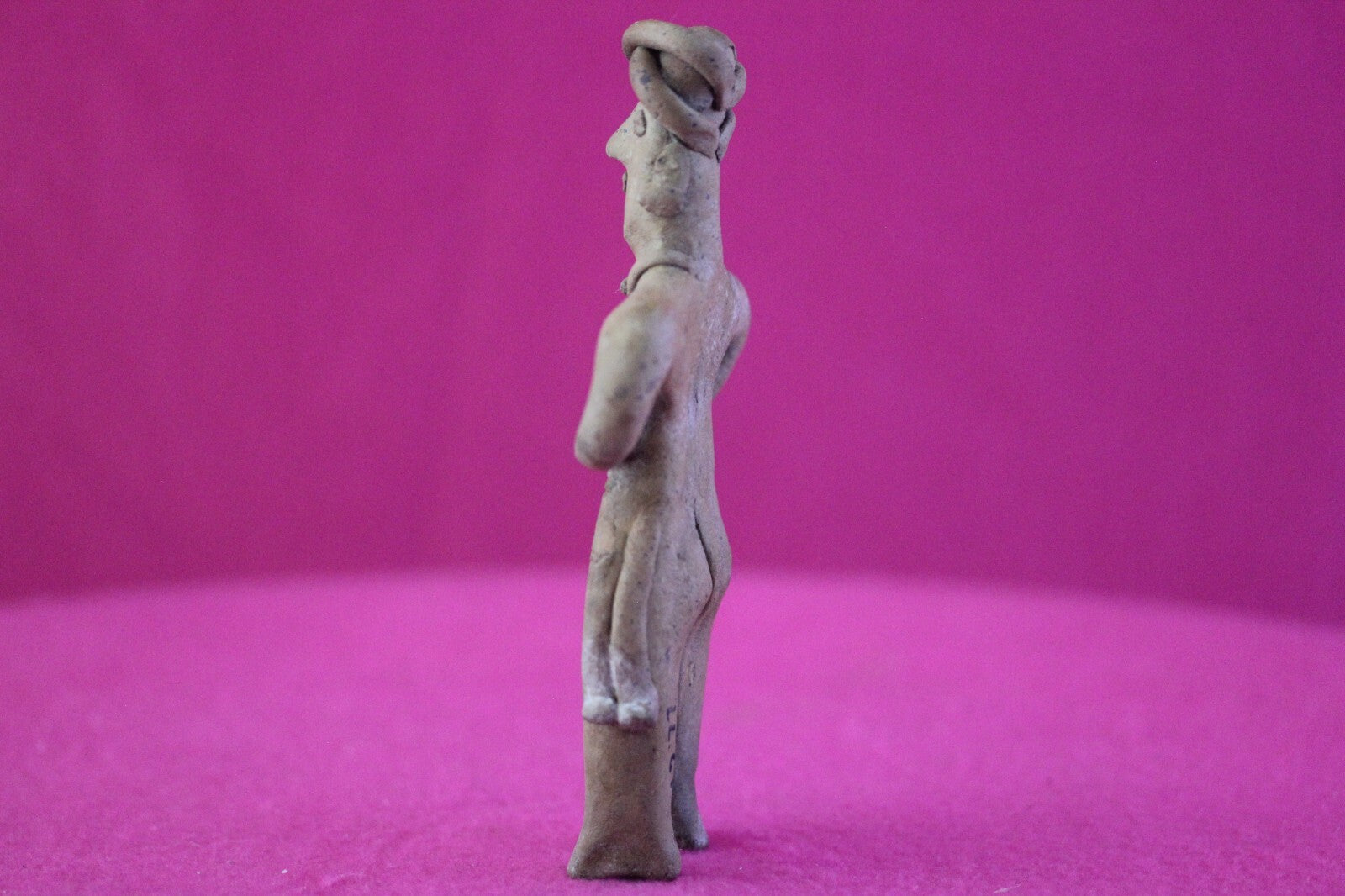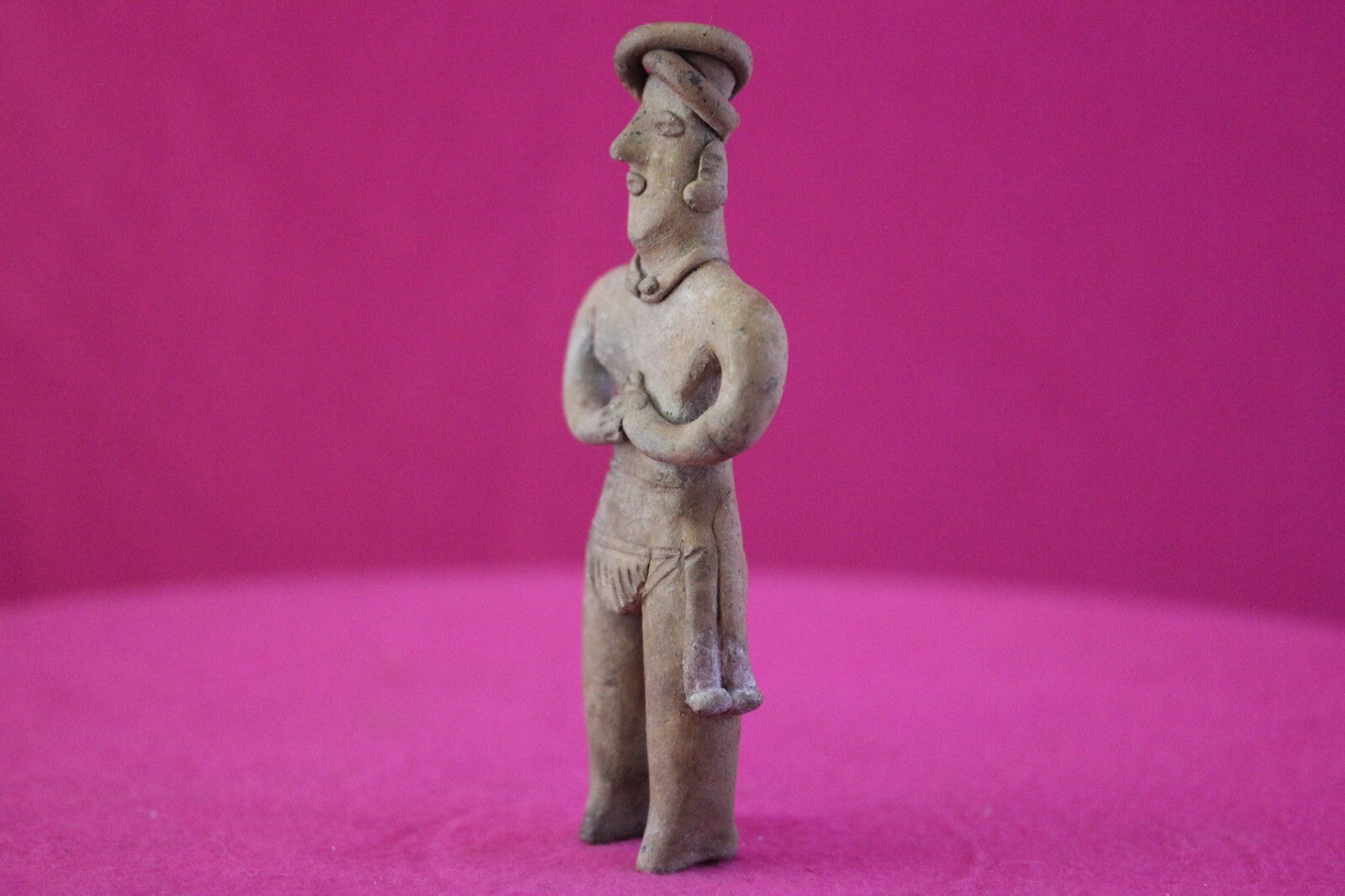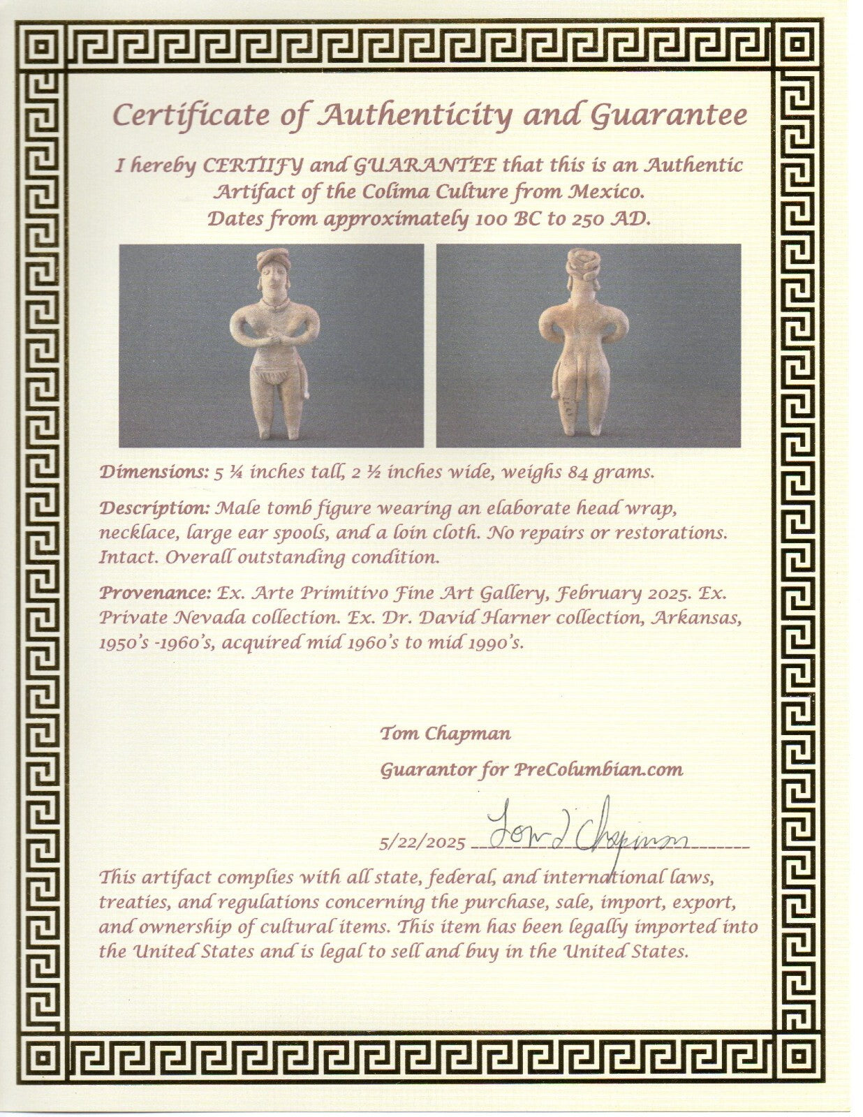 Dimensions: 5 ¼ inches tall, 2 ½ inches wide, weighs 84 grams.Description: Male tomb figure wearing an elaborate head wrap, necklace, large ear spools, and a loin cloth. No repairs or restorations. Intact. Overall outstanding condition.Provenance: Ex. Arte Primitivo Fine Art Gallery, February 2025. Ex. Private Nevada collection. Ex. Dr. David Harner collection, Arkansas, 1950’s -1960’s, acquired mid 1960’s to mid 1990’s.