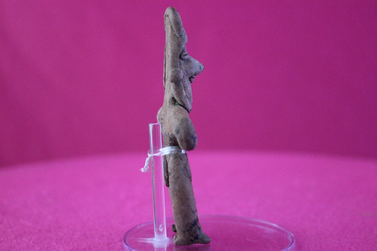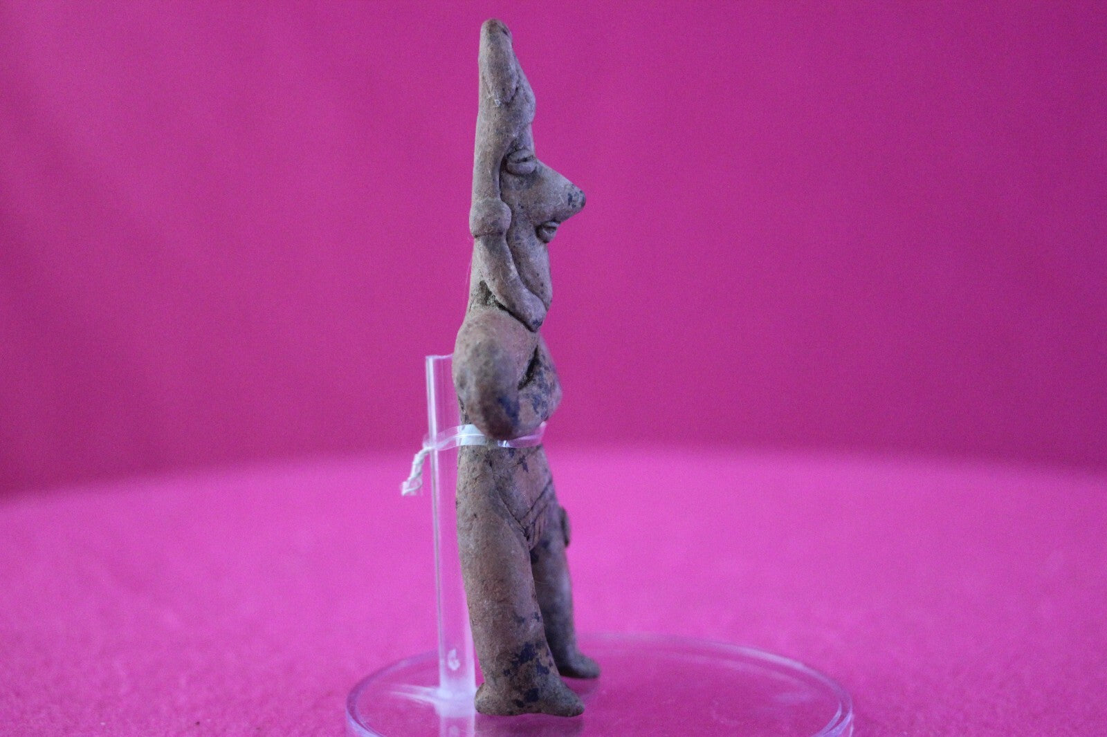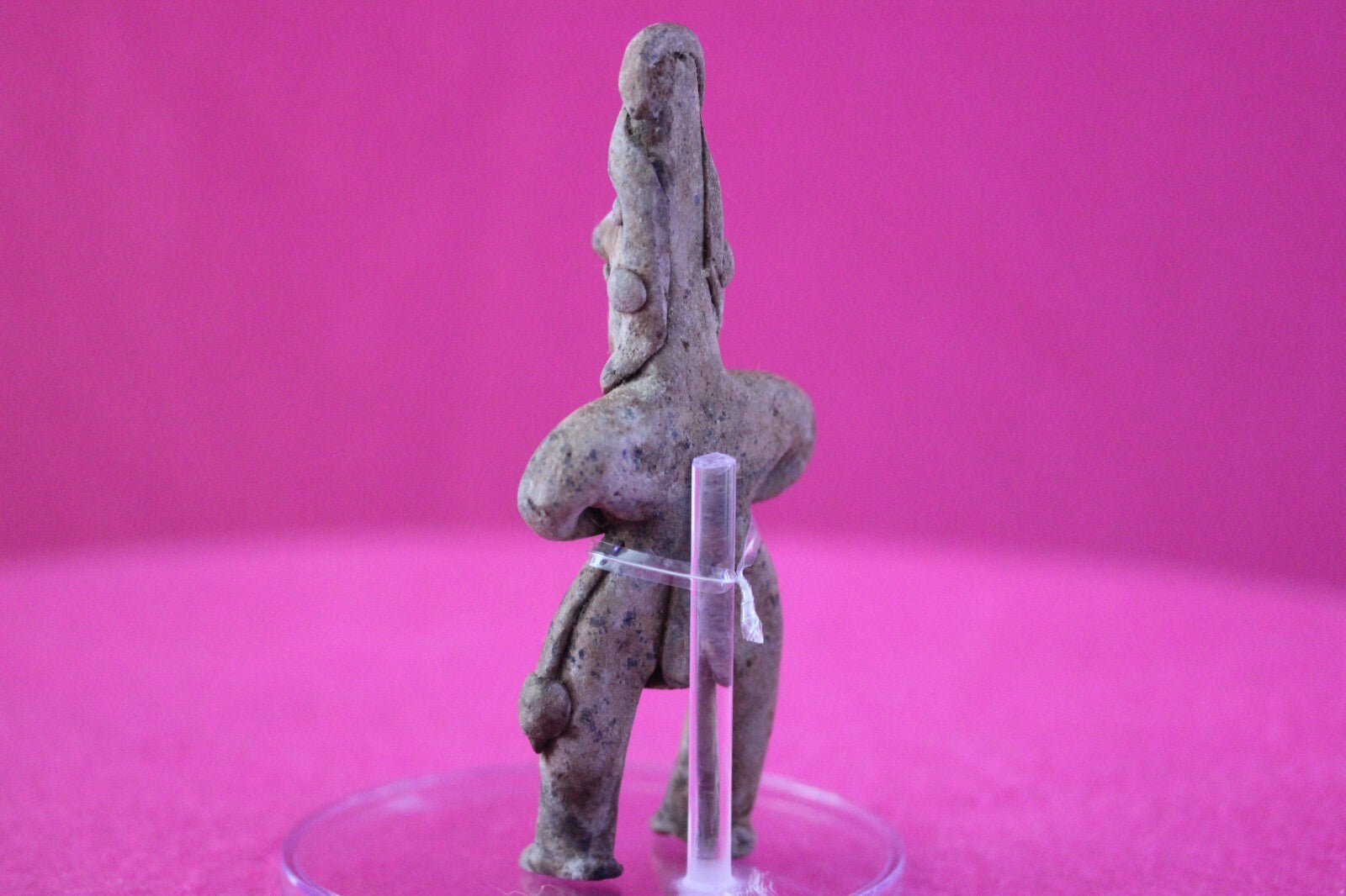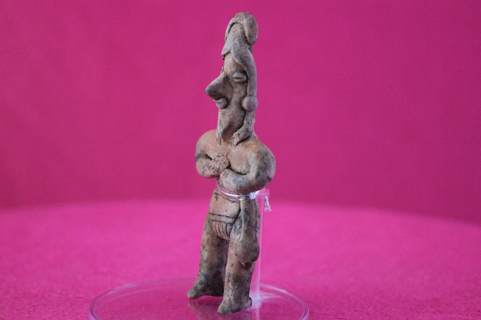 Dimensions: 4 ¾ inches tall, 2 inches wide, weighs 59 grams.Description: Tomb figure wearing an elaborate head wrap, necklace, and large ear spools, and a loin cloth. No repairs or restorations. Intact. Overall outstanding condition.Manganese Dioxide Reactivity Test Results: A solution of laboratory grade 40% hydrogen peroxide was applied to multiple manganese blooms that resulted in a strong chemical reaction indicating approximately 2000 years of underground burial.Provenance: Ex. Arte Primitivo Fine Art Gallery, February 2025. Ex. Private Nevada collection. Ex. Dr. David Harner collection, Arkansas, 1950’s -1960’s, acquired mid 1960’s to mid 1990’s.