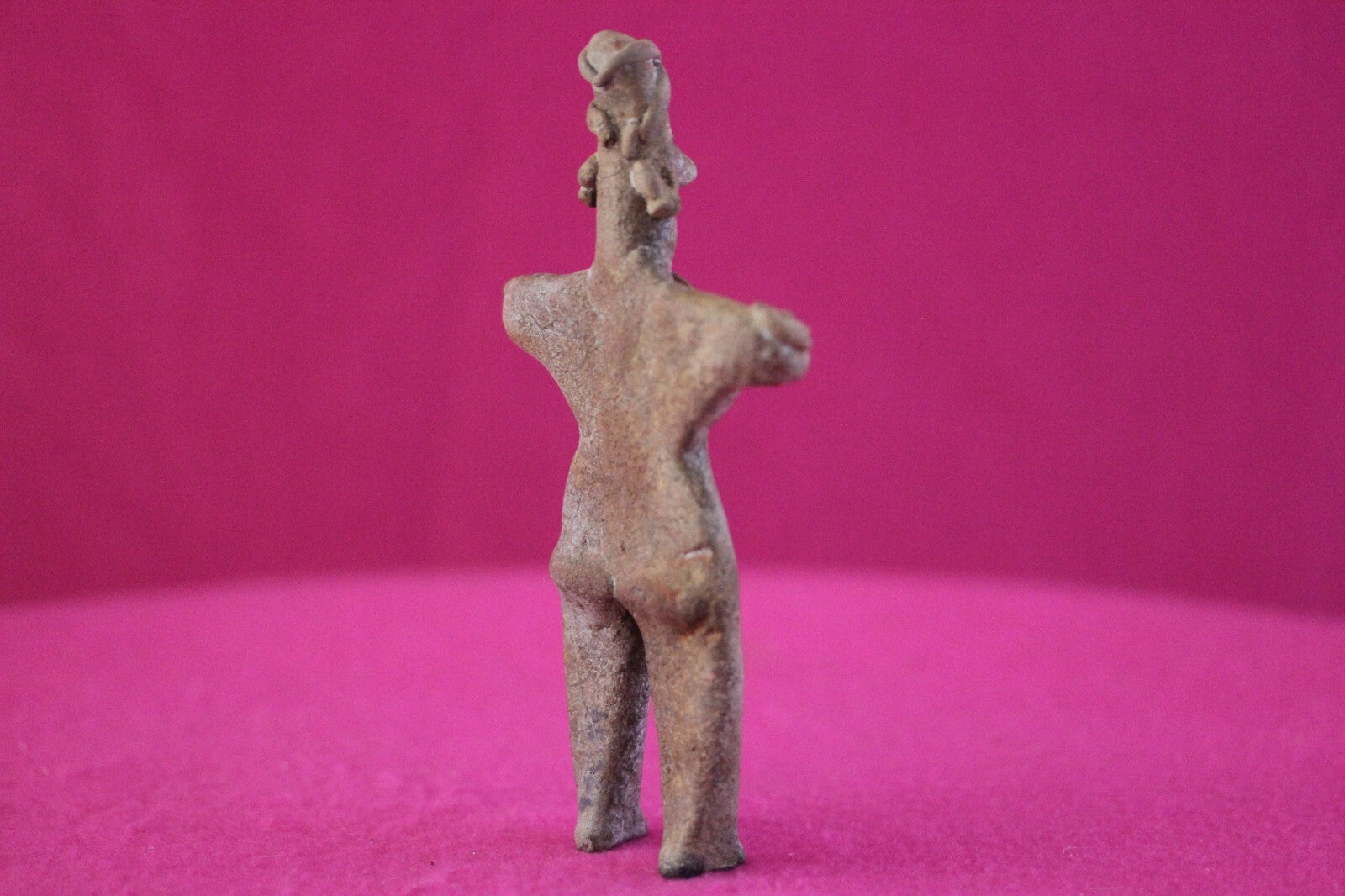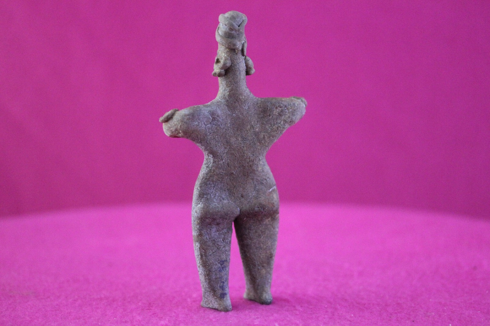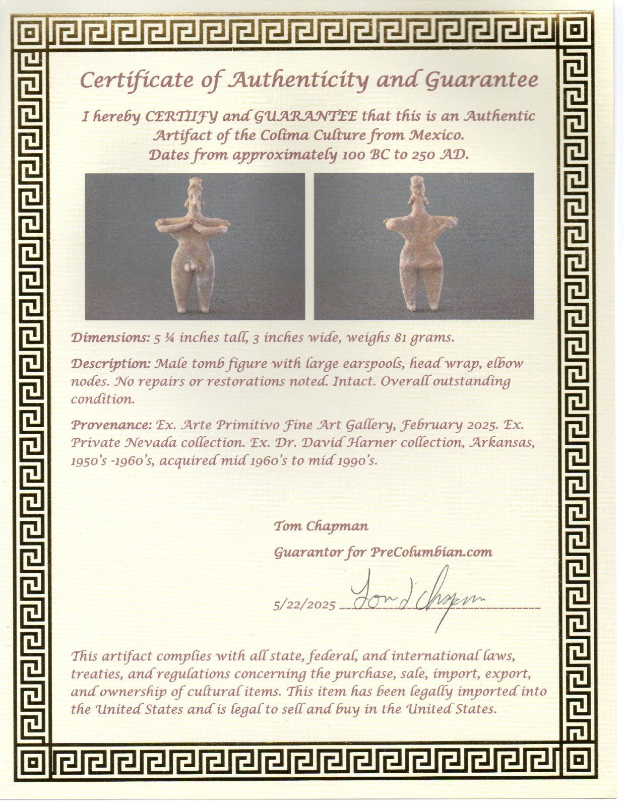 Dimensions: 5 ¼ inches tall, 3 inches wide, weighs 81 grams.Description: Male tomb figure with large earspools, head wrap, elbow nodes. No repairs or restorations noted. Intact. Overall outstanding condition.Provenance: Ex. Arte Primitivo Fine Art Gallery, February 2025. Ex. Private Nevada collection. Ex. Dr. David Harner collection, Arkansas, 1950’s -1960’s, acquired mid 1960’s to mid 1990’s.