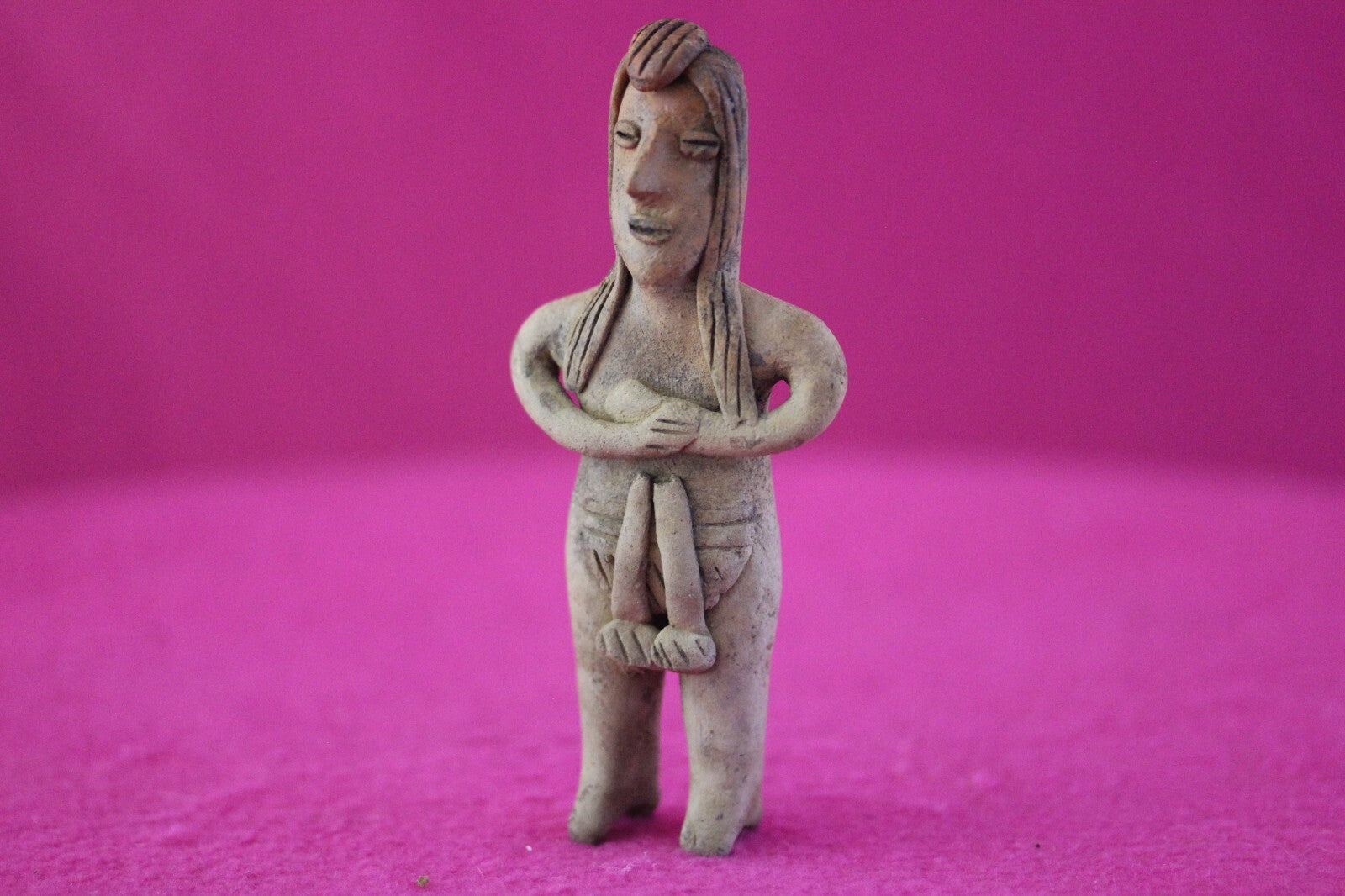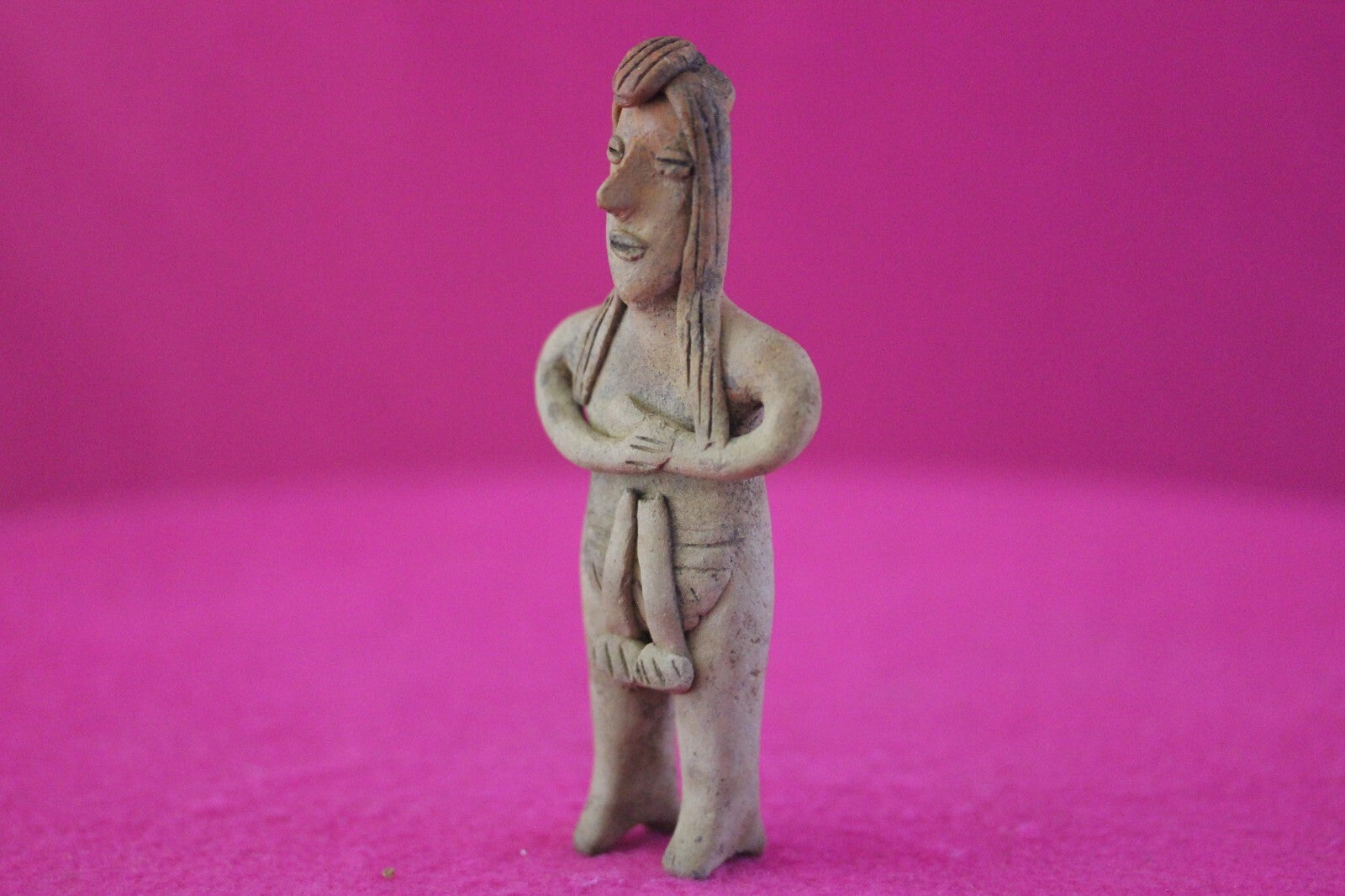 Dimensions: 4 ¼ inches tall, 2 inches wide, weighs 41 grams.Description: Female tomb figure with long hair, wearing a loin cloth. No repairs or restorations. Intact. Overall outstanding condition.Manganese Dioxide Reactivity Test Results: A solution of laboratory grade 40% hydrogen peroxide was applied to multiple manganese blooms that resulted in a strong chemical reaction indicating approximately 2000 years of underground burial.Provenance: Ex. Arte Primitivo Fine Art Gallery, February 2025. Ex. Private Nevada collection. Ex. Dr. David Harner collection, Arkansas, 1950’s -1960’s, acquired mid 1960’s to mid 1990’s.