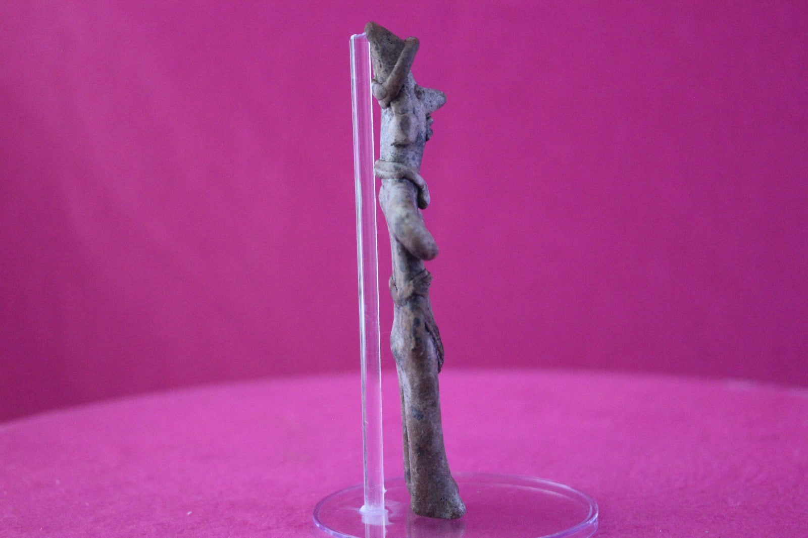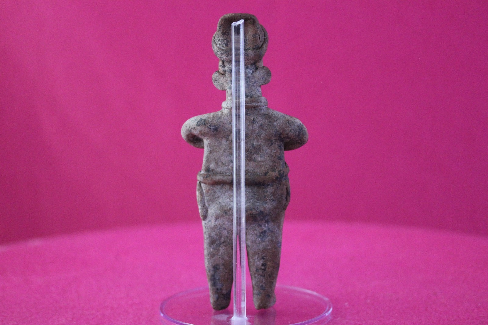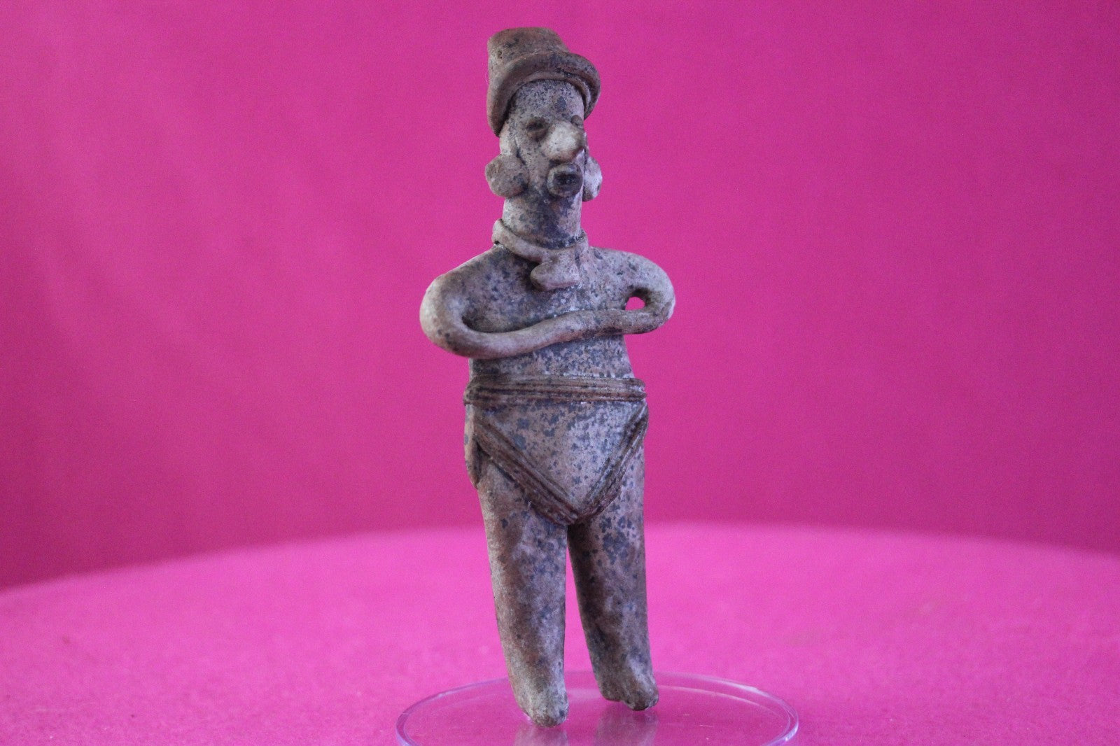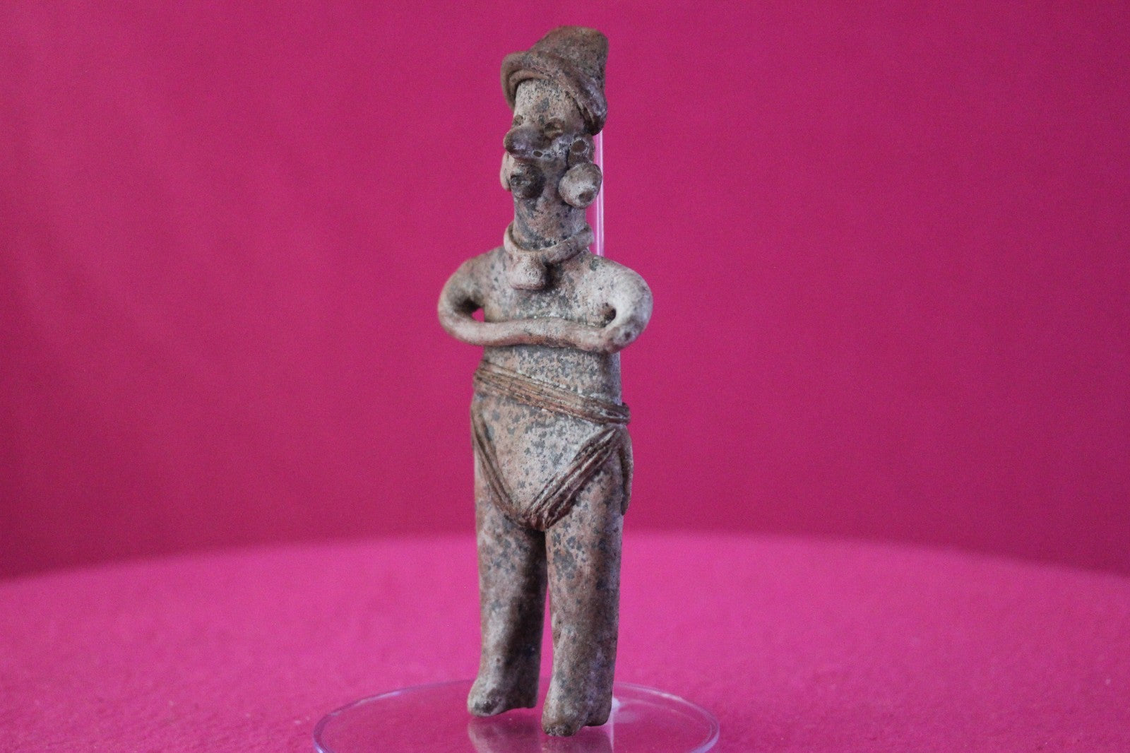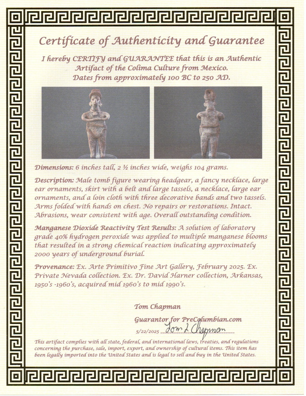 Dimensions: 6 inches tall, 2 ½ inches wide, weighs 104 grams.Description: Male tomb figure wearing headgear, a fancy necklace, large ear ornaments, skirt with a belt and large tassels, a necklace, large ear ornaments, and a loin cloth with three decorative bands and two tassels. Arms folded with hands on chest. No repairs or restorations. Intact. Abrasions, wear consistent with age. Overall outstanding condition.Manganese Dioxide Reactivity Test Results: A solution of laboratory grade 40% hydrogen peroxide was applied to multiple manganese blooms that resulted in a strong chemical reaction indicating approximately 2000 years of underground burial.Provenance: Ex. Arte Primitivo Fine Art Gallery, February 2025. Ex. Private Nevada collection. Ex. Dr. David Harner collection, Arkansas, 1950’s -1960’s, acquired mid 1960’s to mid 1990’s.