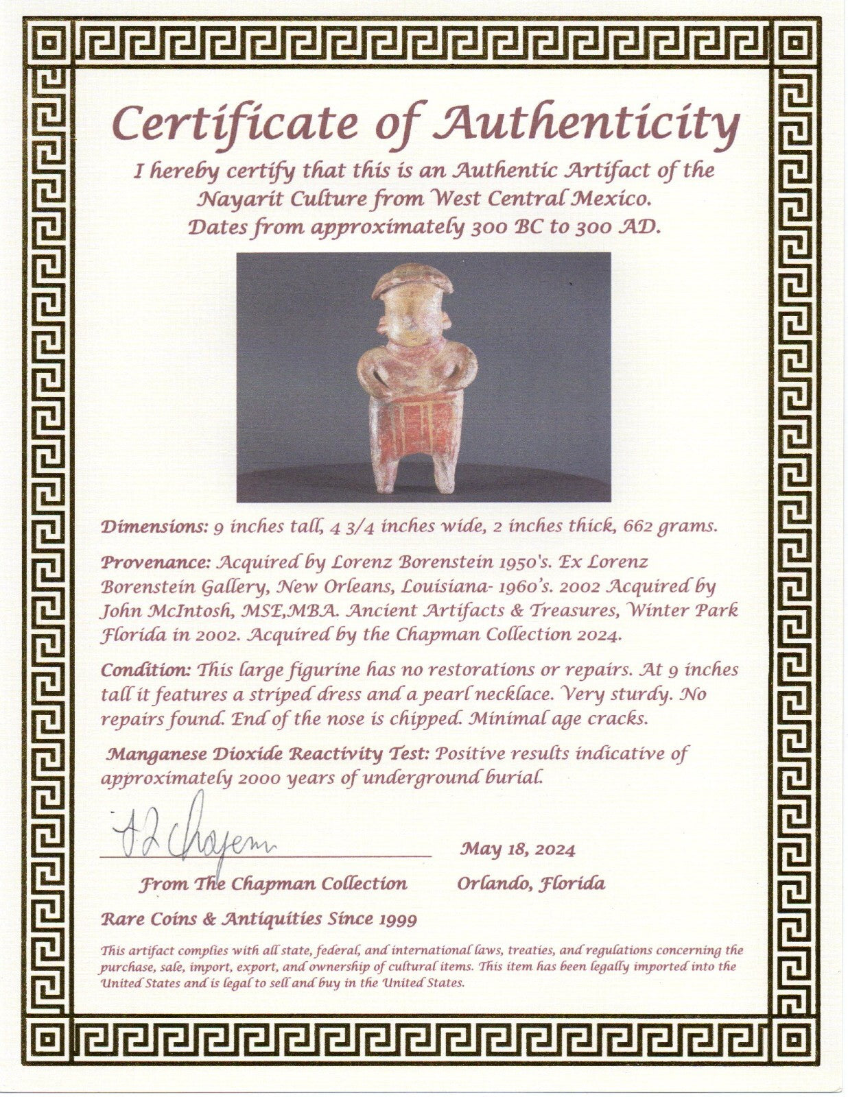 This large figurine has no restorations or repairs. At 9 inches tall it features a stripped dress and a pearl like necklace. Very sturdy. No repairs found. End of the nose is chipped. Minimal age cracks.