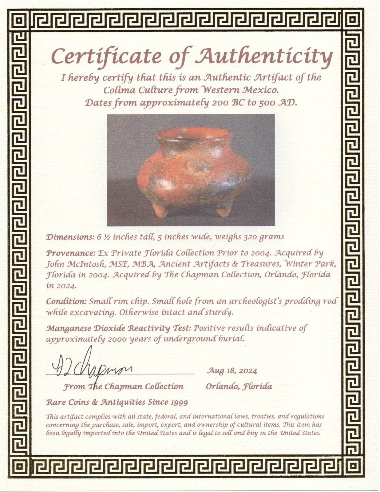 Provenance: Ex Private Florida Collection Prior to 2004. Acquired by John McIntosh, MSE, MBA, Ancient Artifacts & Treasures, Winter Park, Florida in 2004. Acquired by The Chapman Collection, Orlando, Florida in 2024.Condition: Small rim chip. Small hole from an archeologist’s prodding rod while excavating. Otherwise intact and sturdy.Manganese Dioxide Reactivity Test: Positive results indicative of approximately 2000 years of underground burial.