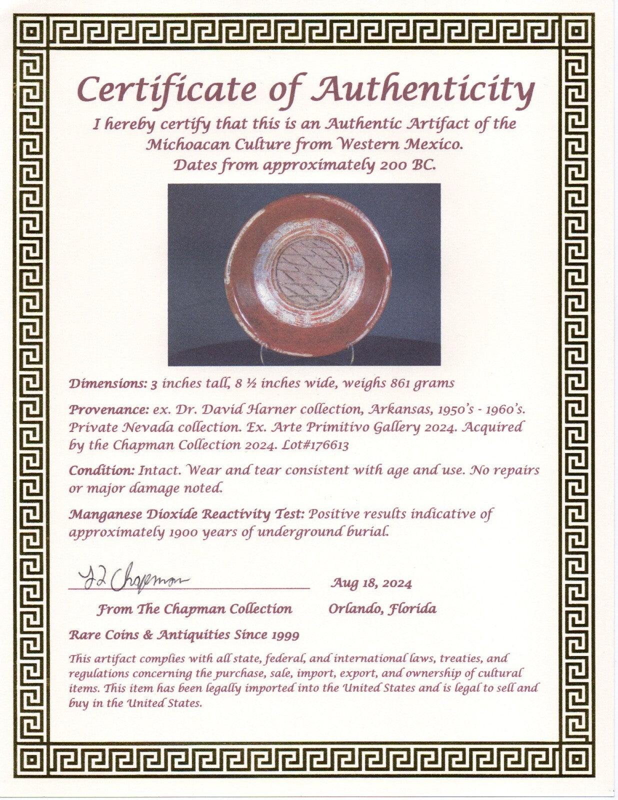 Pre Columbian Artifact Authentic Tripod Bowl Michoacan Ex Arte Primitivo COA T34